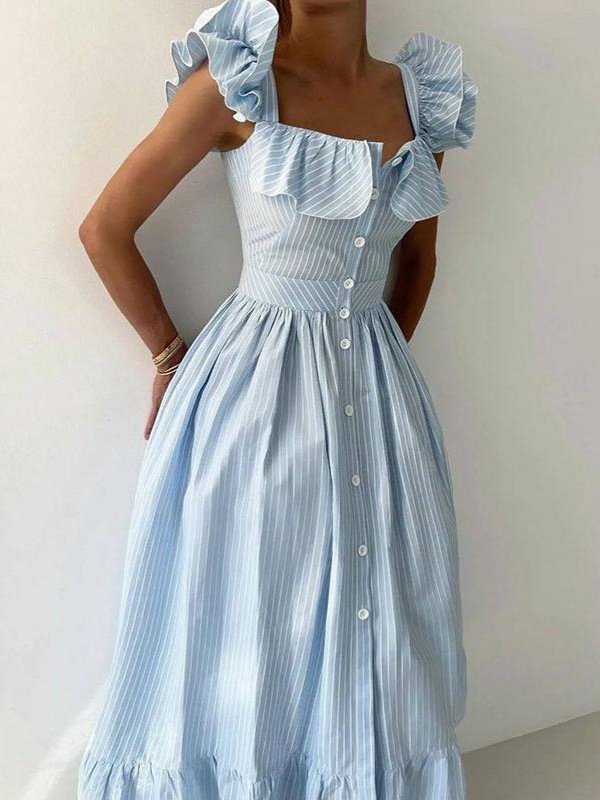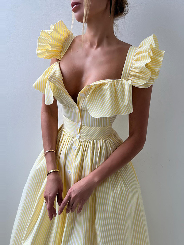 플라잉 슬리브 스트라이프 러플 롱 스커트 유럽과 미국 국경 간 2025 여름 신작 캐주얼 스타일 허리 드레스