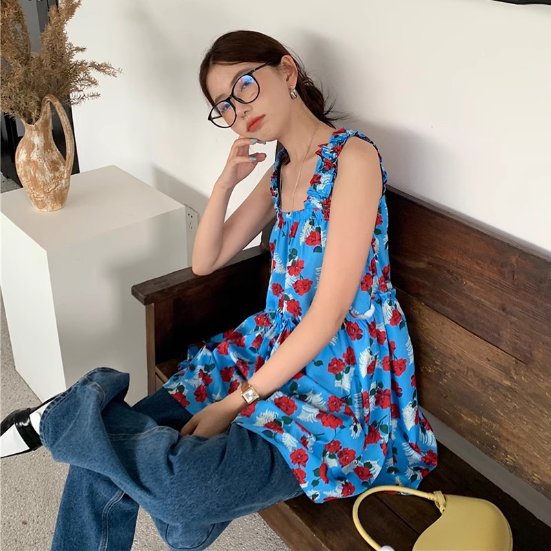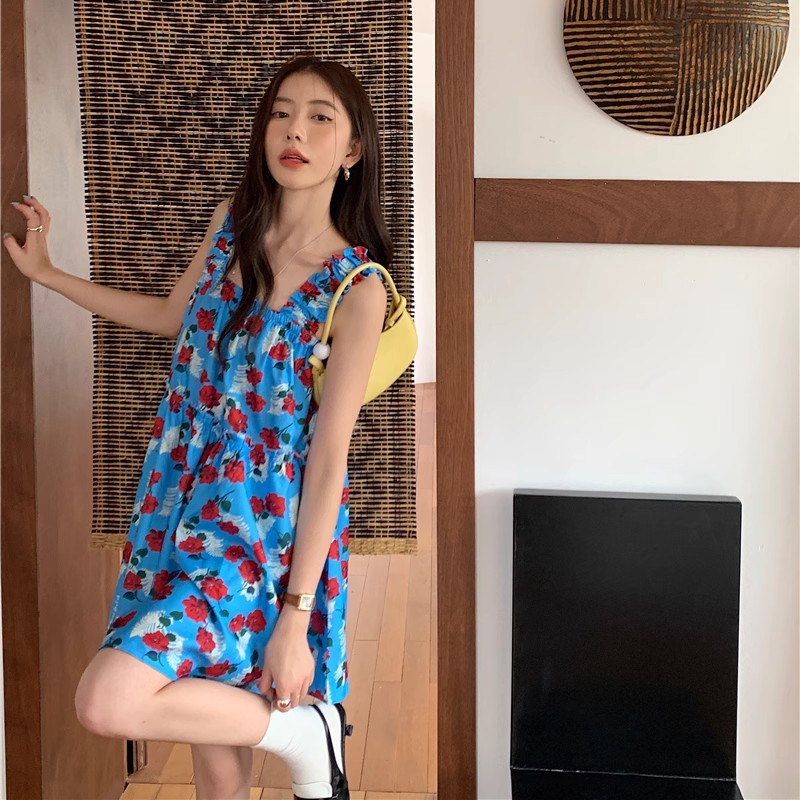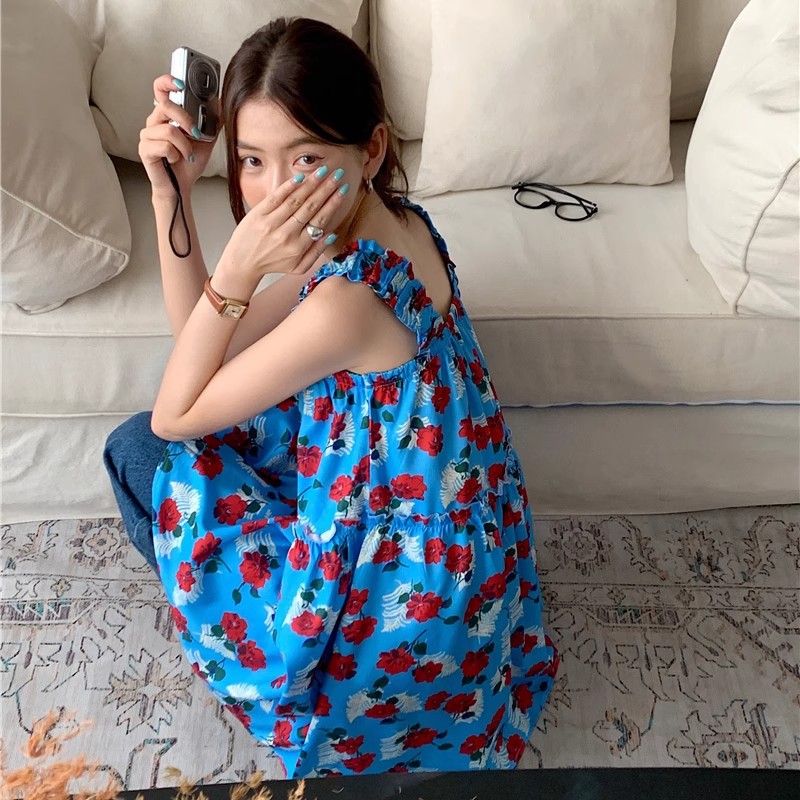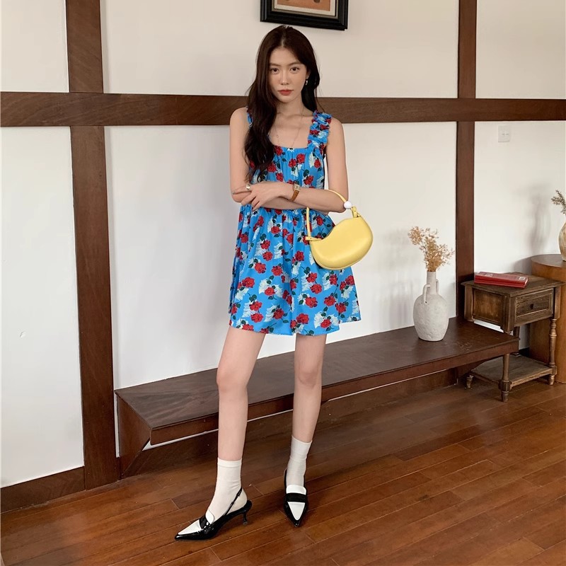 드레스 짧은 치마 도파민 블루 꽃 서스펜더 드레스 여성 여름 해변 휴가 해변 드레스 작은 여성