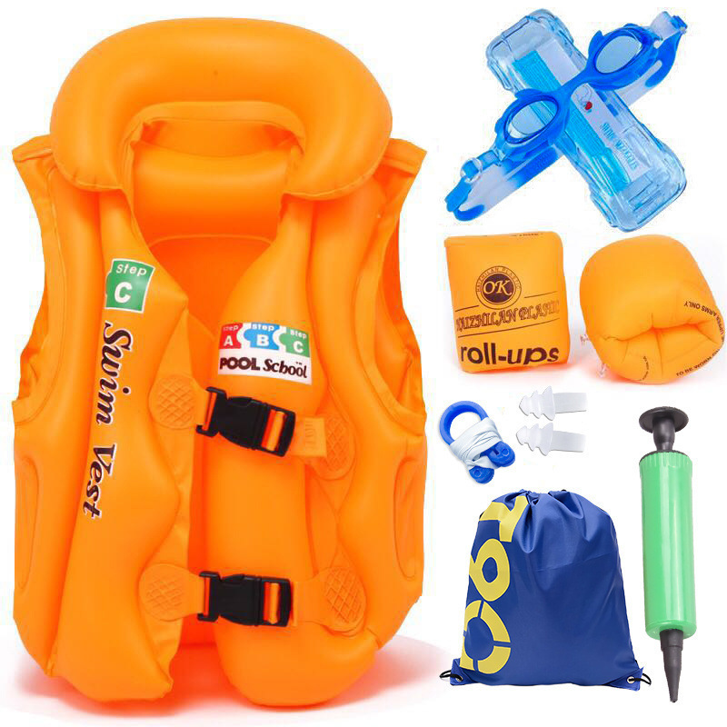 **주황색 구명조끼 + 수영고글 + 노즈클립 + 귀마개 + 펌프 - S 사이즈 5-12.5kg **