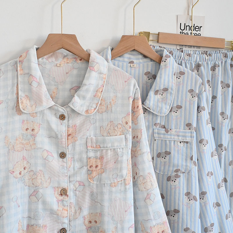 [맞춤제작] 여성용 순면 거즈 잠옷 봄여름 얇은 이중면 거즈 긴팔 긴바지 홈웨어 레이지 스타일
