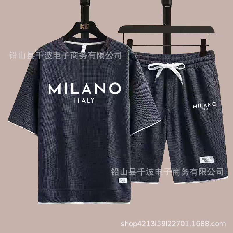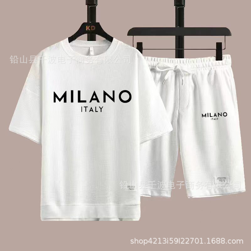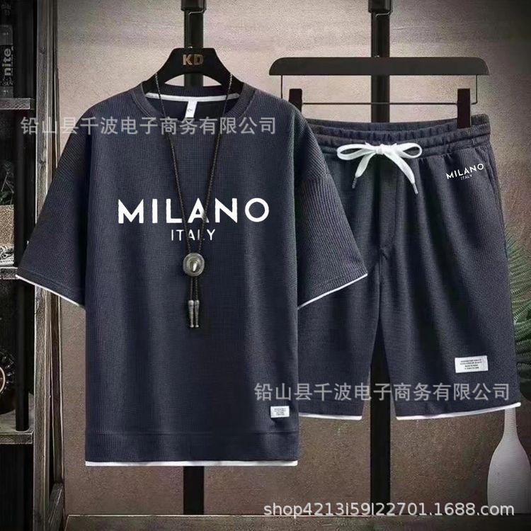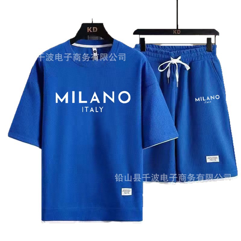 크로스보더 와플 티셔츠 남성 여름 패션 루즈핏 대형 사이즈 얇은 반팔 반바지 스포츠 세트 트렌디 핫템