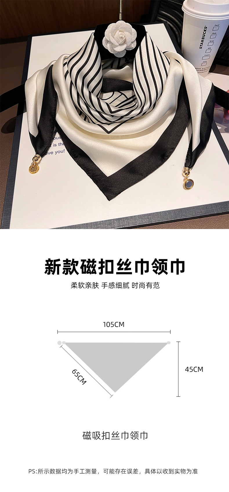 한국 스타일 스트라이프 스몰 스퀘어 스카프, 분위기 있는 실크 스카프, 여성용 스퀘어 스카프, 마그네틱 버클 삼각 스카프, 셔츠 넥 워머, 얇은 스카프, 넥 스카프
