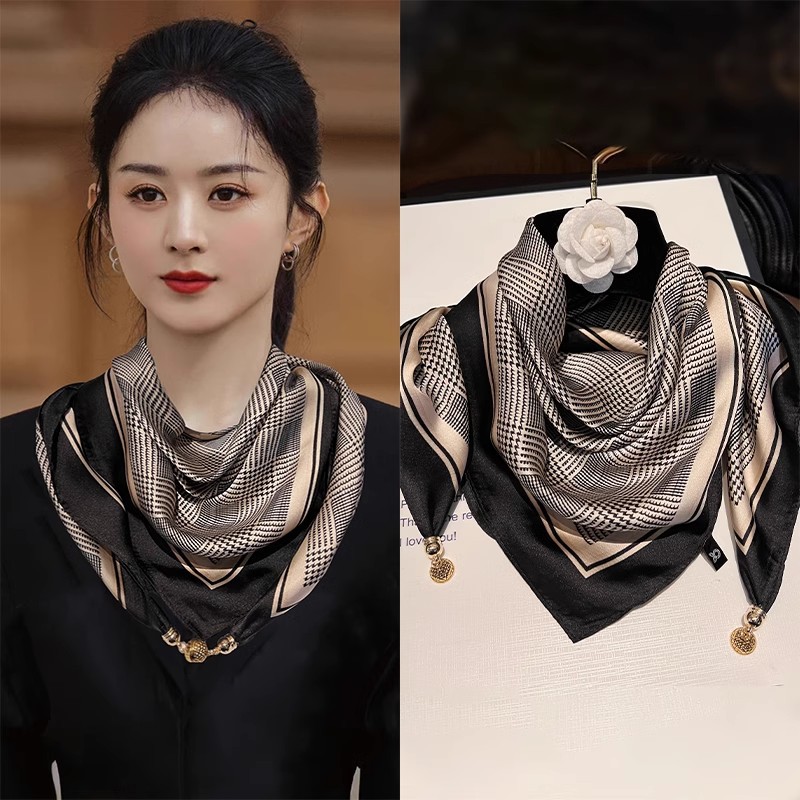 밀키 살구색 - 고급 체크 무늬 말 컷아웃 (65 모조 실크 자석 버클 스퀘어 스카프)
