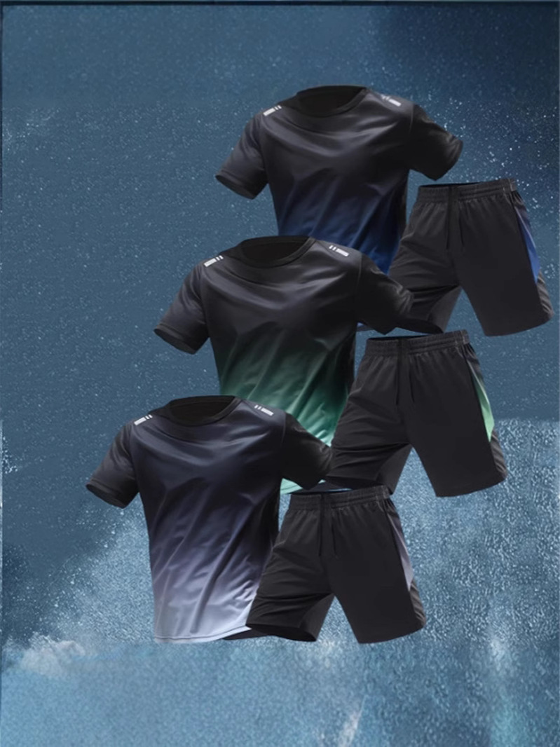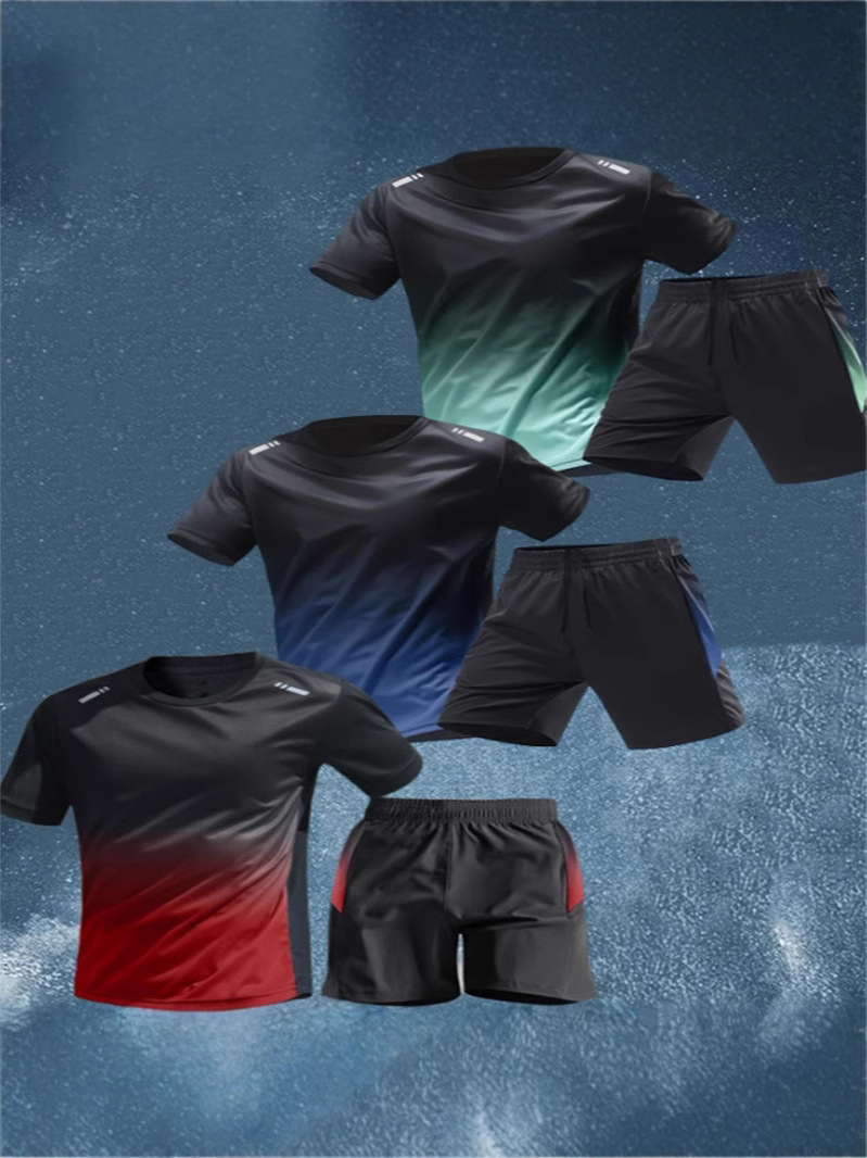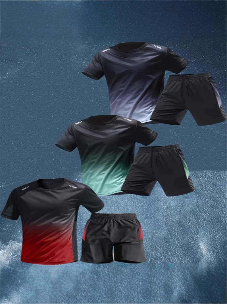 독점] 스포츠 슈트 남성용 속건성 반팔 티셔츠 얇은 피트니스 러닝 배드민턴 메쉬 반바지 트레이닝복