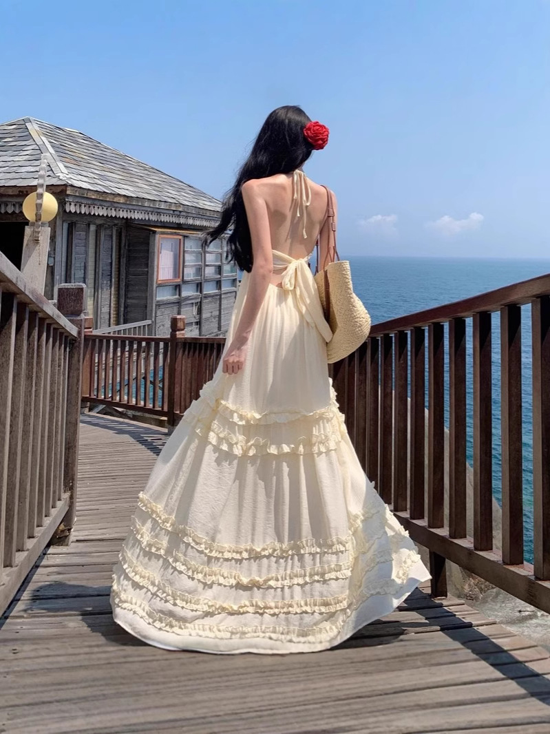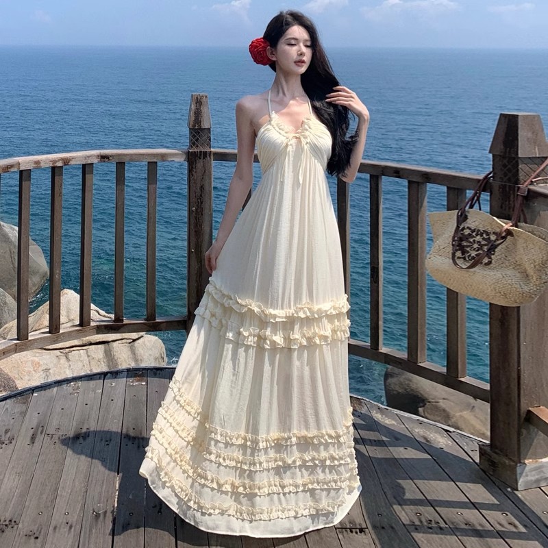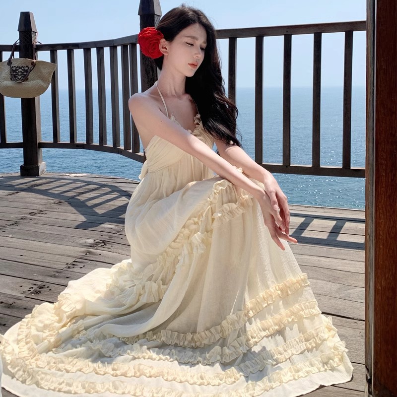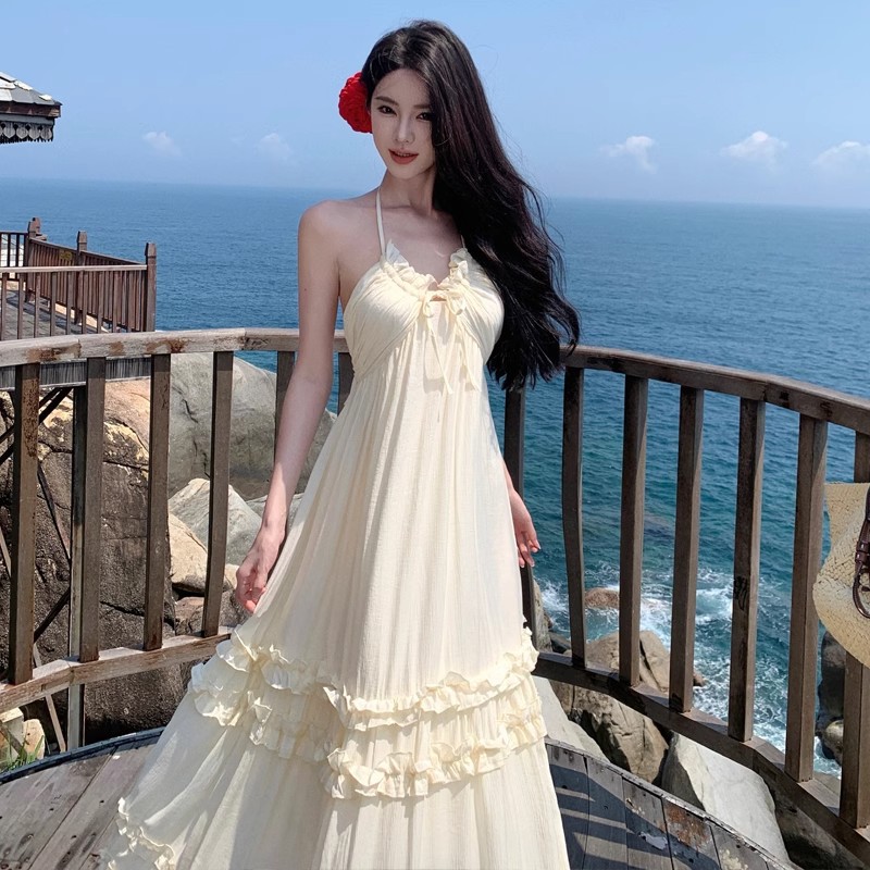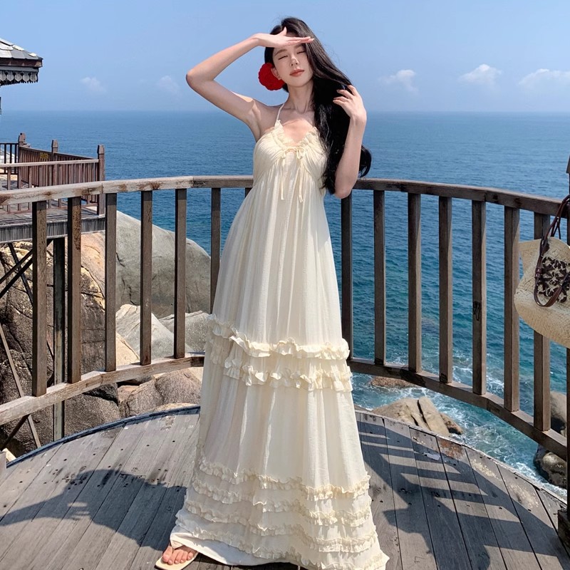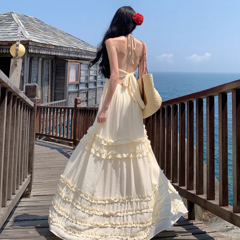 해변 해변 스타일 드레스 서스펜더 휴가 롱 스커트 베이지 섹시한 백리스 요정 여름 바닥 길이 분위기