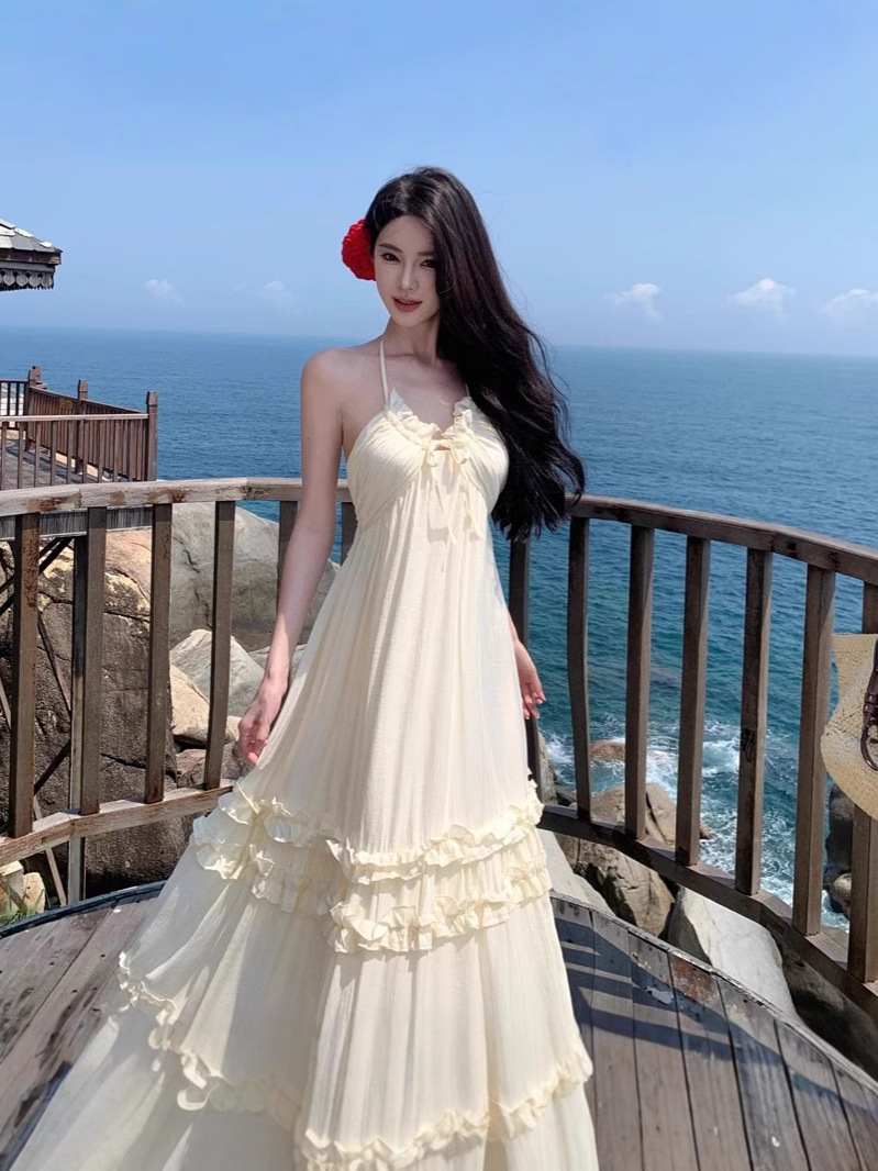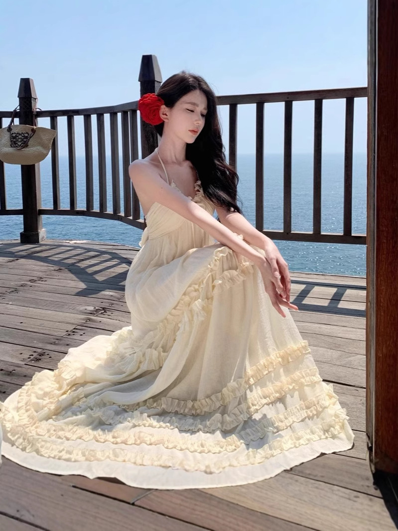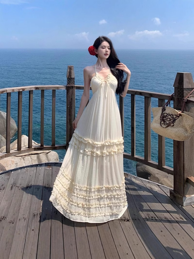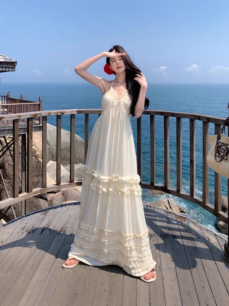 해변 해변 스타일 드레스 서스펜더 휴가 롱 스커트 베이지 섹시한 백리스 요정 여름 바닥 길이 분위기