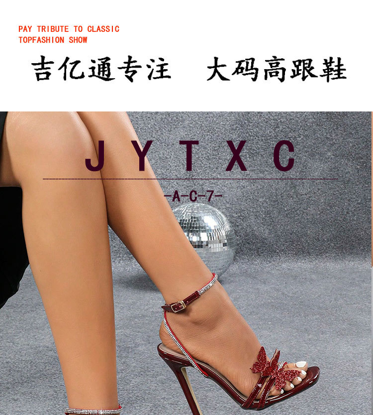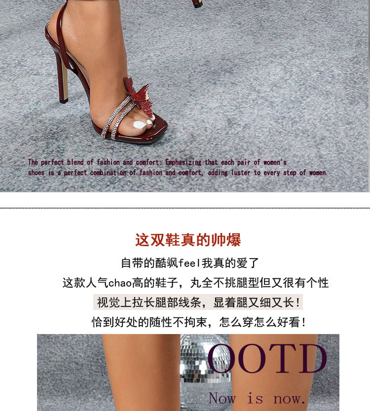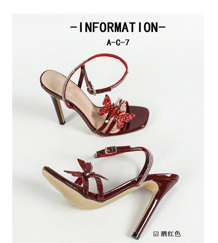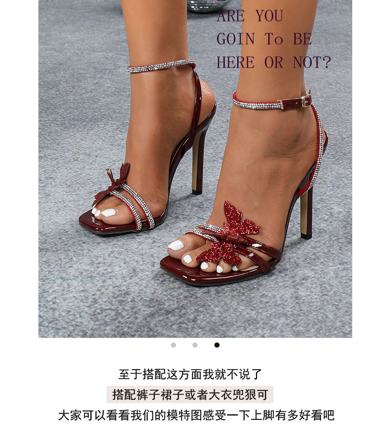해외 무역 유럽 및 미국 여성용 나비 모양 라인스톤 크로스 스트랩 스퀘어토 스틸레토 샌들 파티용 버건디 하이힐