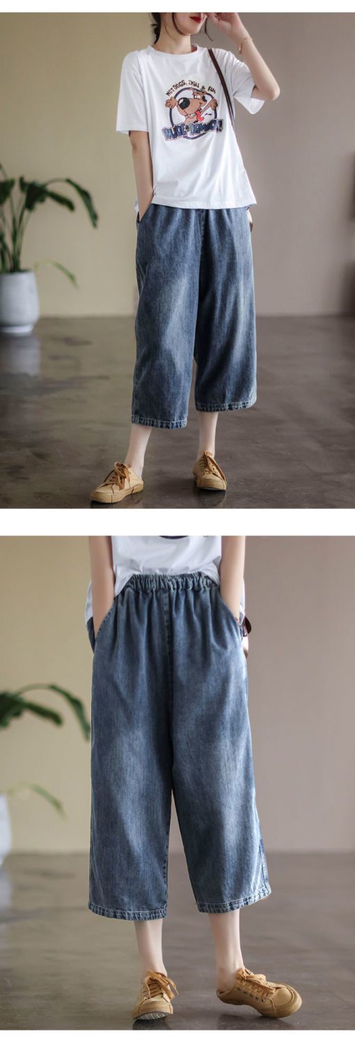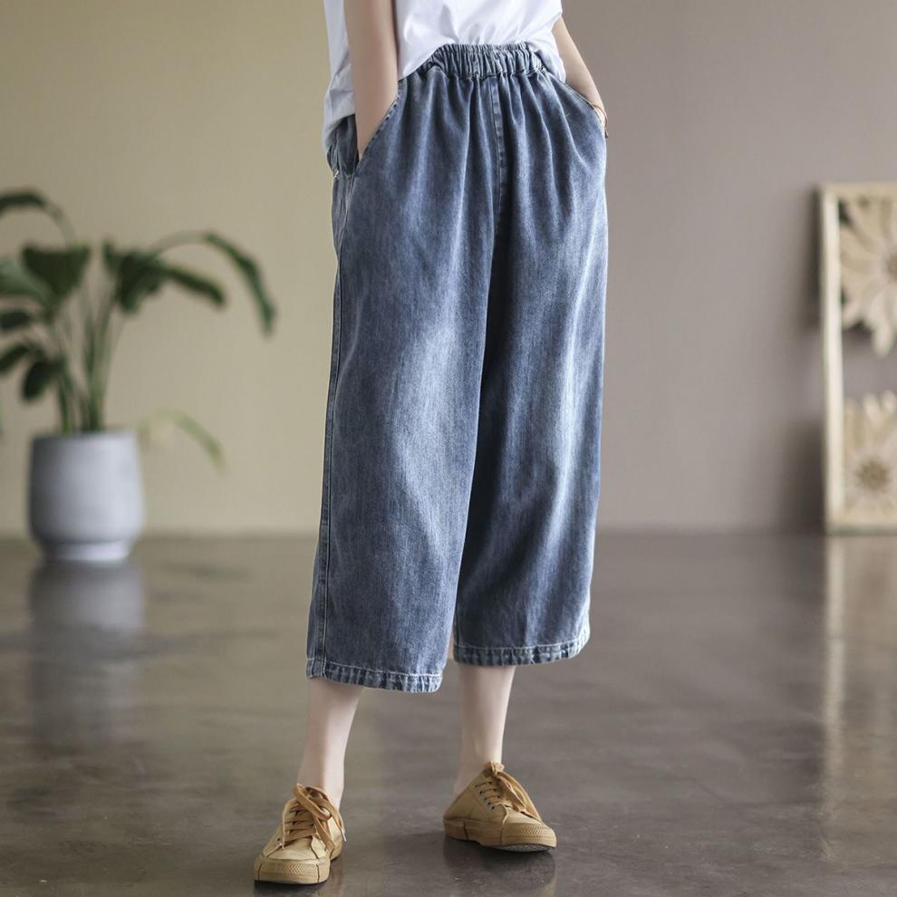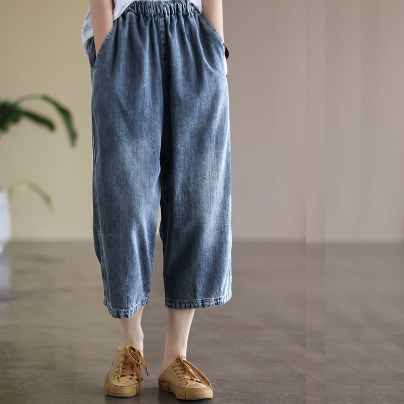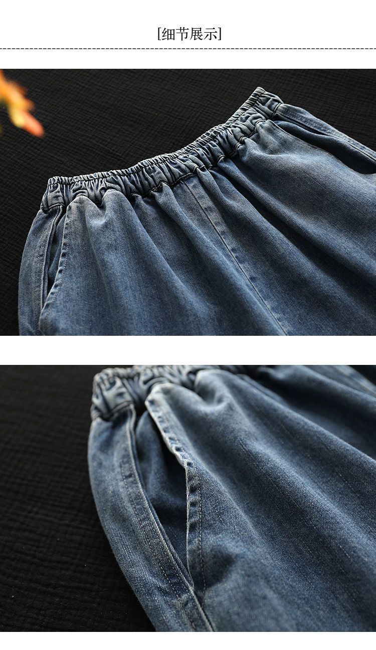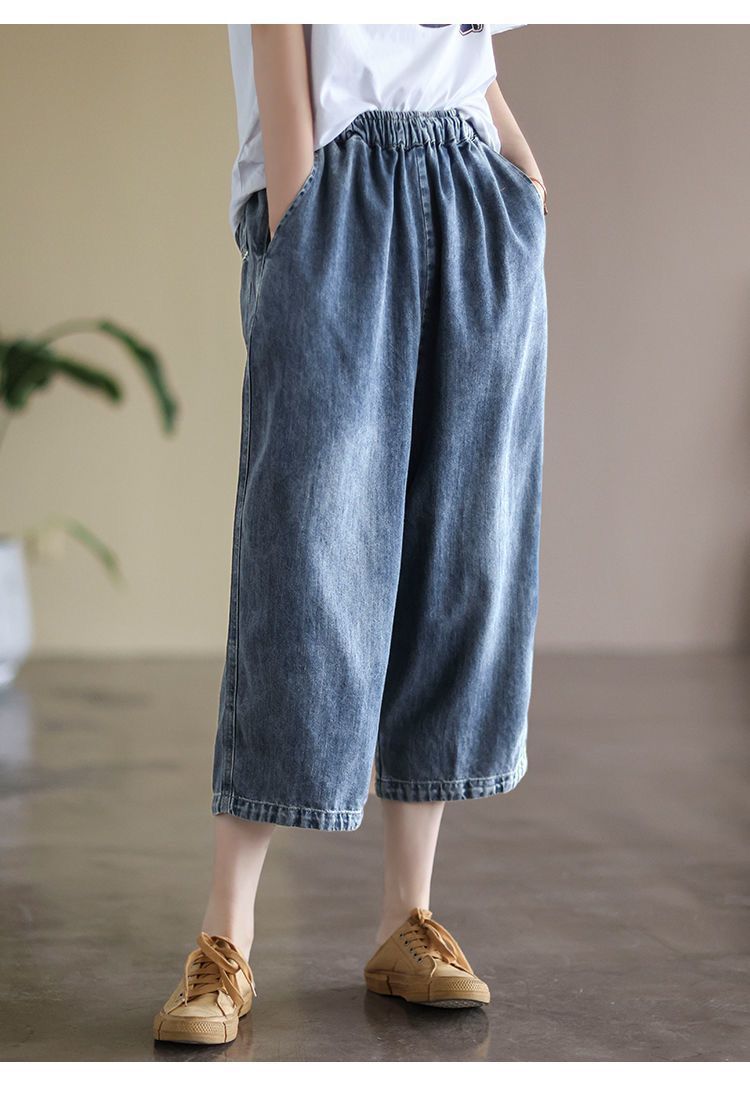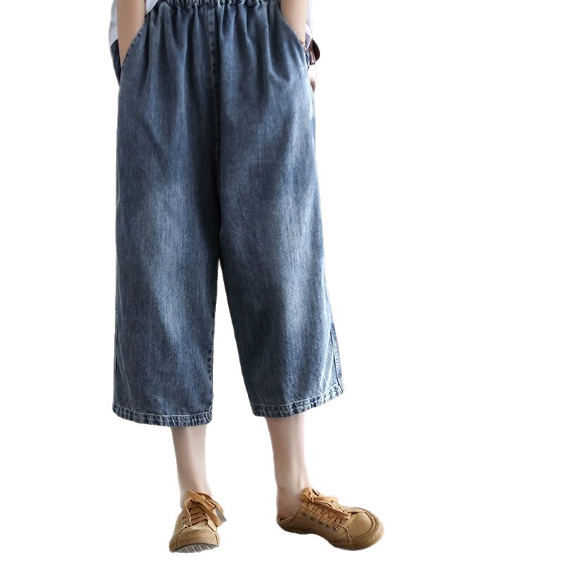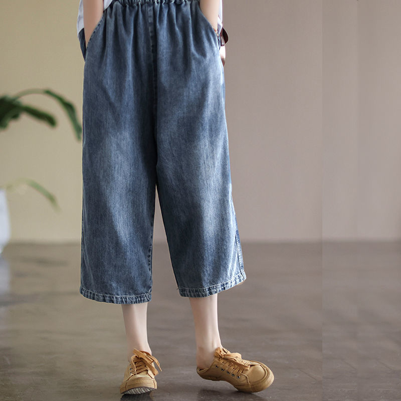여성을위한 얇은 데님 7부 와이드 팬츠 2025 여름 새로운 느슨한 하이 웨이스트 슬리밍 탄성 허리 청바지