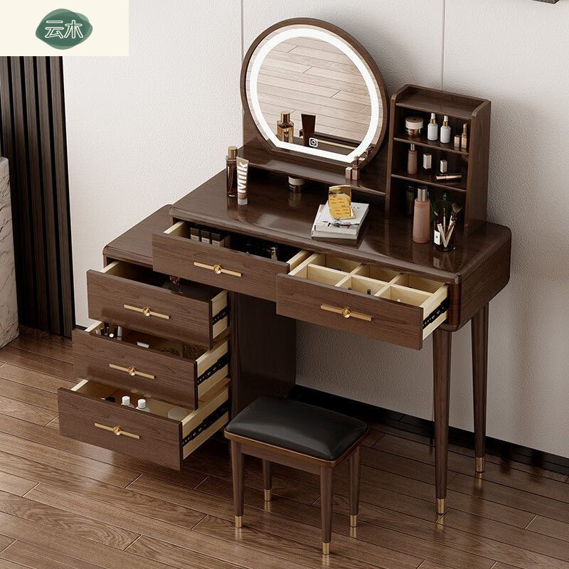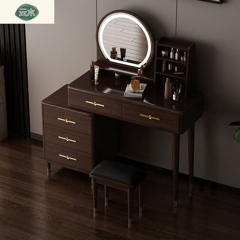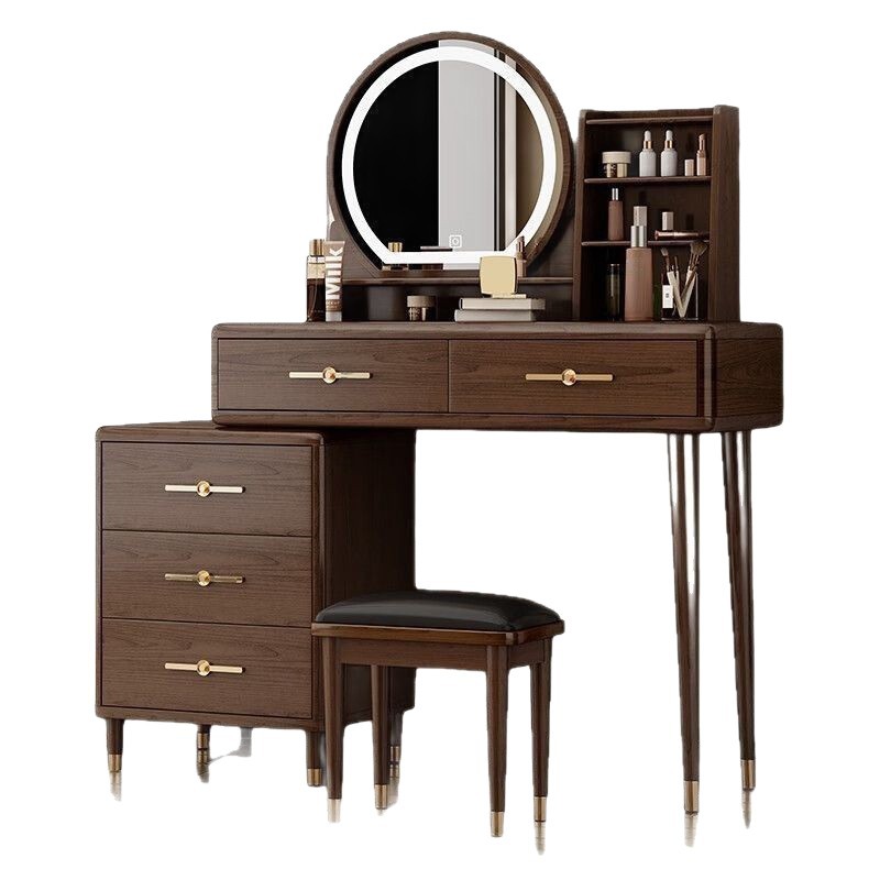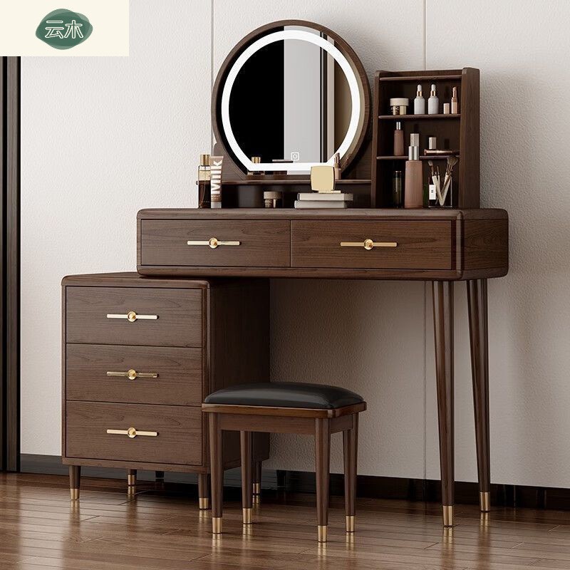 신중국풍 원목 화장대와 서랍장 일체형 화장대, 모던 심플 침실용 조명 수납장 화장대
