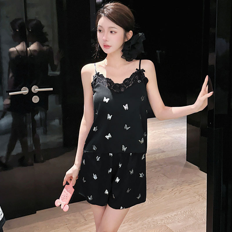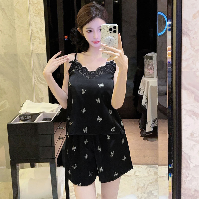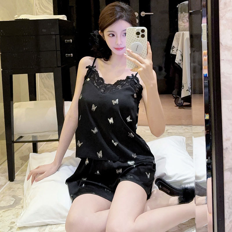 여성을위한 레이스 얼음 실크 잠옷 여름 2025 새로운 스타일 소녀 순수한 욕망 실크 서스펜더 반바지 홈웨어 세트