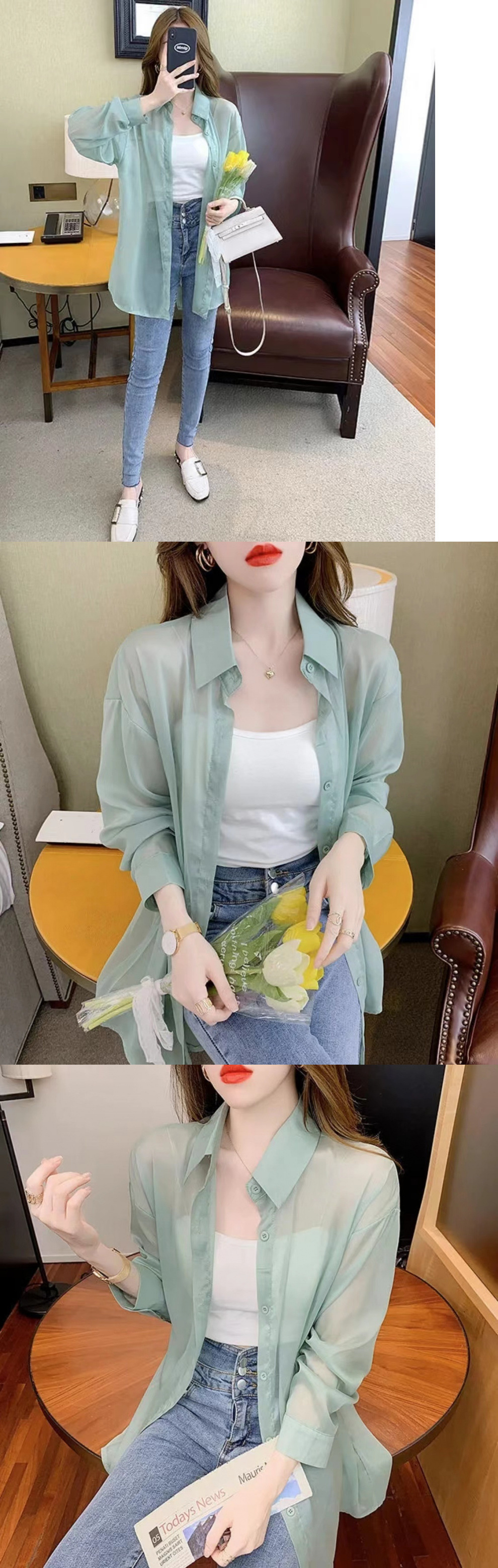 자외선 차단 의류, 얇은 여름 코트, 여성용 쉬폰 셔츠, 통기성이 좋은 새로운 중간 길이 상의, 얼음 실크 자외선 차단 의류 외부에 착용 가능