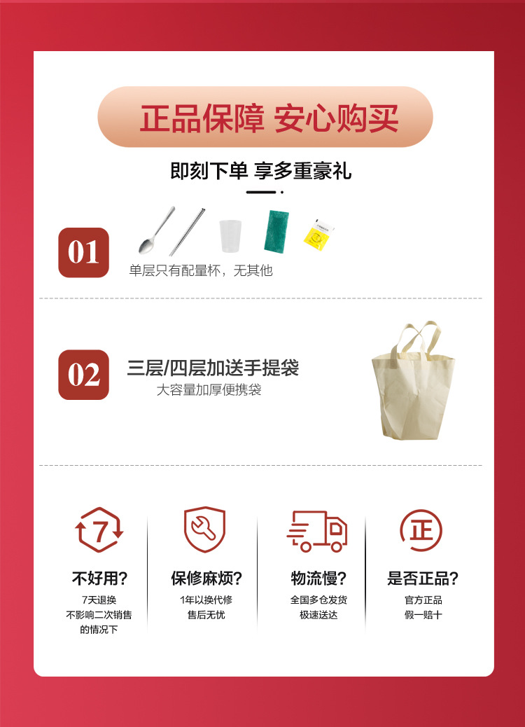 【配件说明】彩盒,分体式电源线,量杯,说明书,百洁布,除垢剂。三层起的多配一个手提袋。