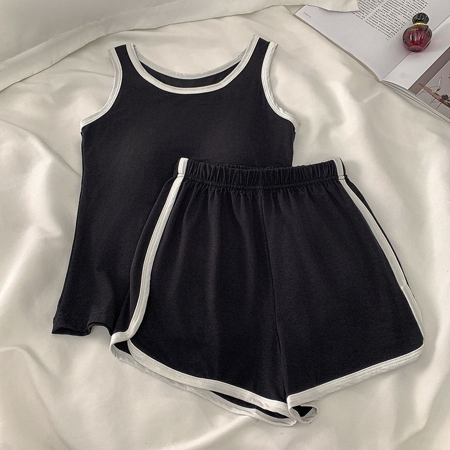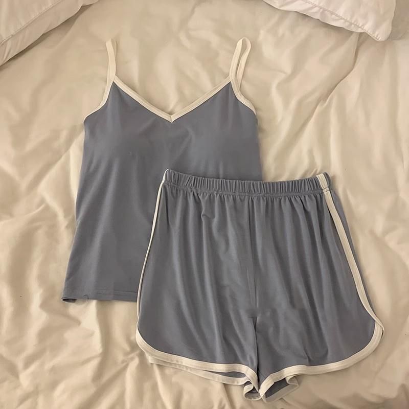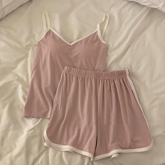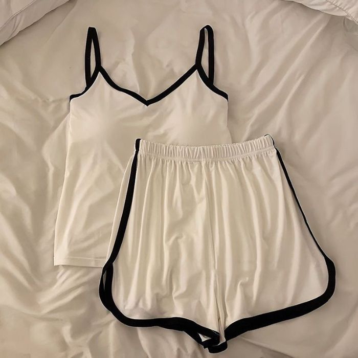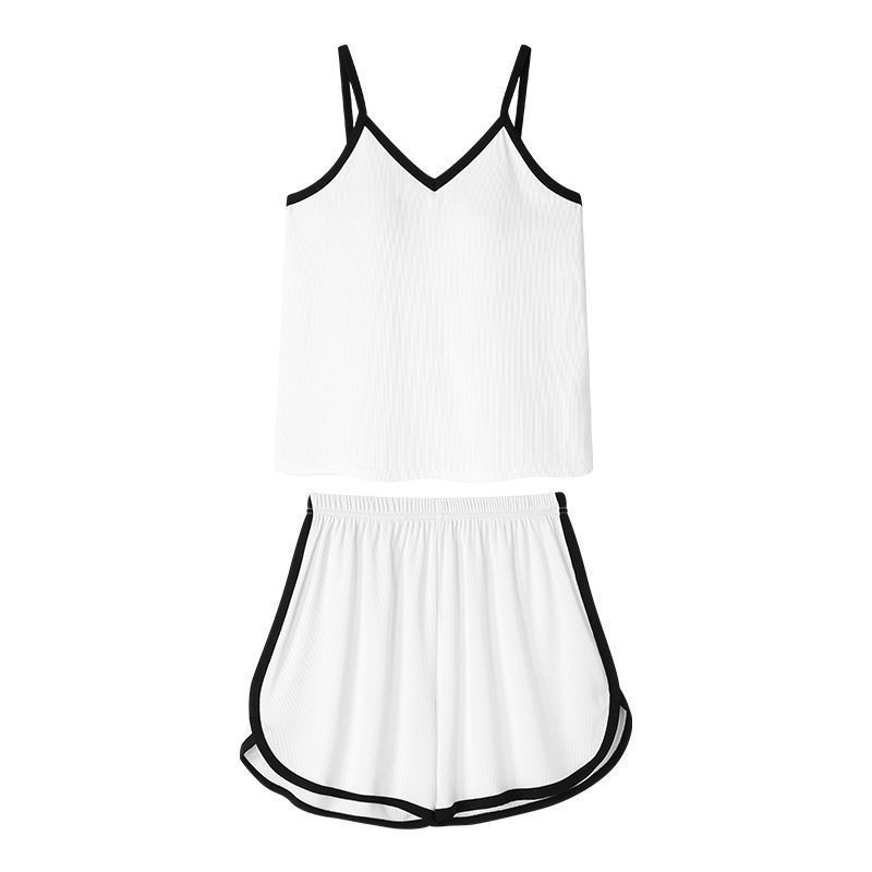 여성용 가슴 패드가 있는 크로스보더 도매 여름 캐미솔 반바지 스포츠 잠옷, 아이스 실크 스레드 솔리드 컬러 웨어러블 슈트