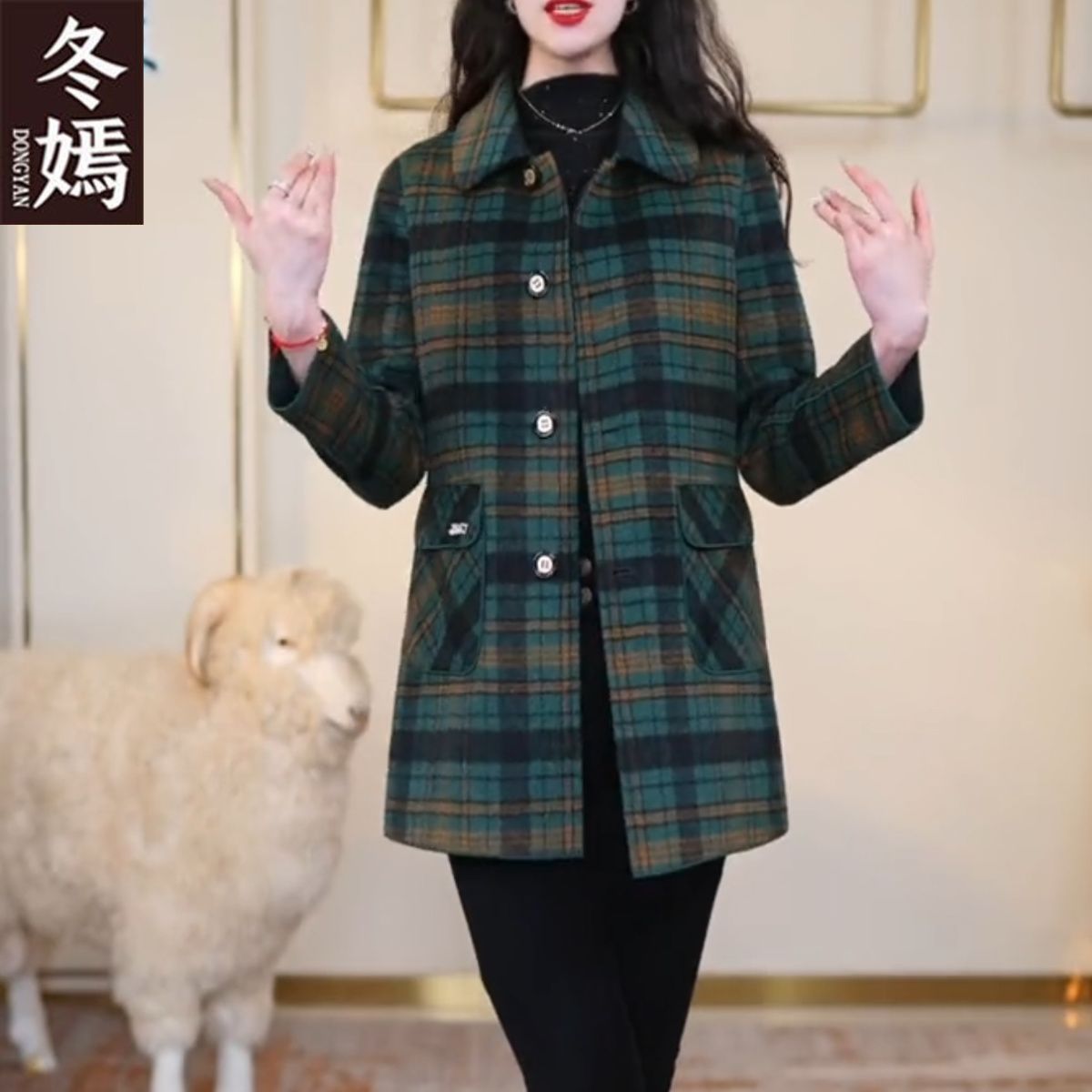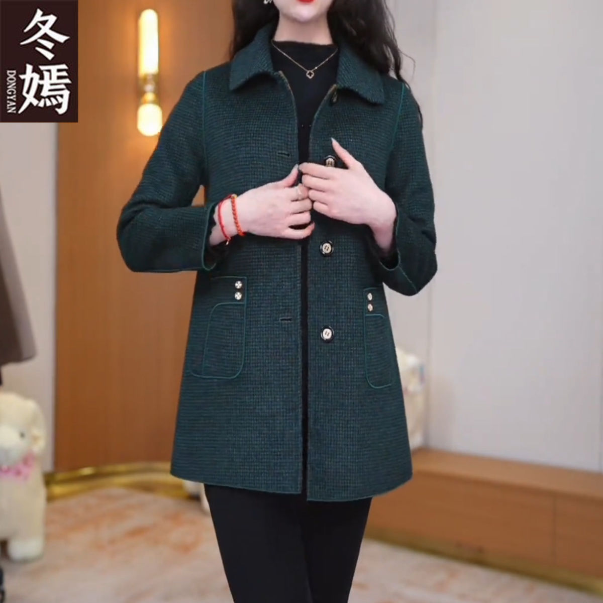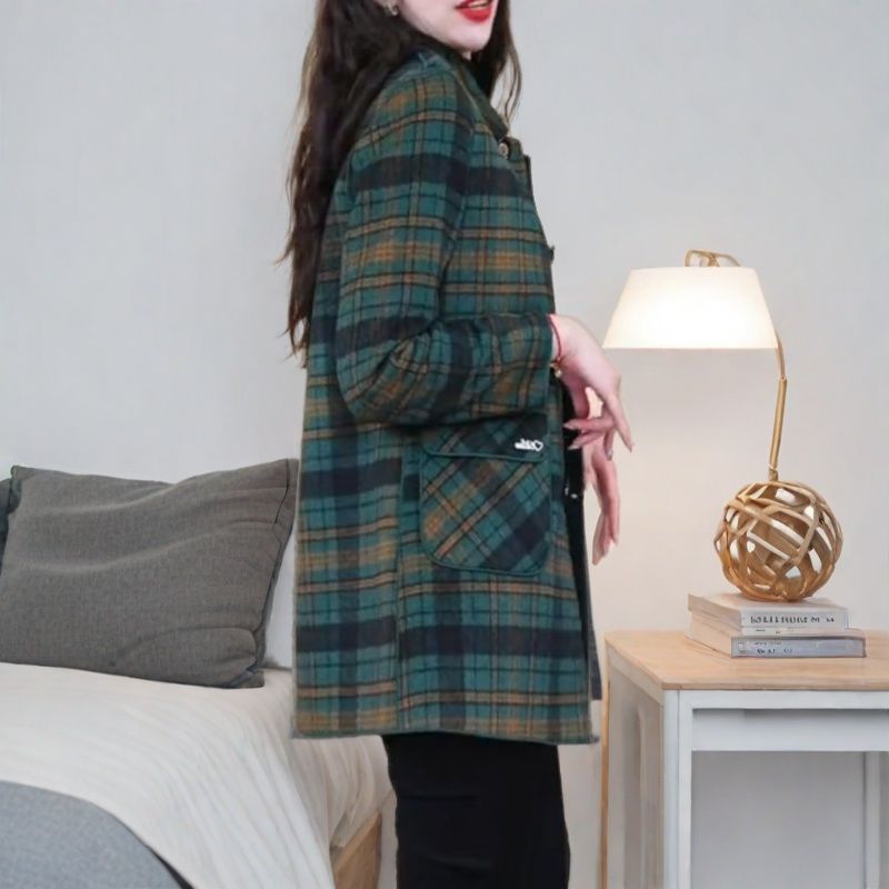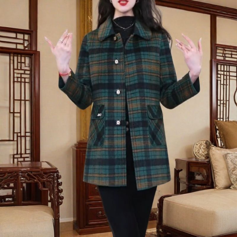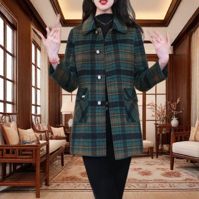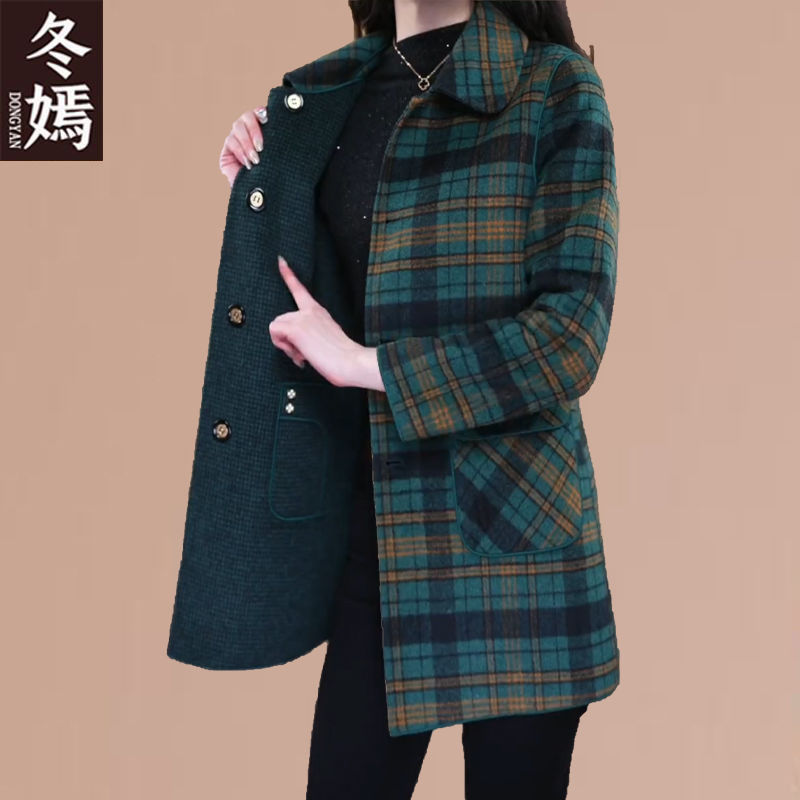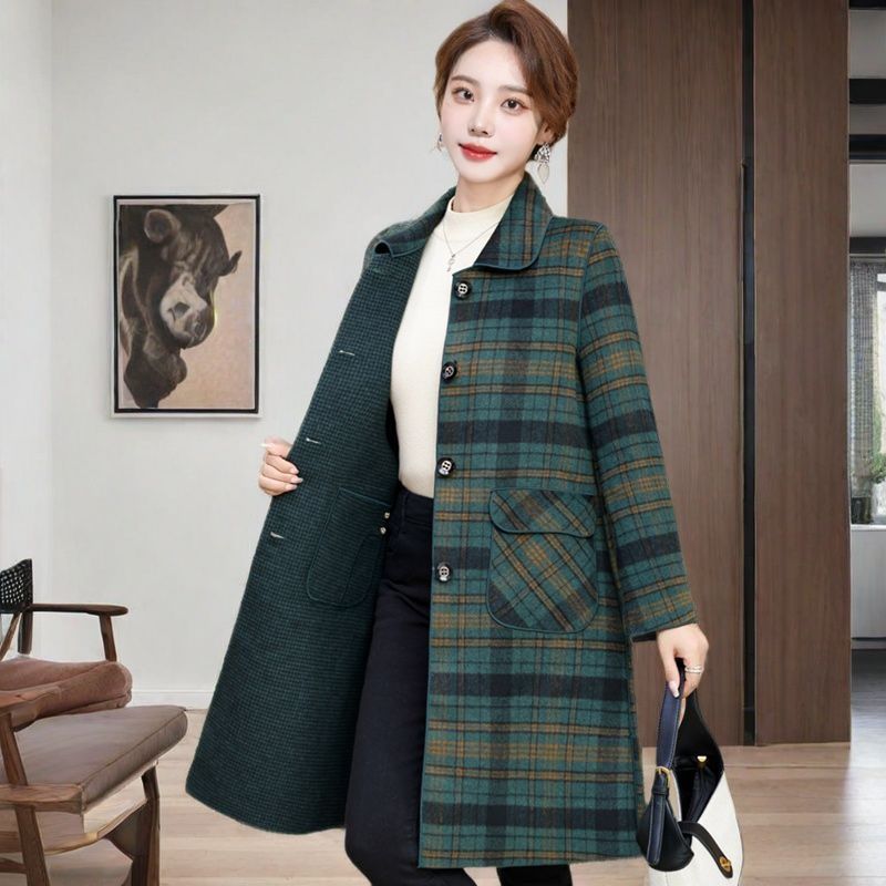 양면 격자 무늬 코트 가을, 겨울 중간 길이 캐시미어 새 양모 플러스 사이즈 슬림 중년 어머니 코트 패션