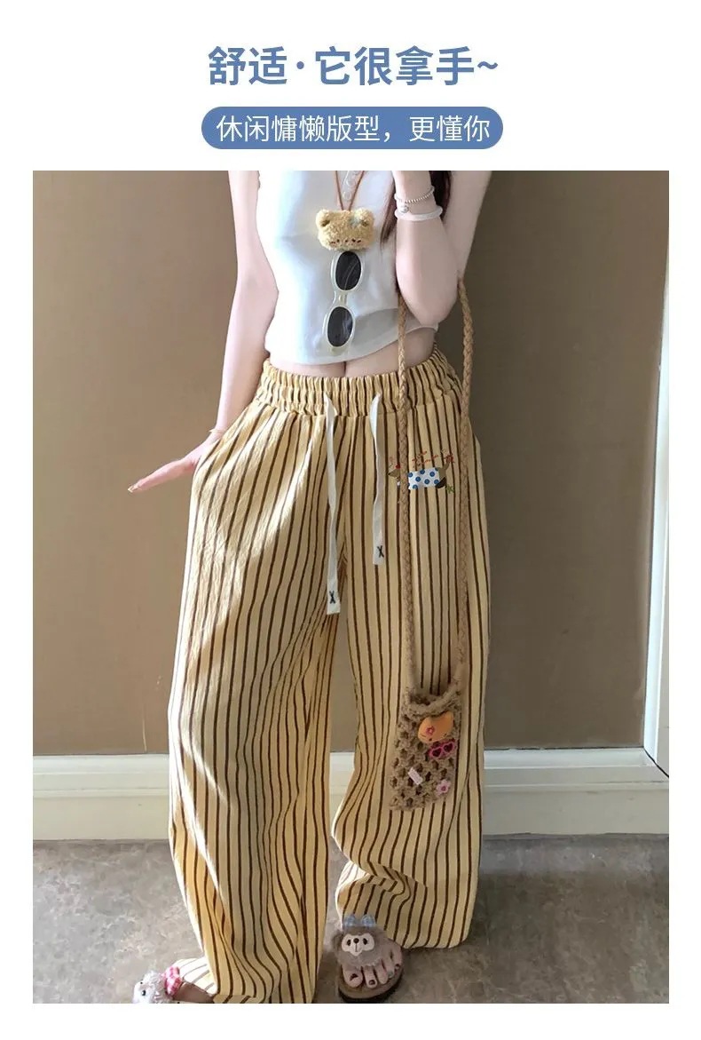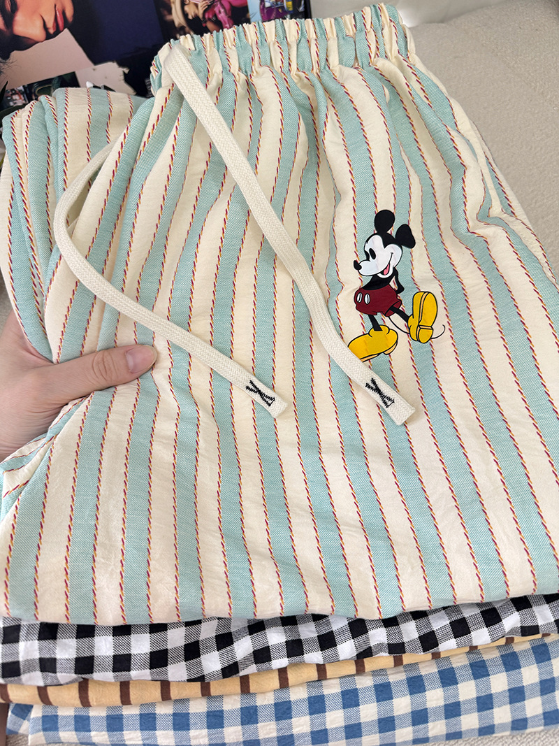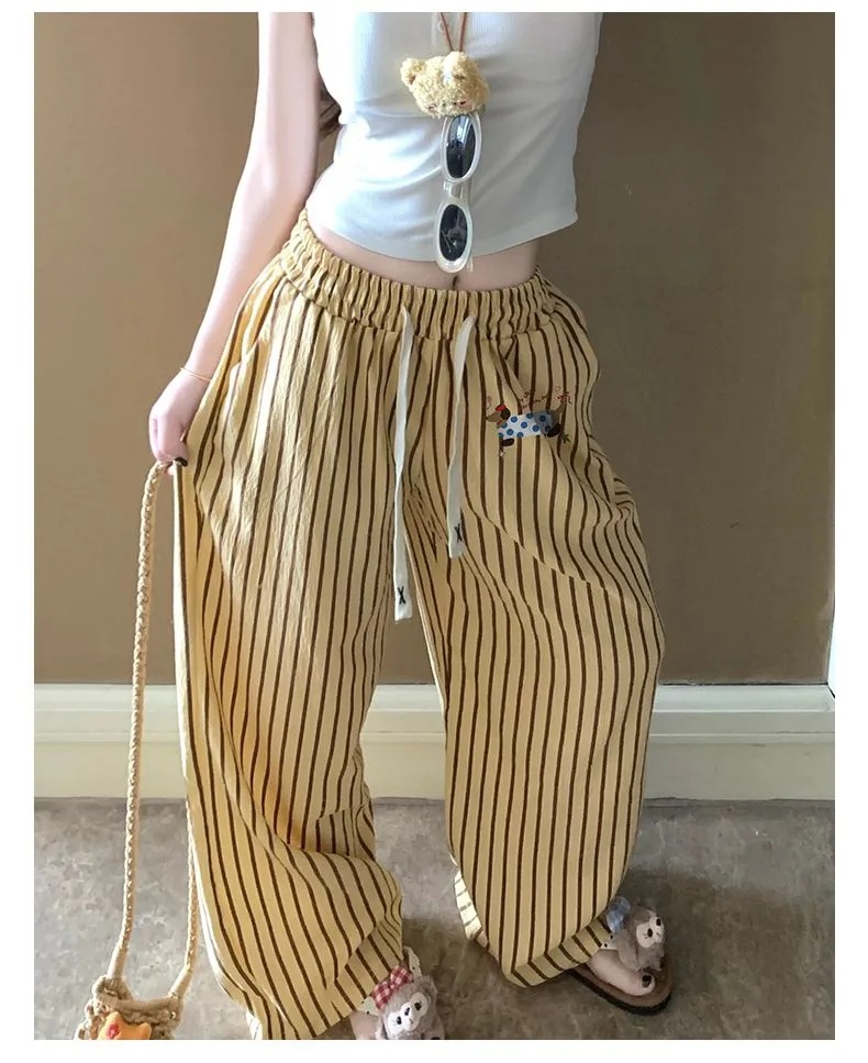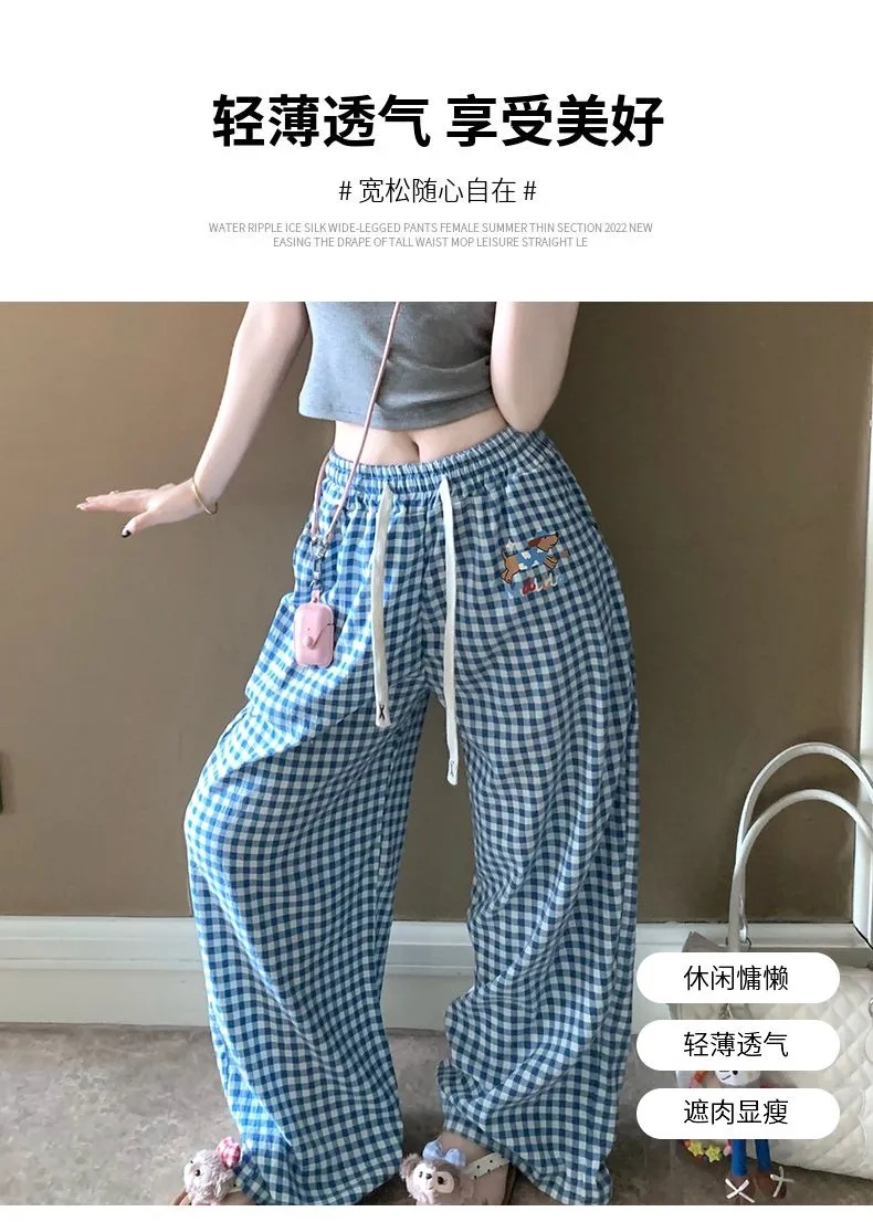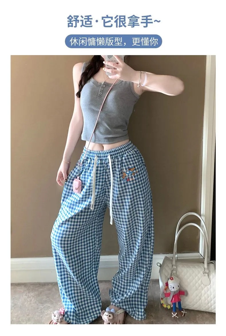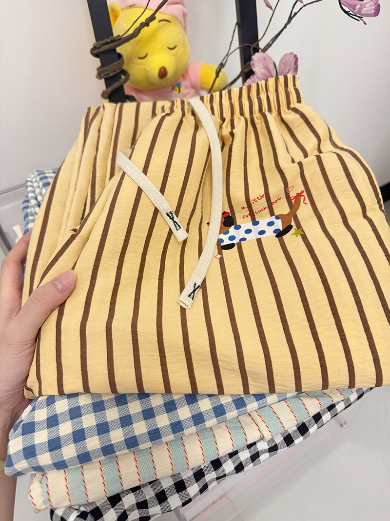 여름 워킹팬츠, 클라우드 코튼 파자마팬츠, 여성용 더블포켓 체크무늬 스트레이트 와이드팬츠, 아우터용 캐주얼 스트라이프 홈팬츠