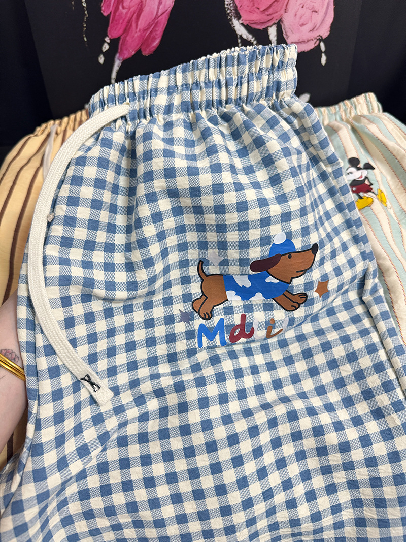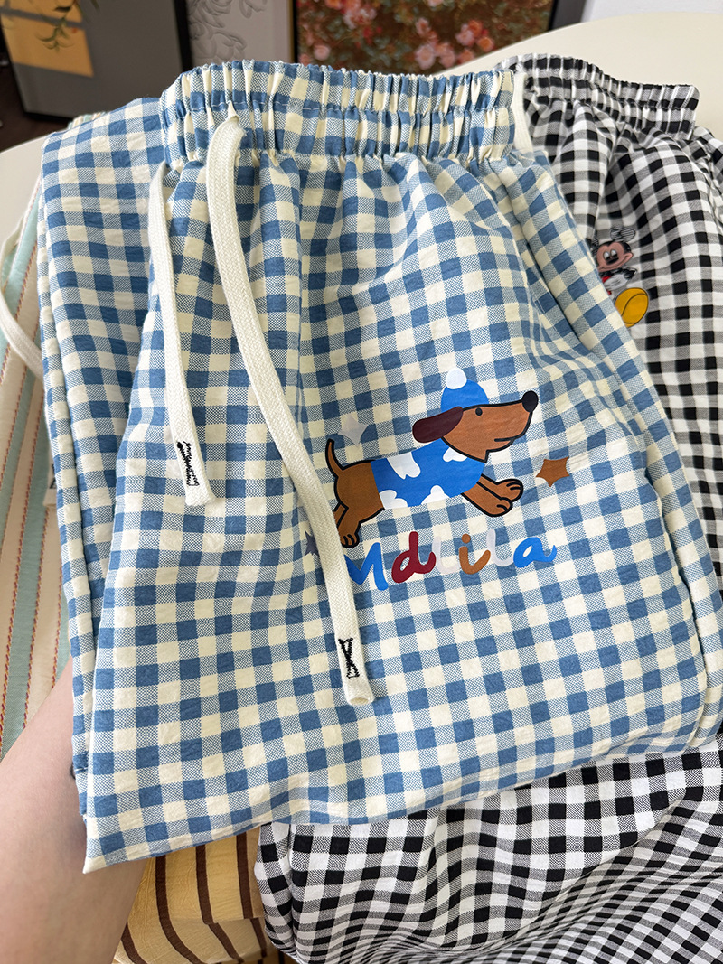 긴 바지 - 블루 체크 강아지 [더블 포켓 + 드로스트링]