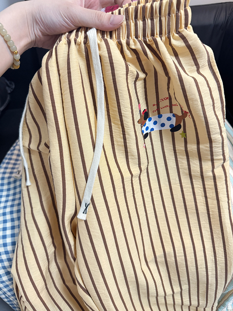 긴 바지 - 노란색 스트라이프 강아지 [더블 포켓 + 드로스트링]