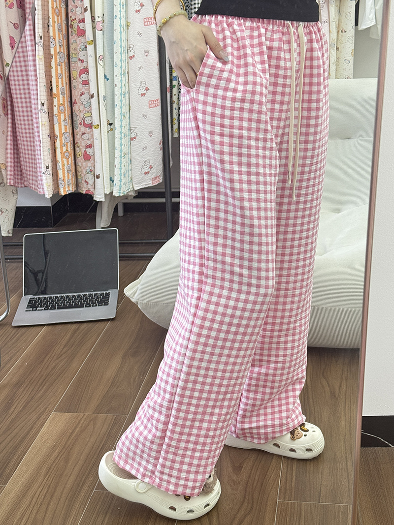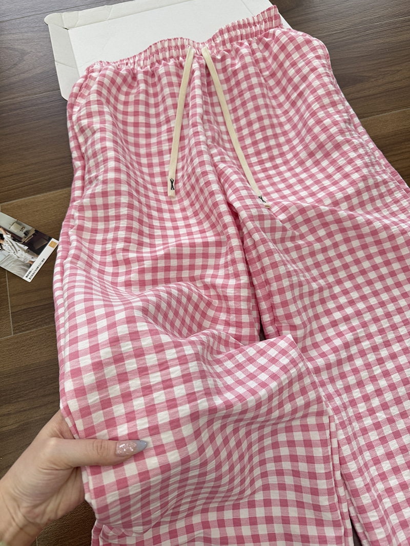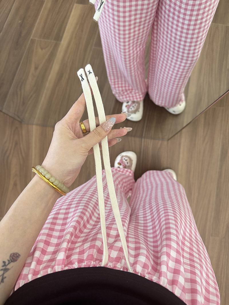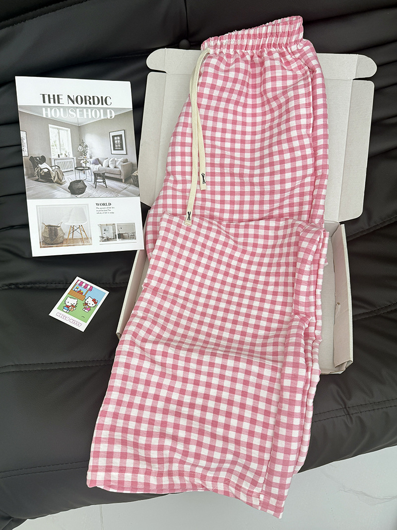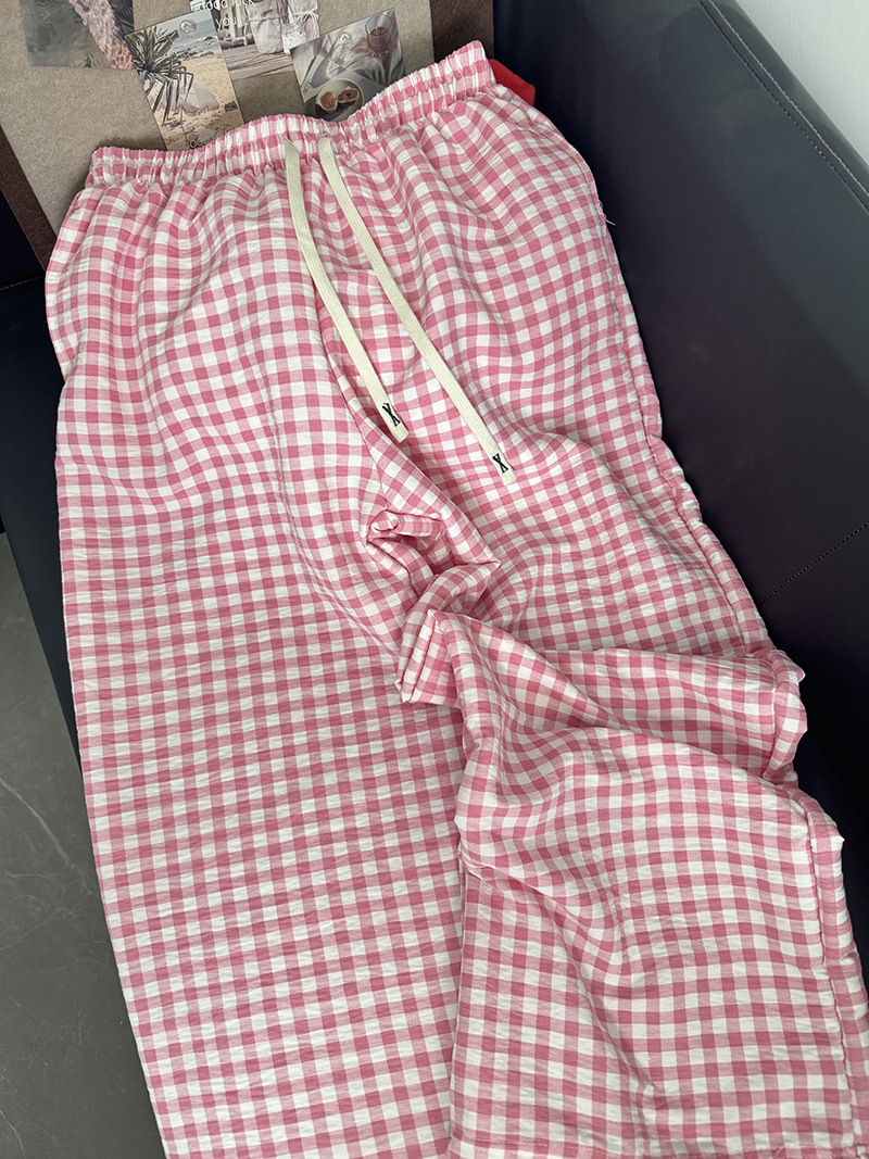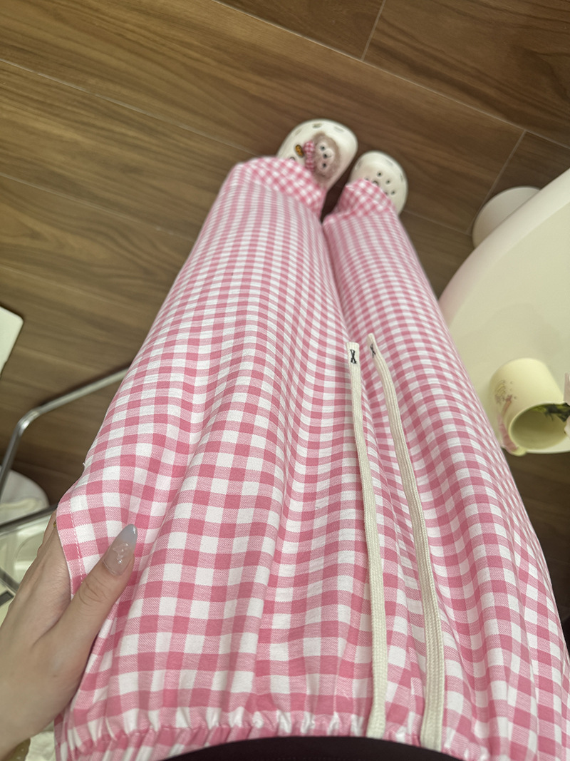 바지 - 핑크 체크무늬 [더블포켓+드로스트링]