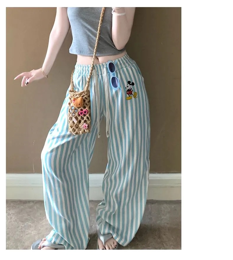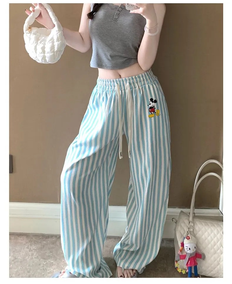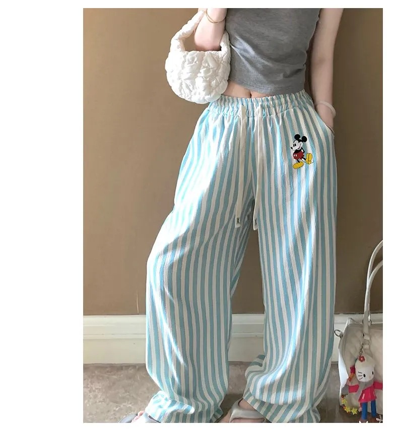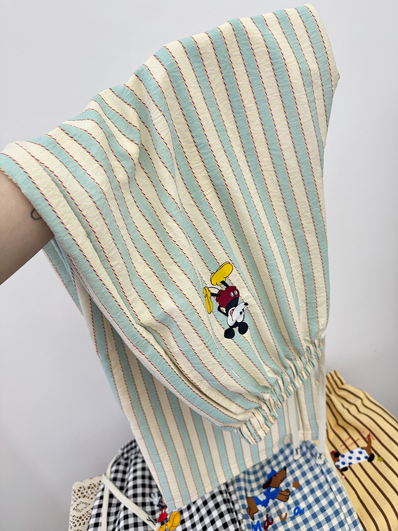 긴 바지 - 연두색 스트라이프 미키 [더블 포켓 + 드로스트링]