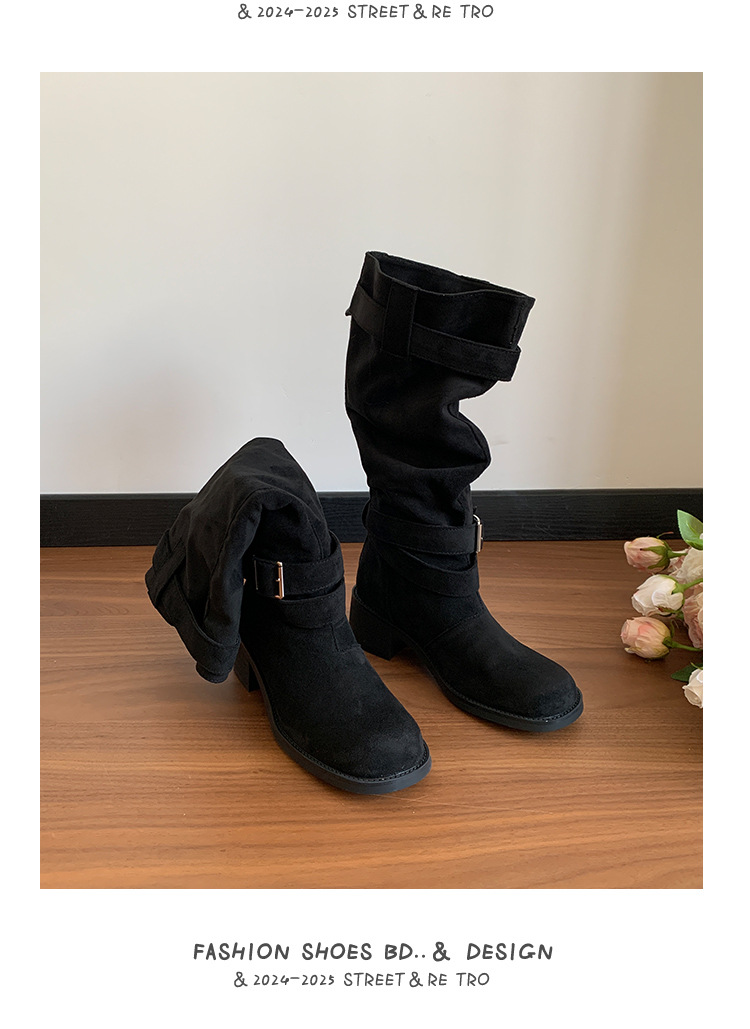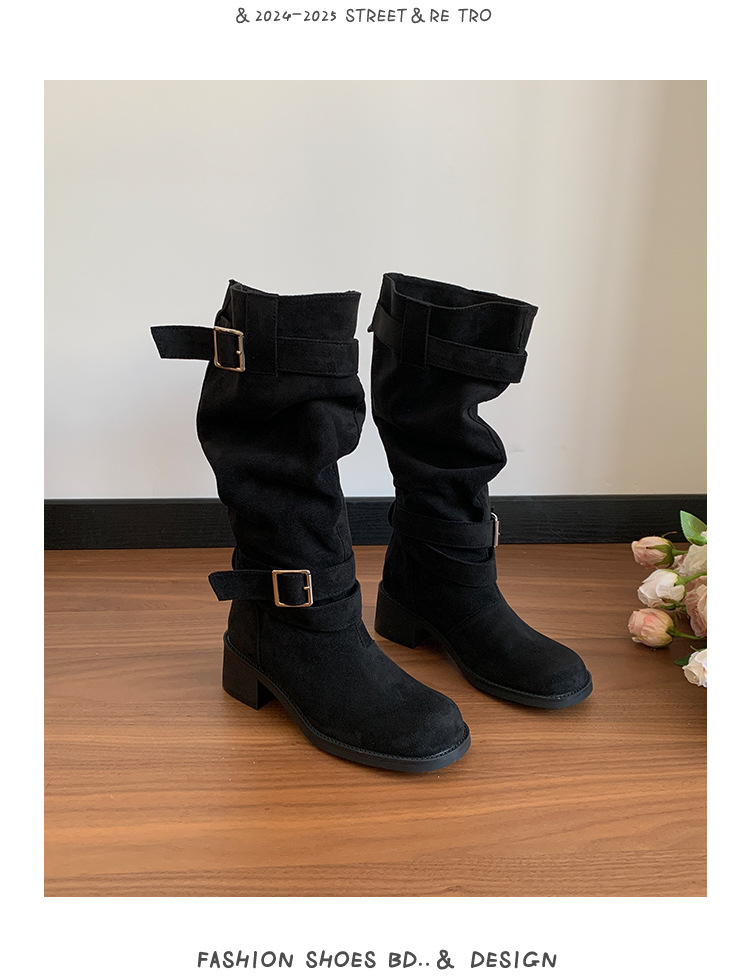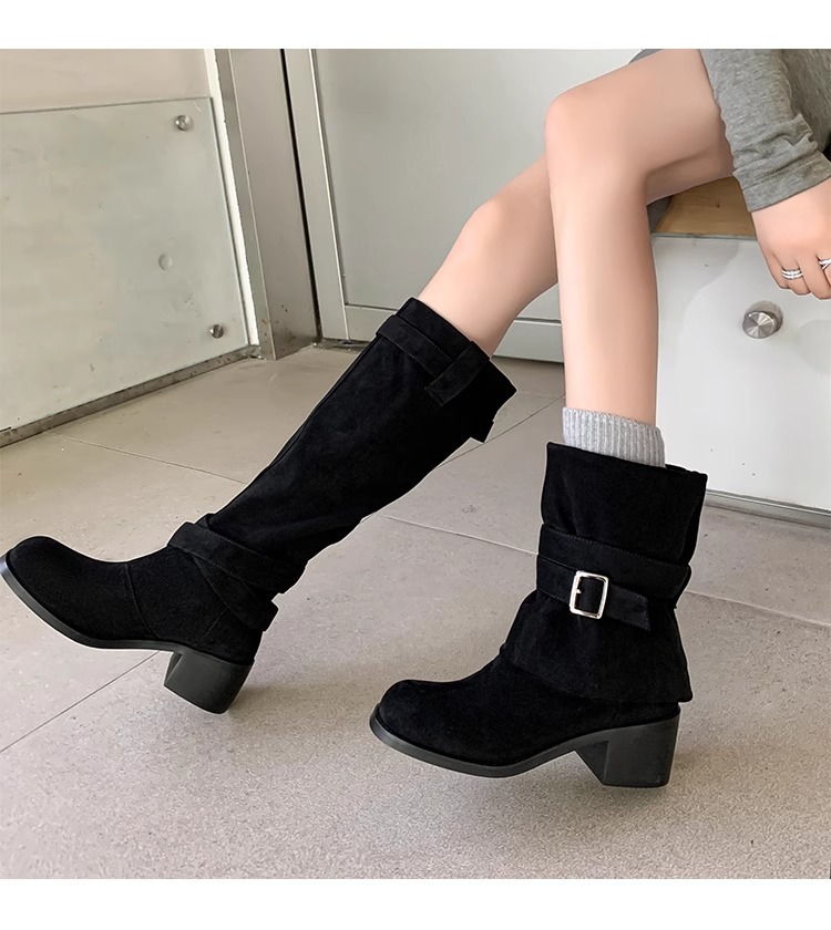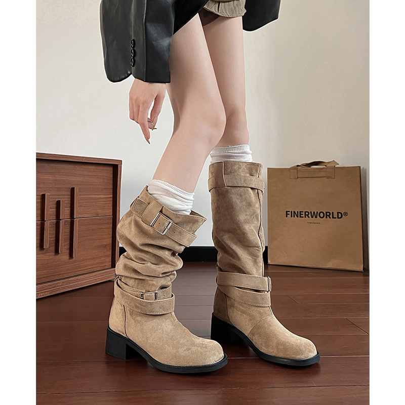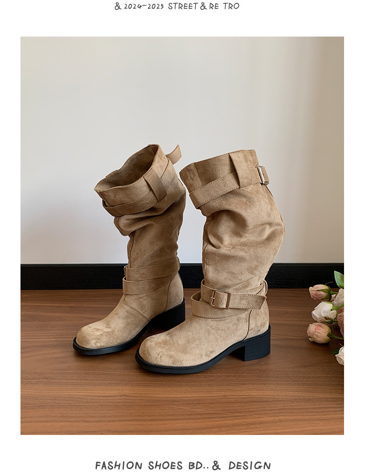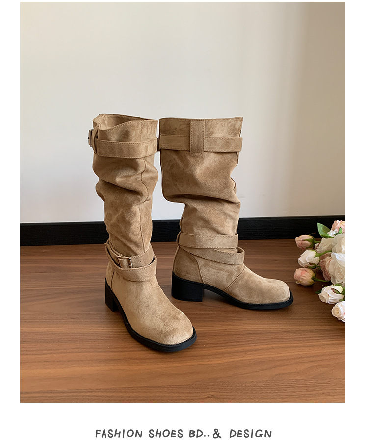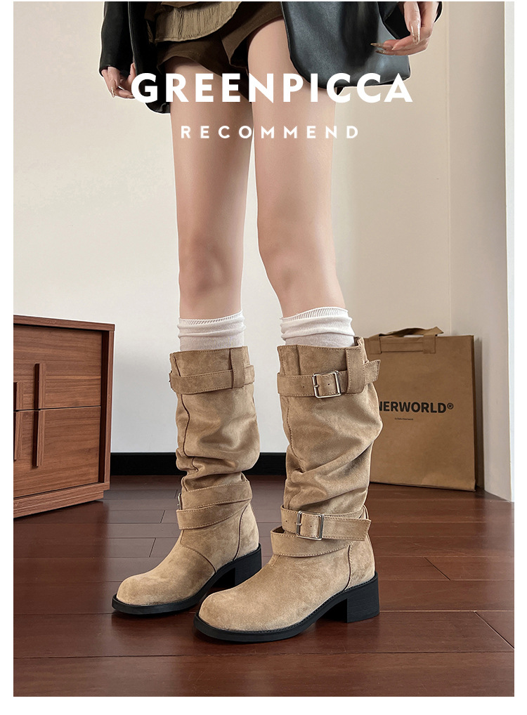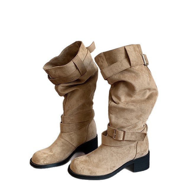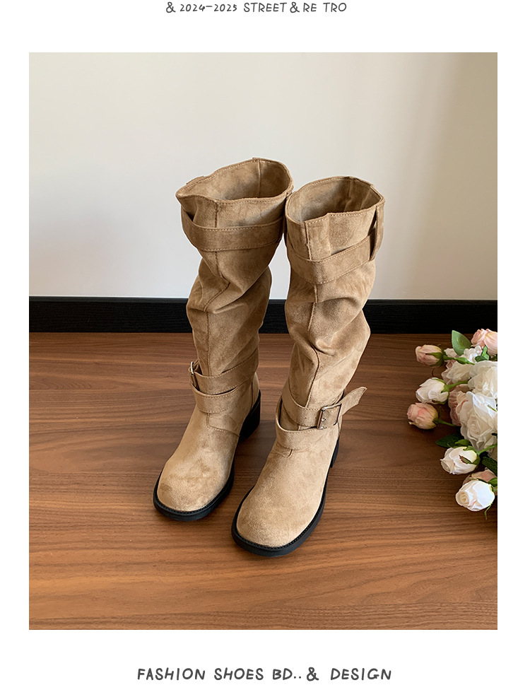 레트로 플리츠 라운드 토 두꺼운 굽 파일 부츠 2025 신작 가을 겨울 부츠 카키 스웨이드 무릎 부츠