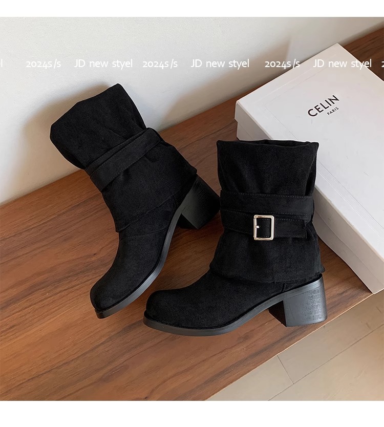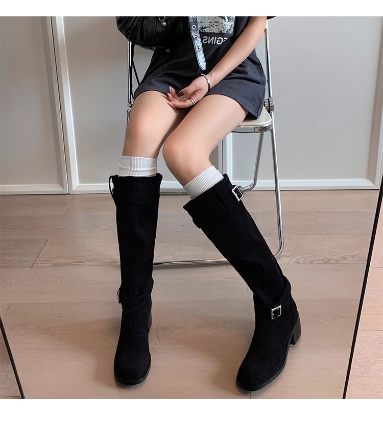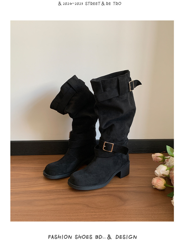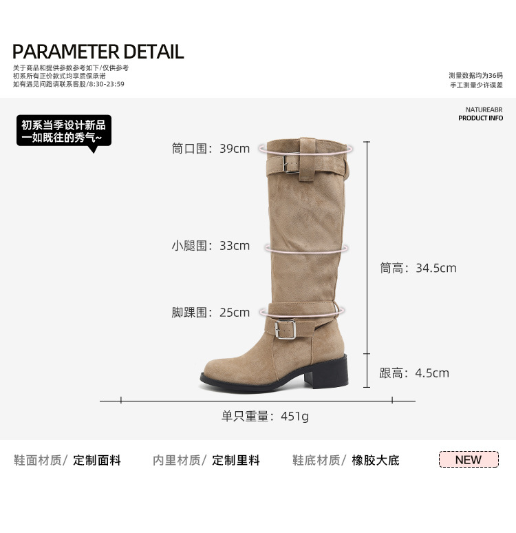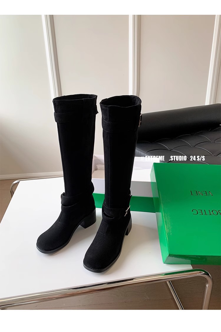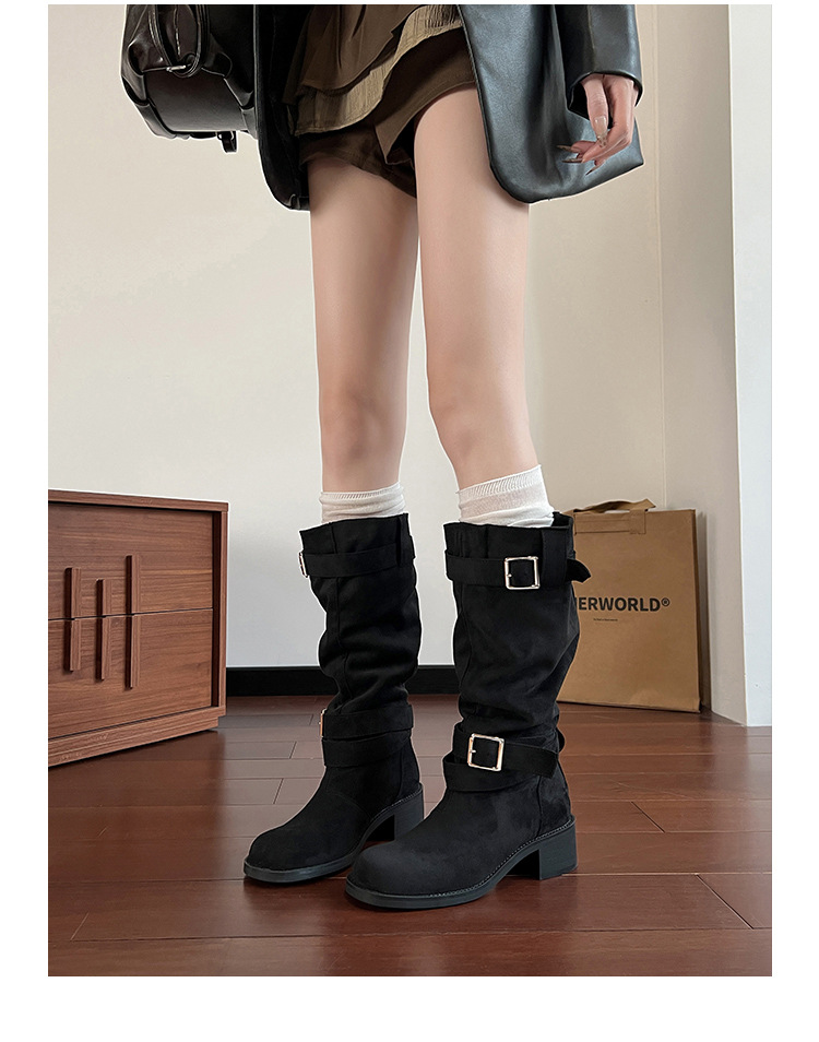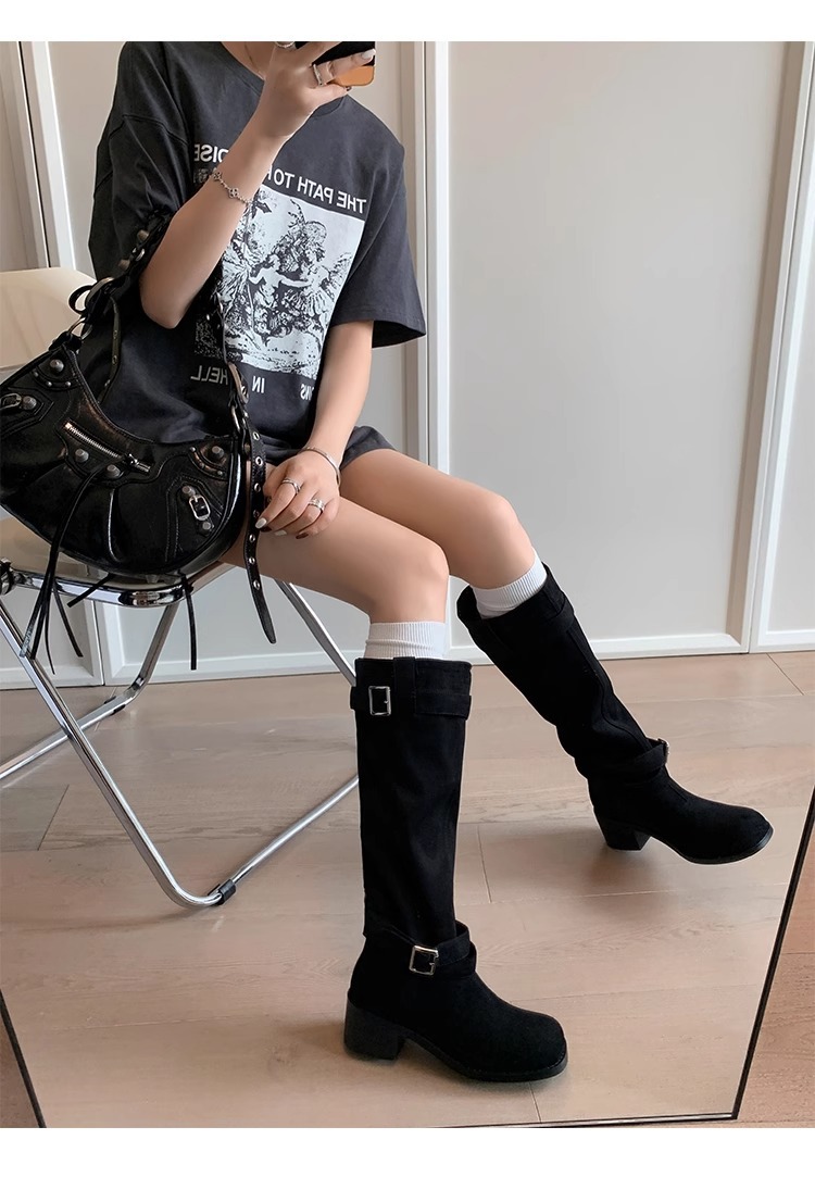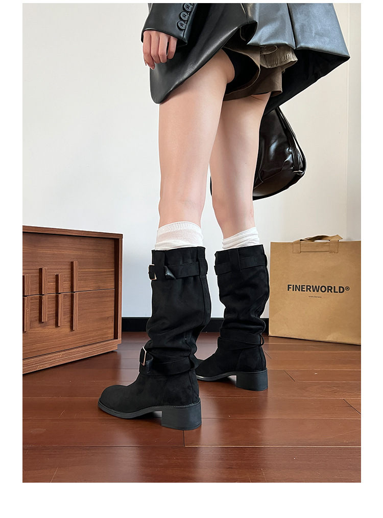 레트로 플리츠 라운드 토 두꺼운 굽 파일 부츠 2025 신작 가을 겨울 부츠 카키 스웨이드 무릎 부츠