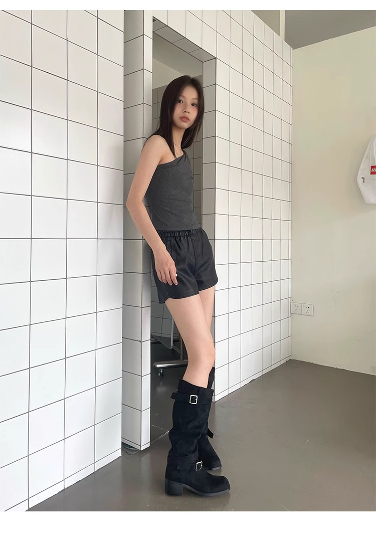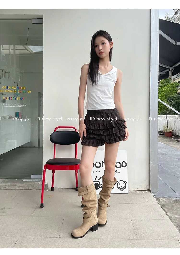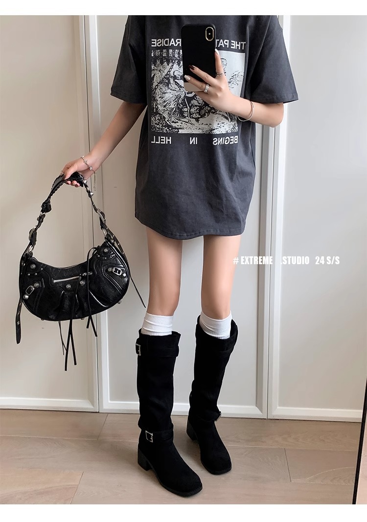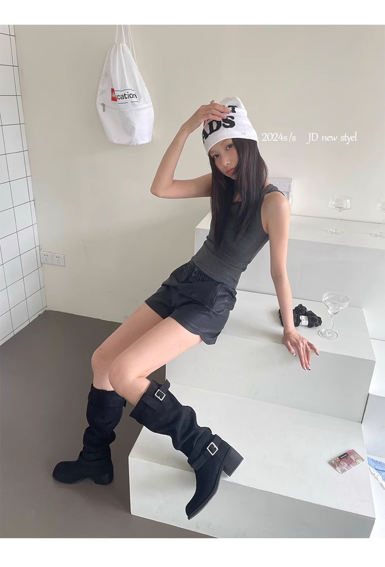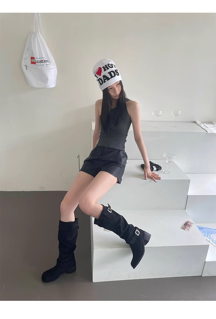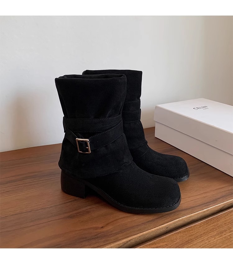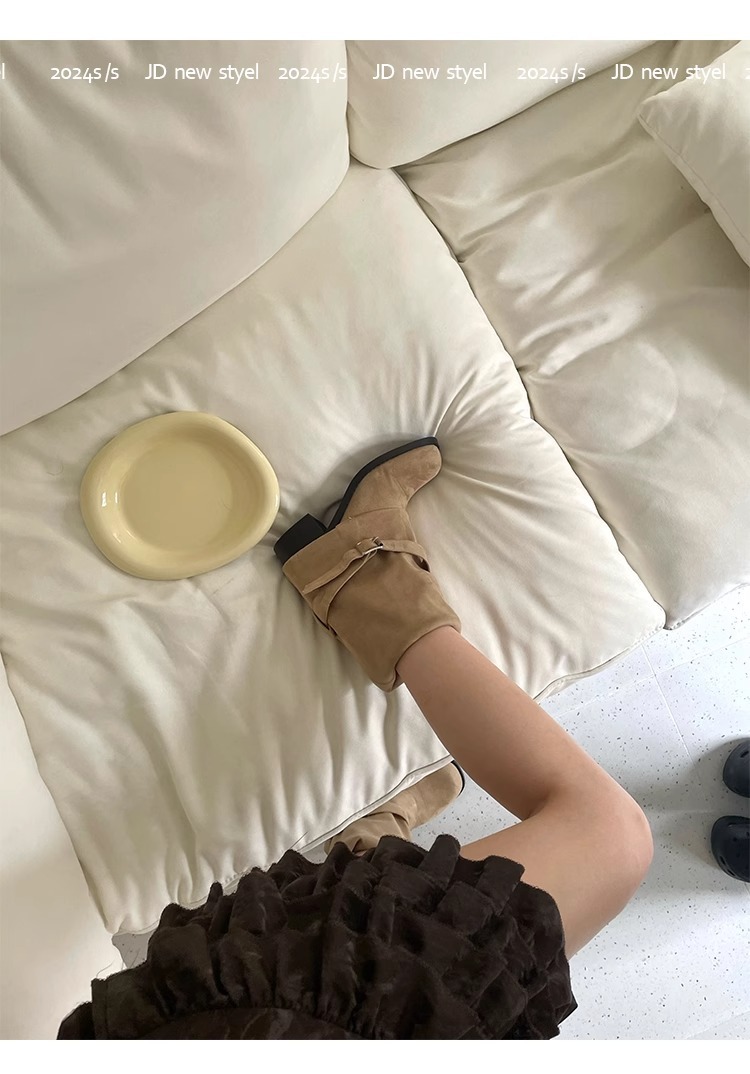 레트로 플리츠 라운드 토 두꺼운 굽 파일 부츠 2025 신작 가을 겨울 부츠 카키 스웨이드 무릎 부츠