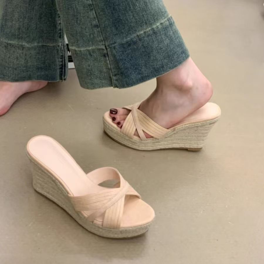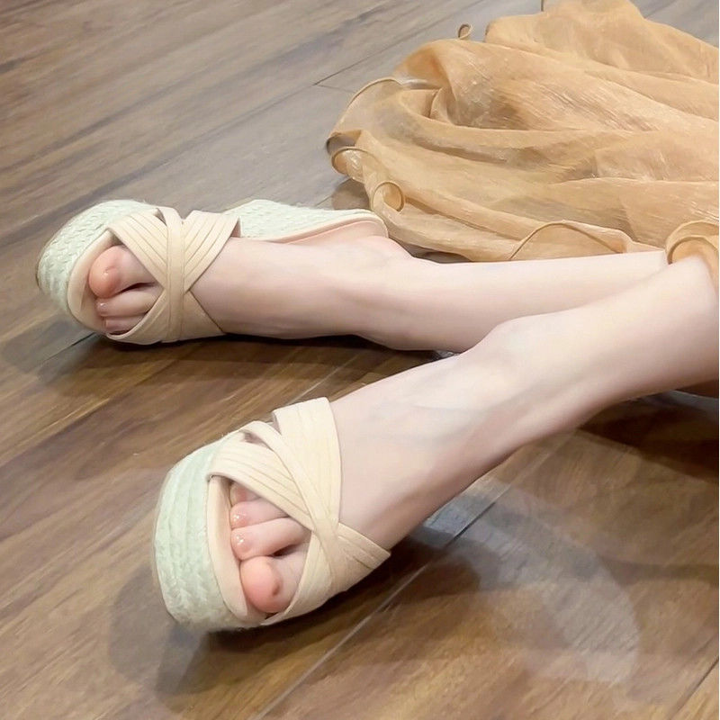여성용 웨지 슬리퍼 10cm 한국 스타일 여름 캐주얼 요정 스타일 크로스 스트랩 비치 슈즈 2025 핫 스타일 대외 무역 샌들