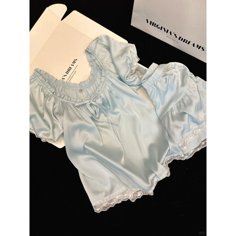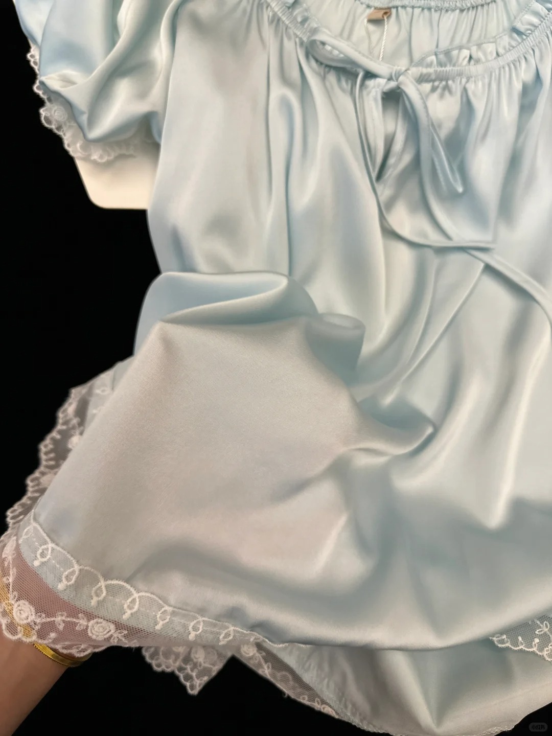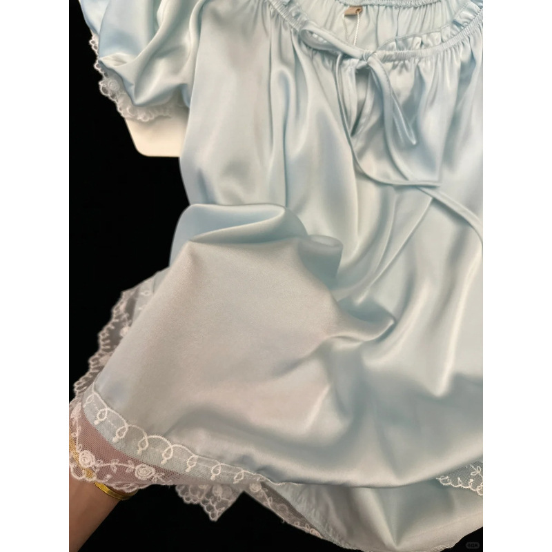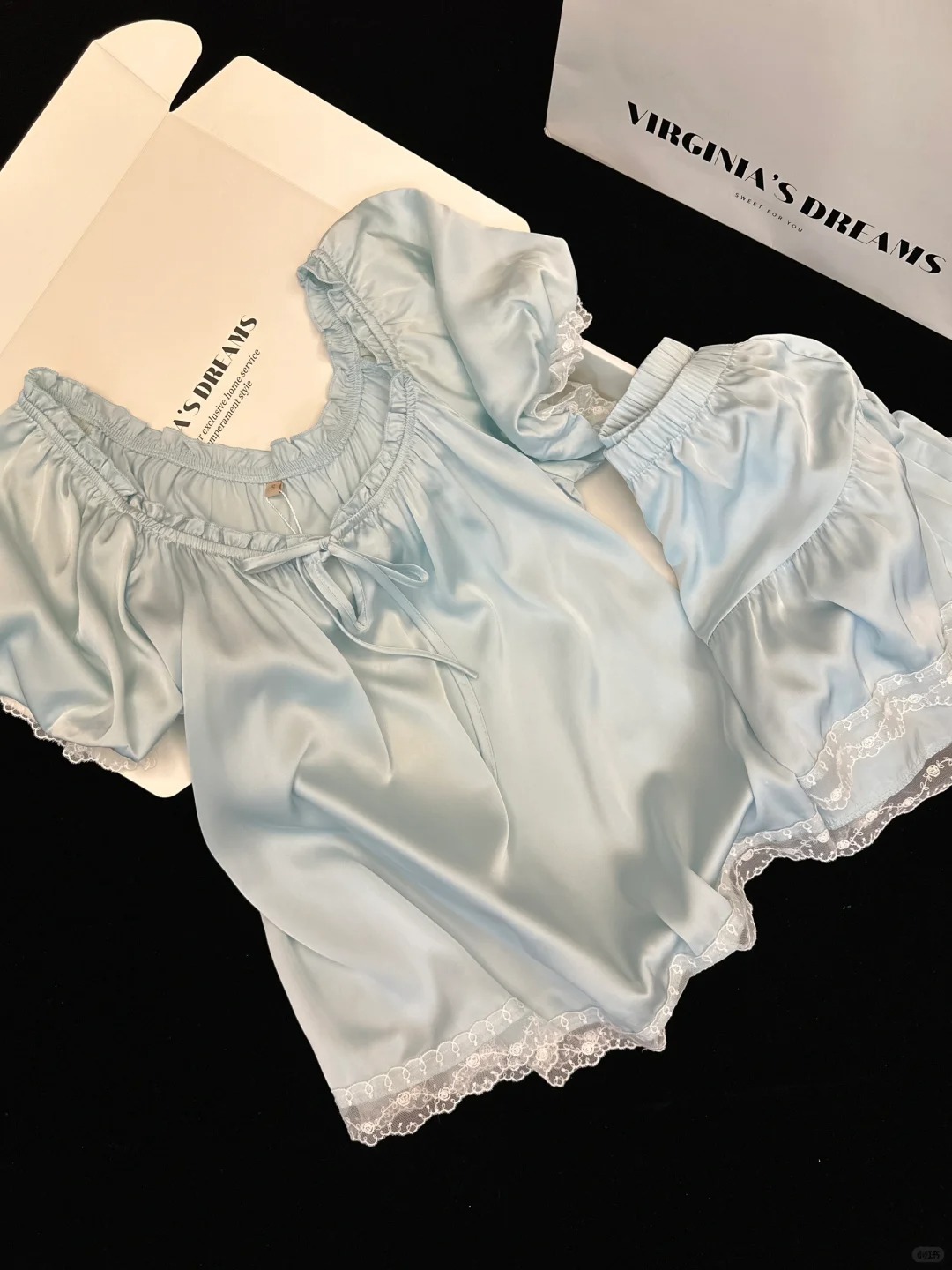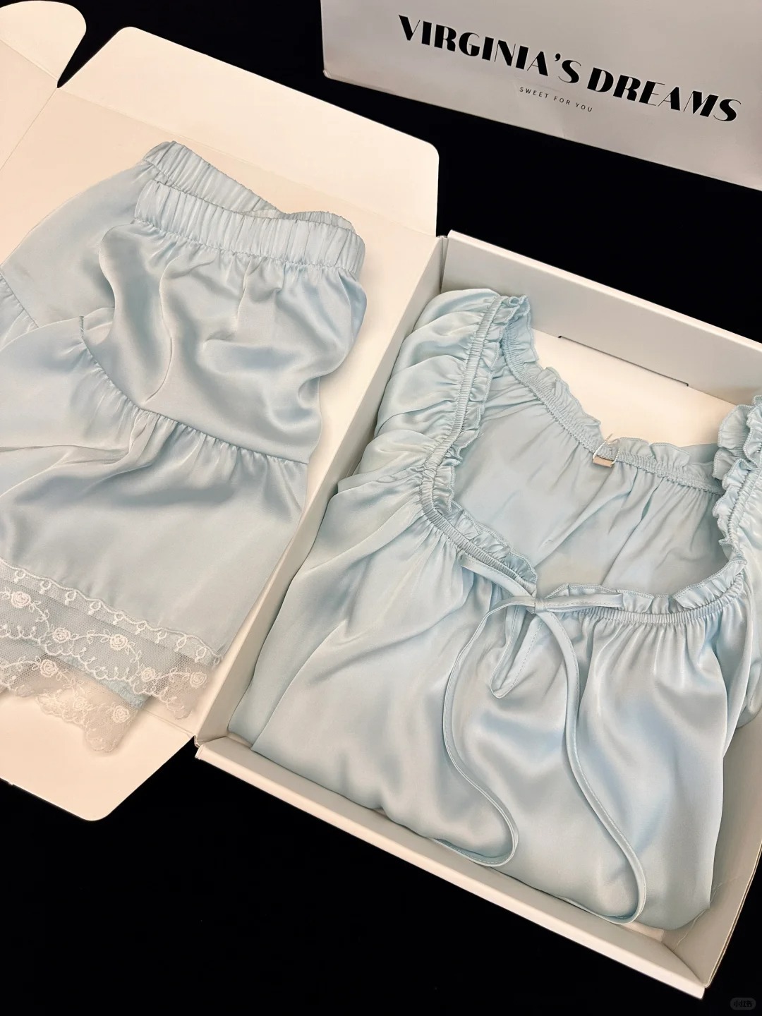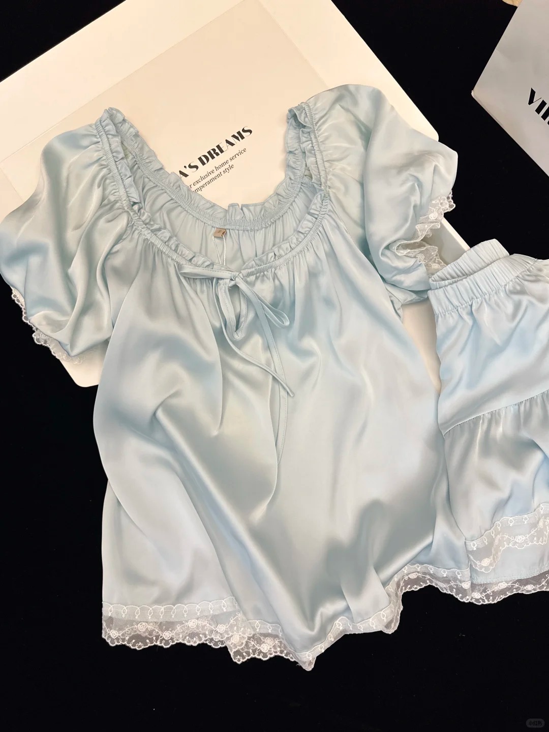 발레 스타일 2025 부드러운 순수한 욕망 얼음 실크 스플 라이스 잠옷 여성 여름 새 슈트 시원한 홈웨어 투피스 세트