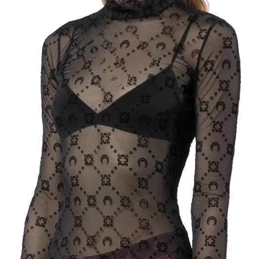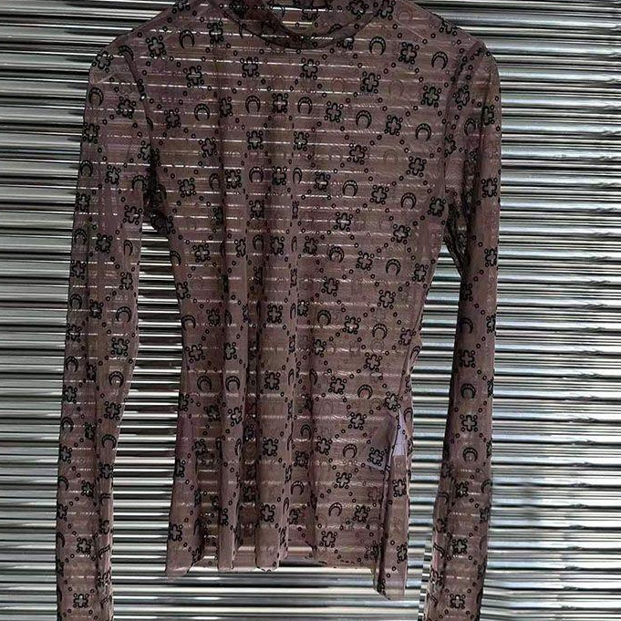 스타와 같은 스타일의 네잎 클로버 문 문 플록 하프 터틀넥 밑단 셔츠 티셔츠
