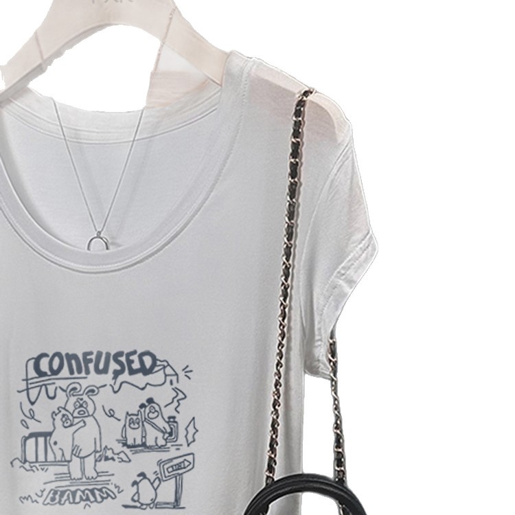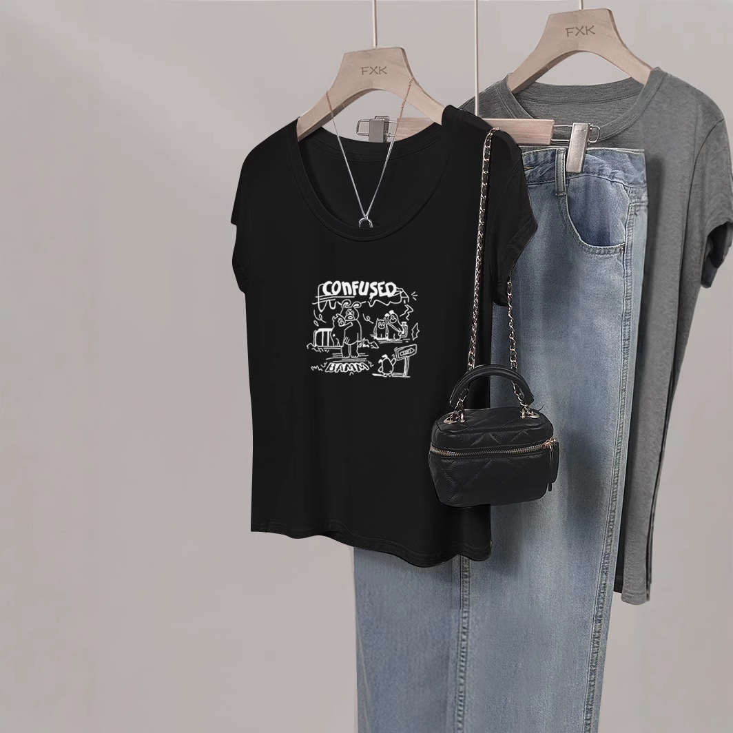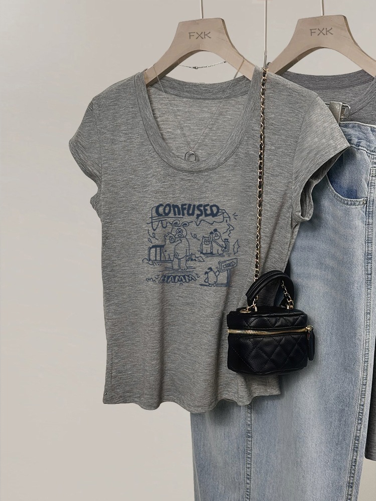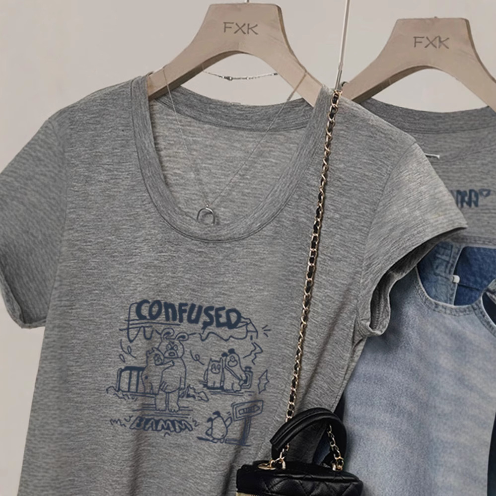 여성용 그레이 U 넥 오른쪽 어깨 반팔 티셔츠 여름 얇은 2025 새로운 슬림 피트 하이 엔드 외국 스타일 바닥 셔츠 탑