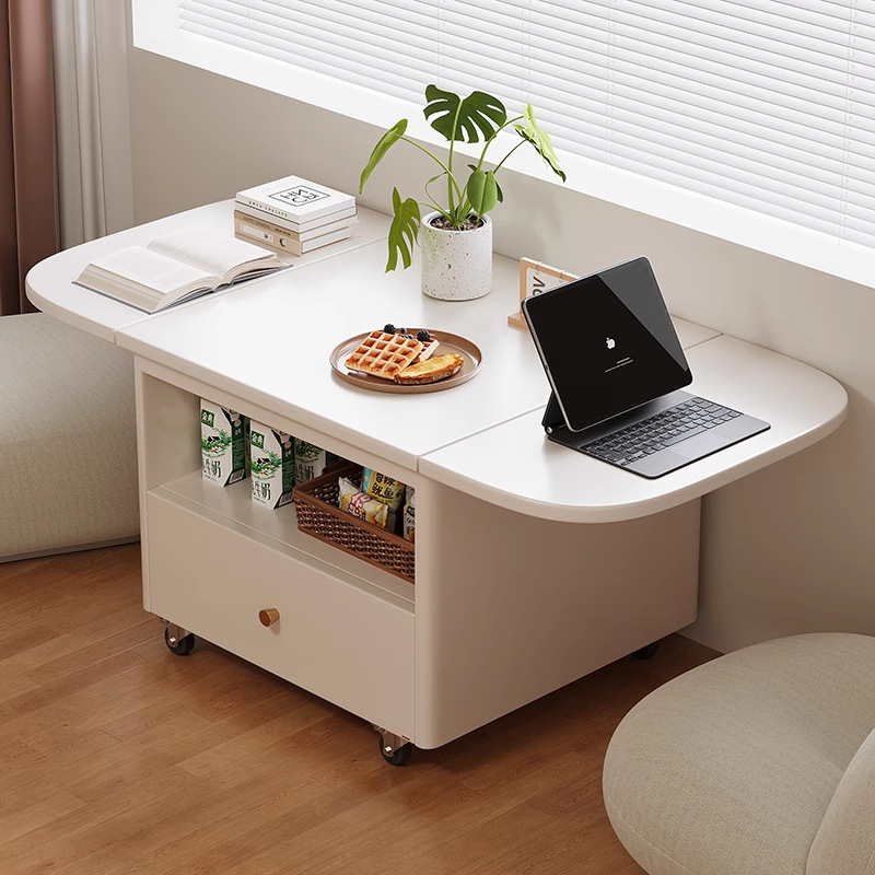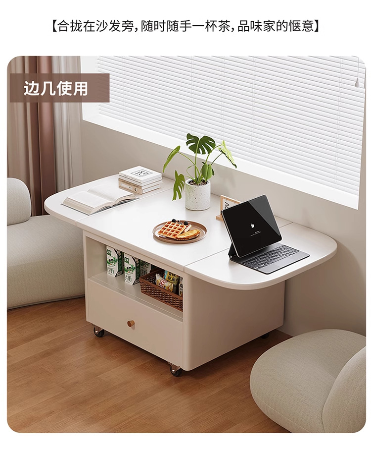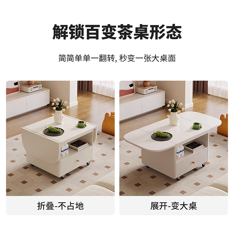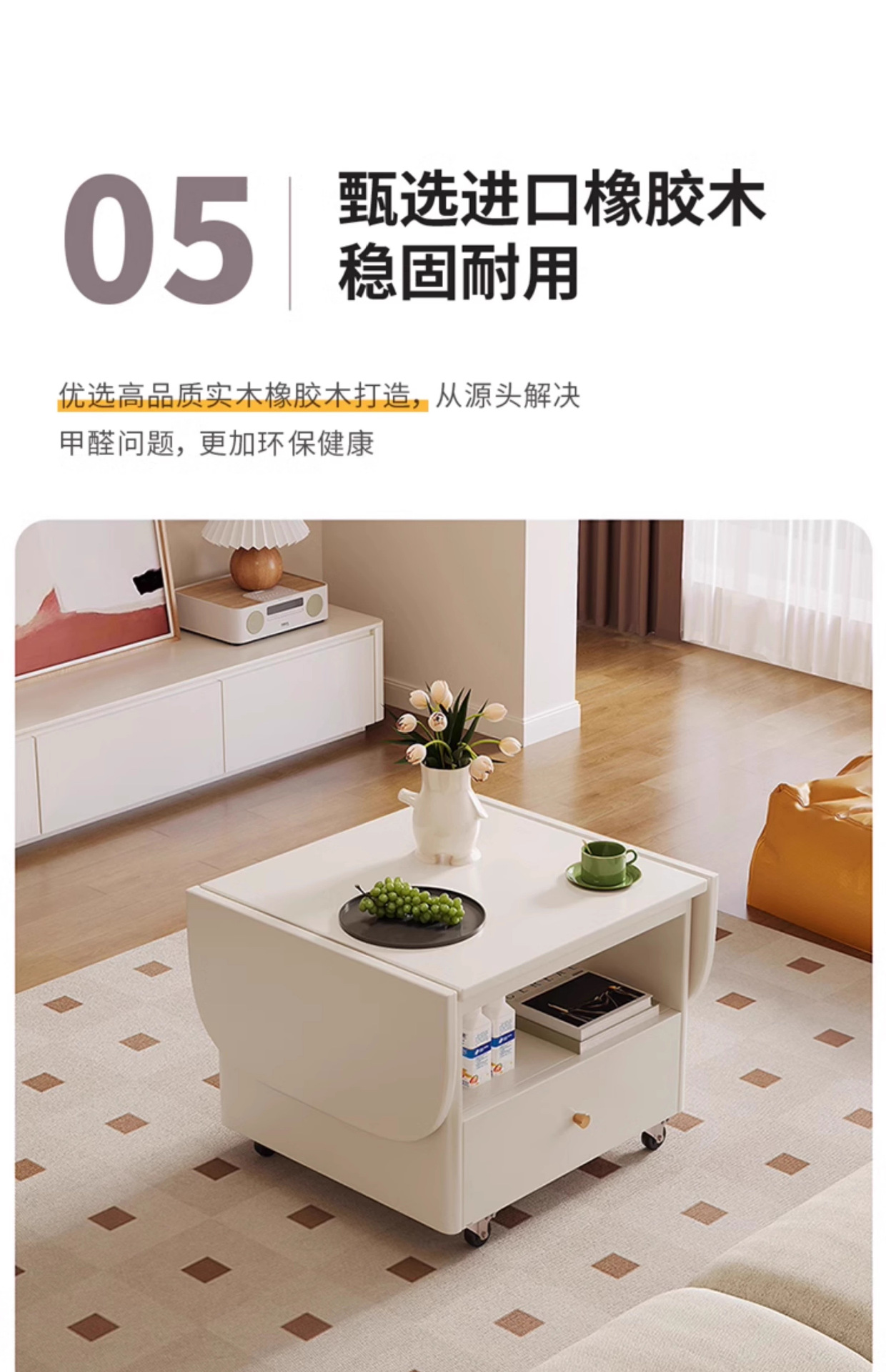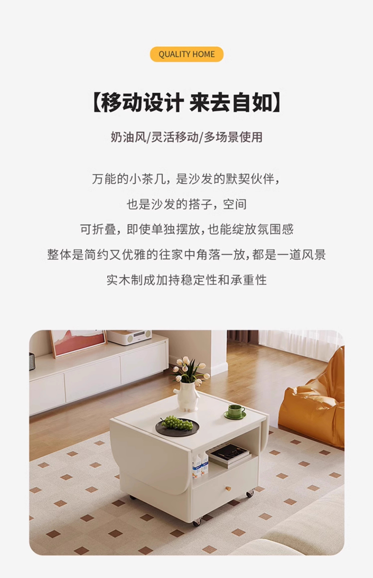 크림 스타일 접이식 커피 테이블 사이드 테이블 간단한 현대 작은 아파트 단단한 나무 거실 모바일 티 테이블 발코니 트롤리