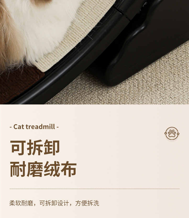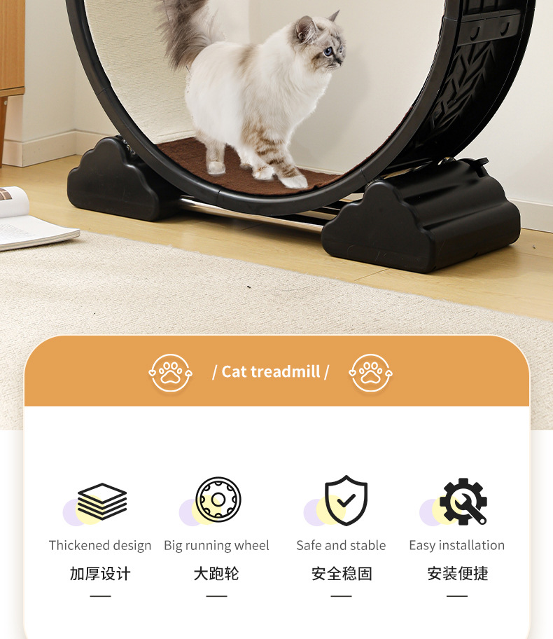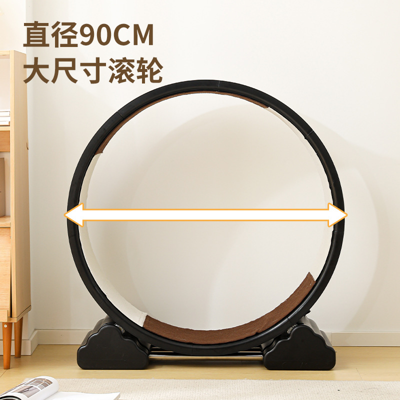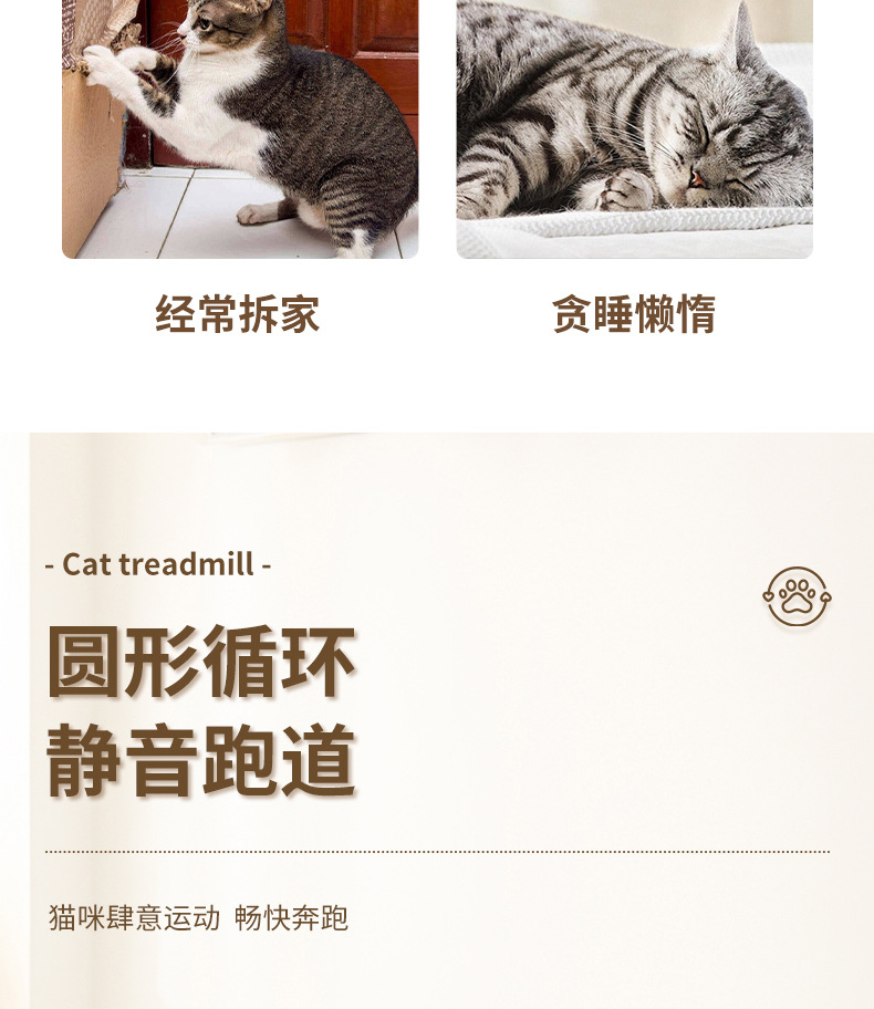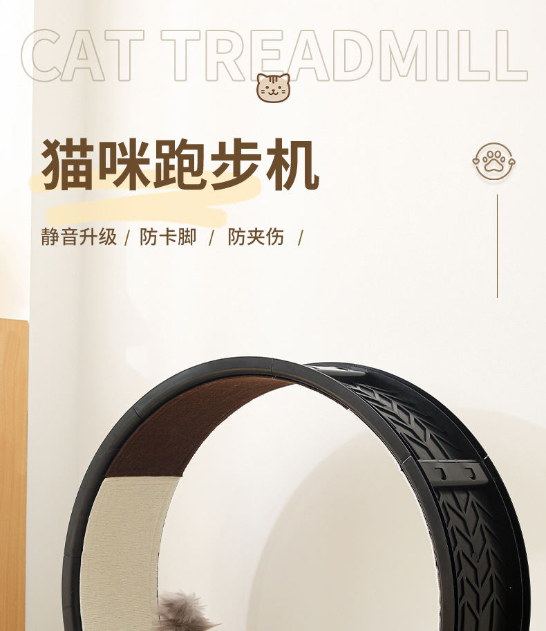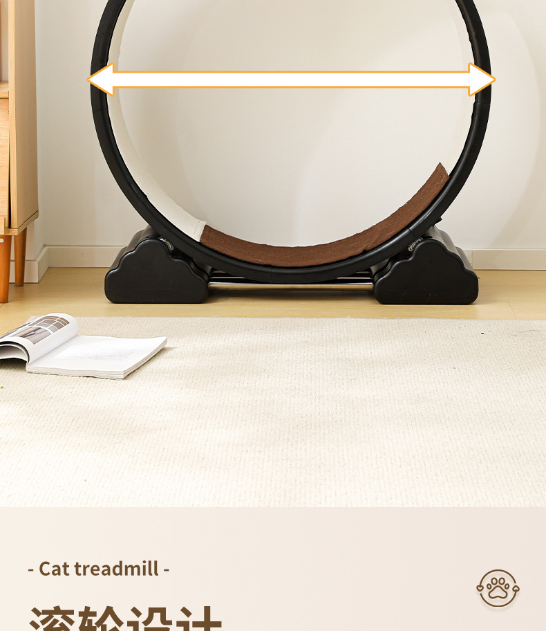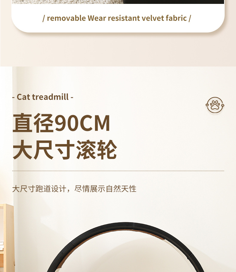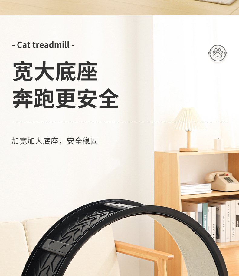 【产品说明】圆形循环静音跑道,安全锁扣装置,防夹猫设计,可拆卸耐磨绒布,直径90cm大尺寸,圆润边缘,加宽加广底座,