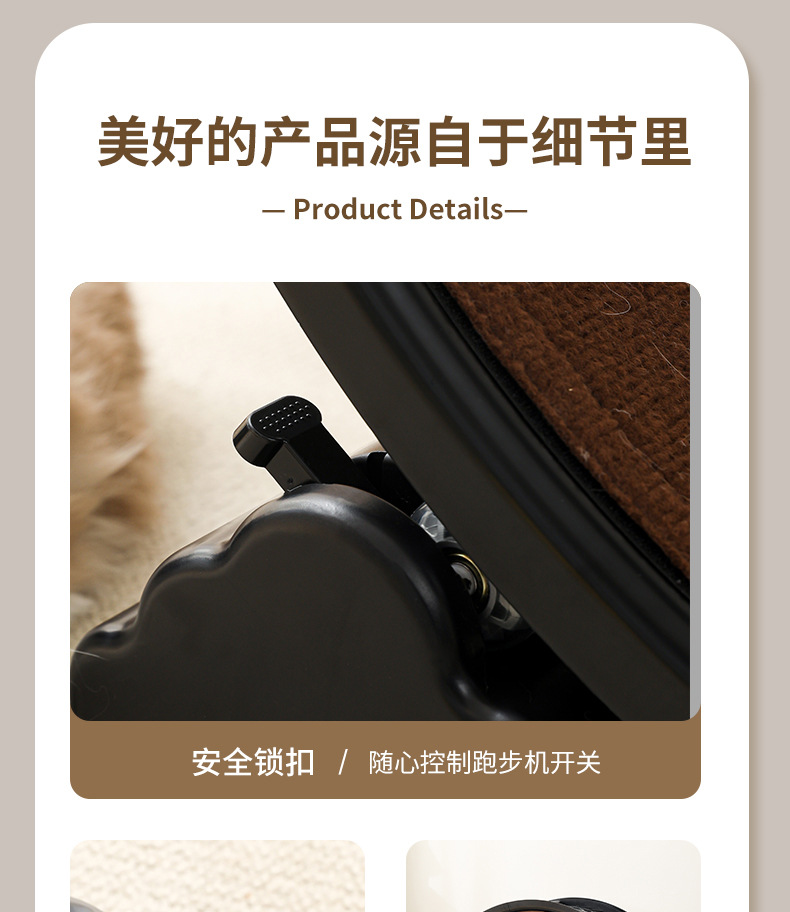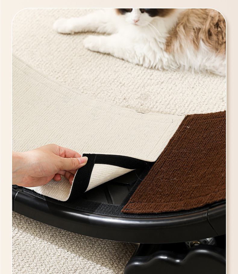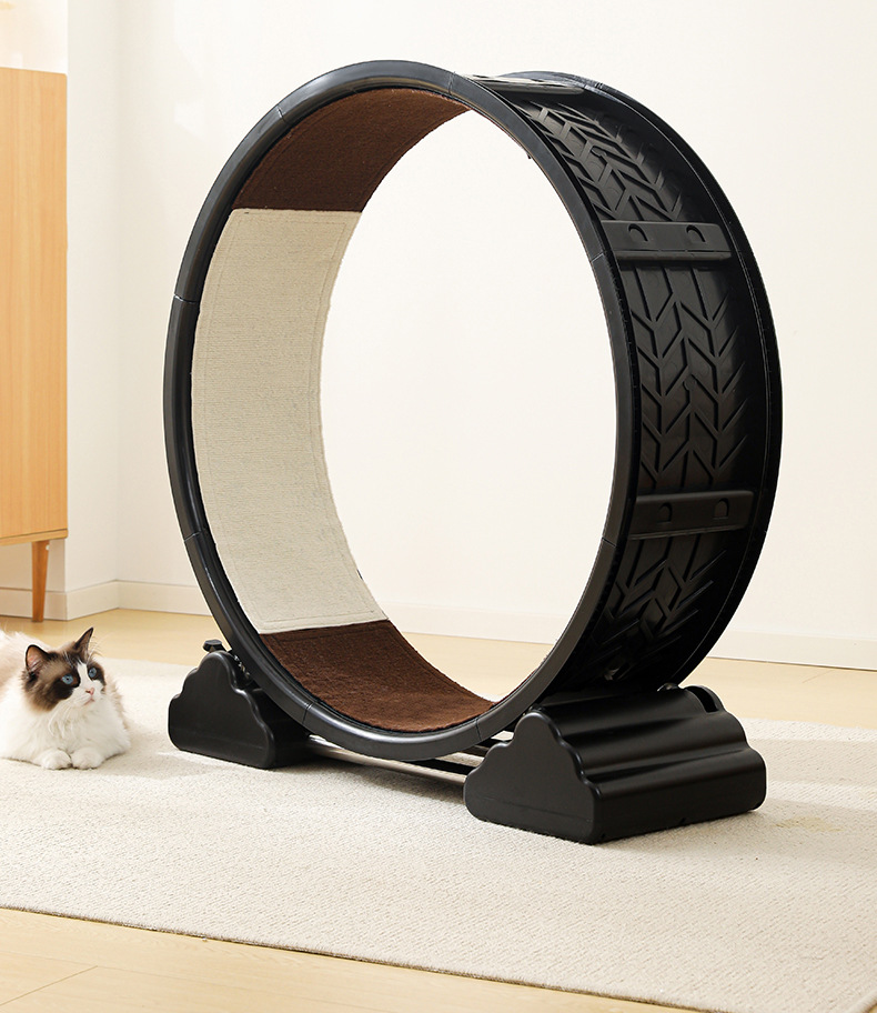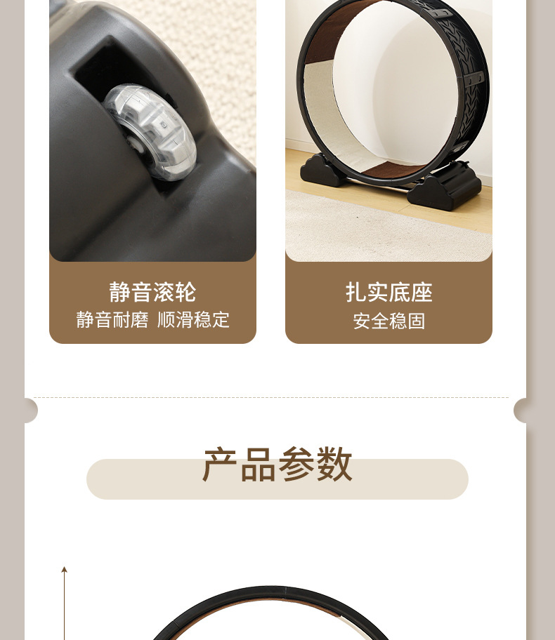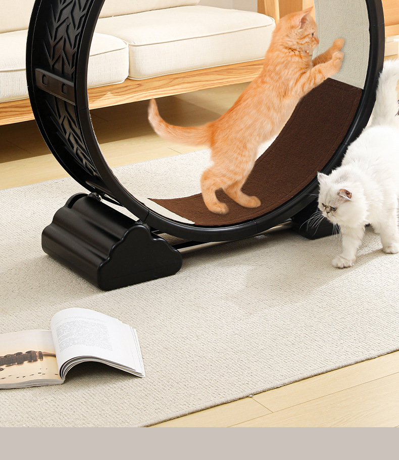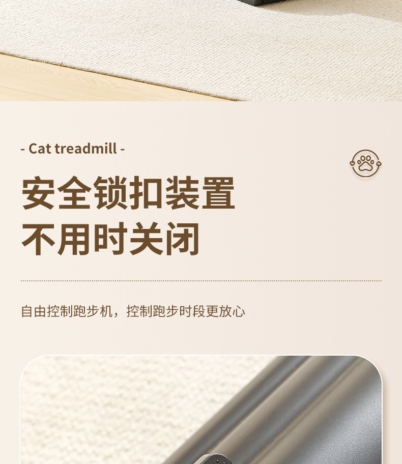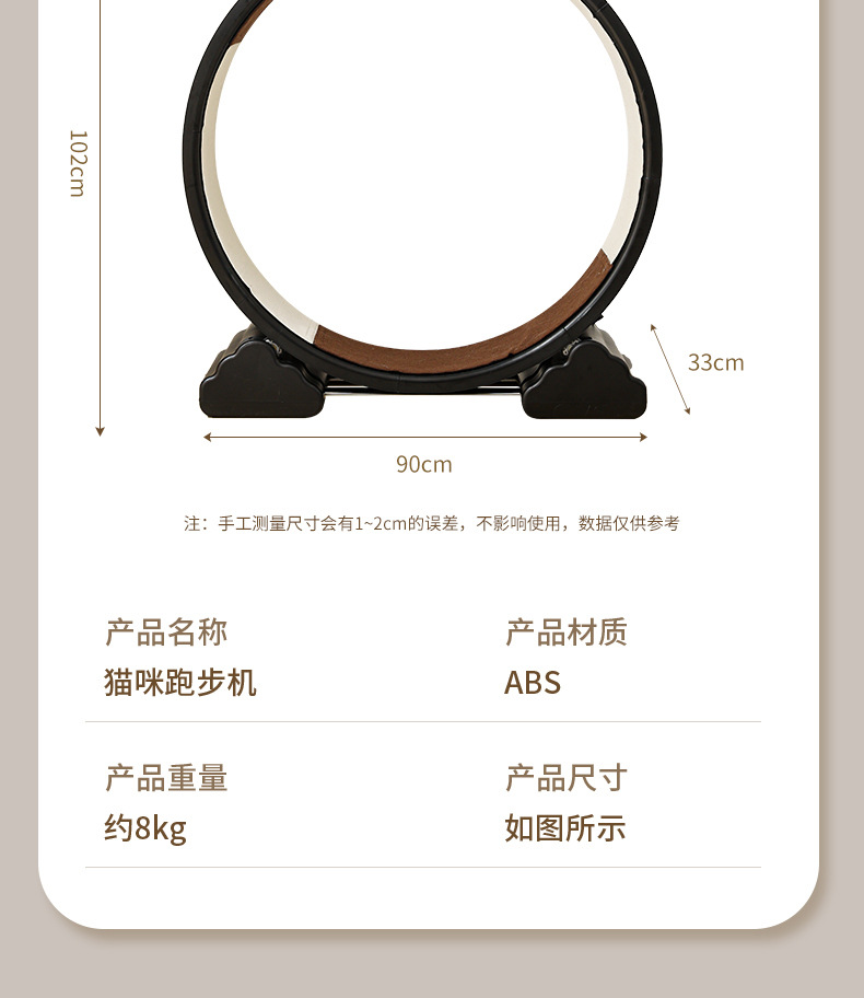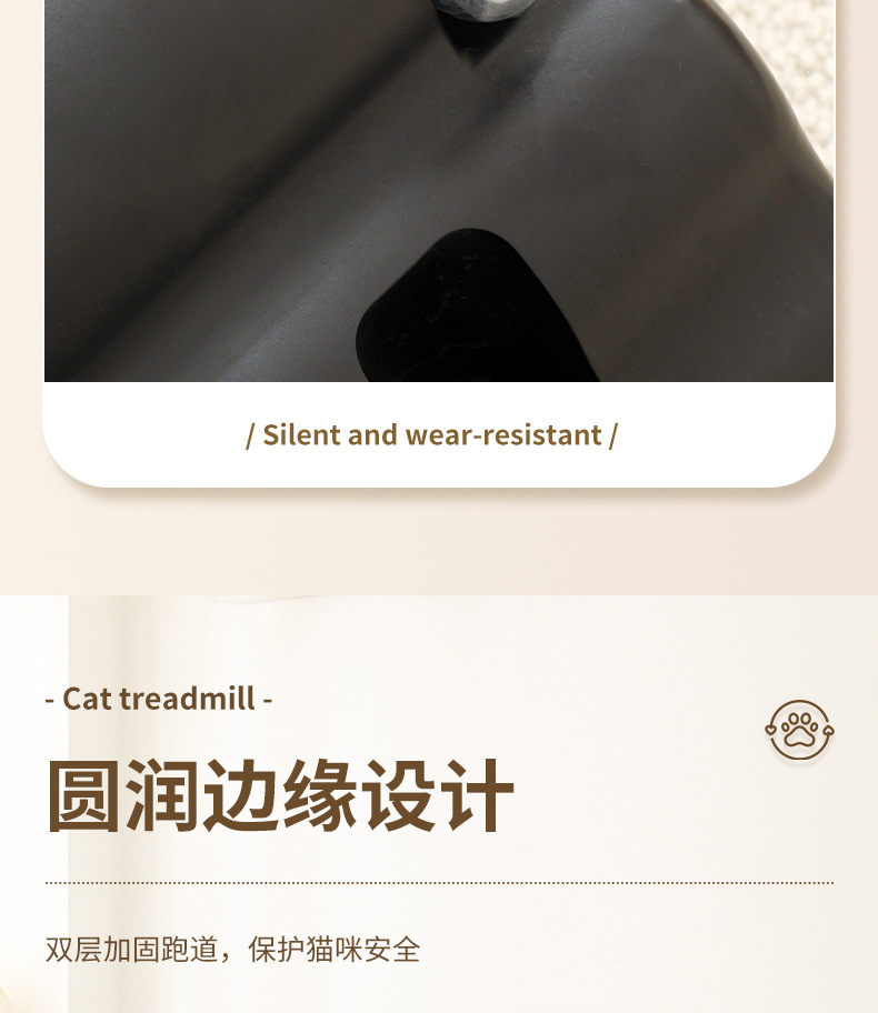 【产品说明】圆形循环静音跑道,安全锁扣装置,防夹猫设计,可拆卸耐磨绒布,直径90cm大尺寸,圆润边缘,加宽加广底座,