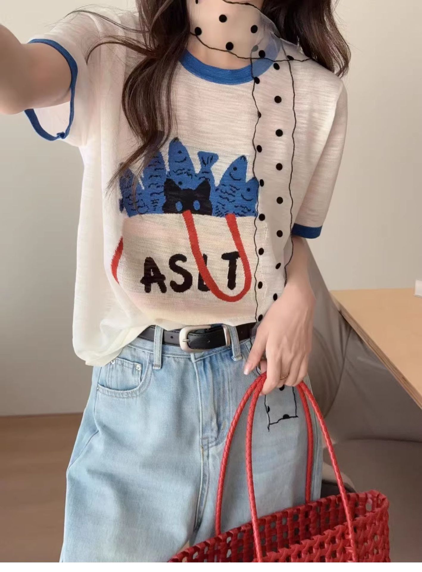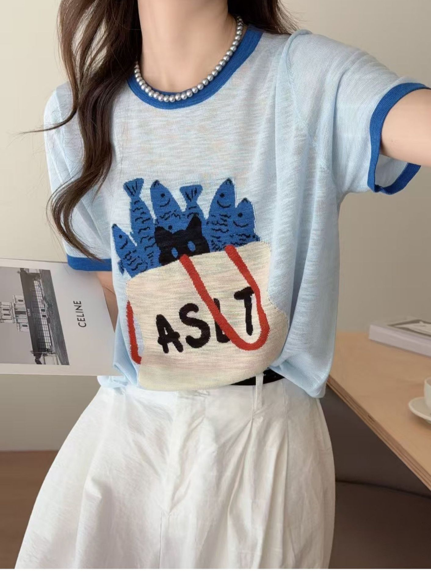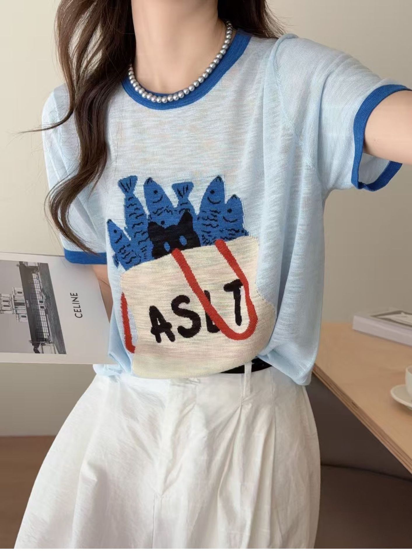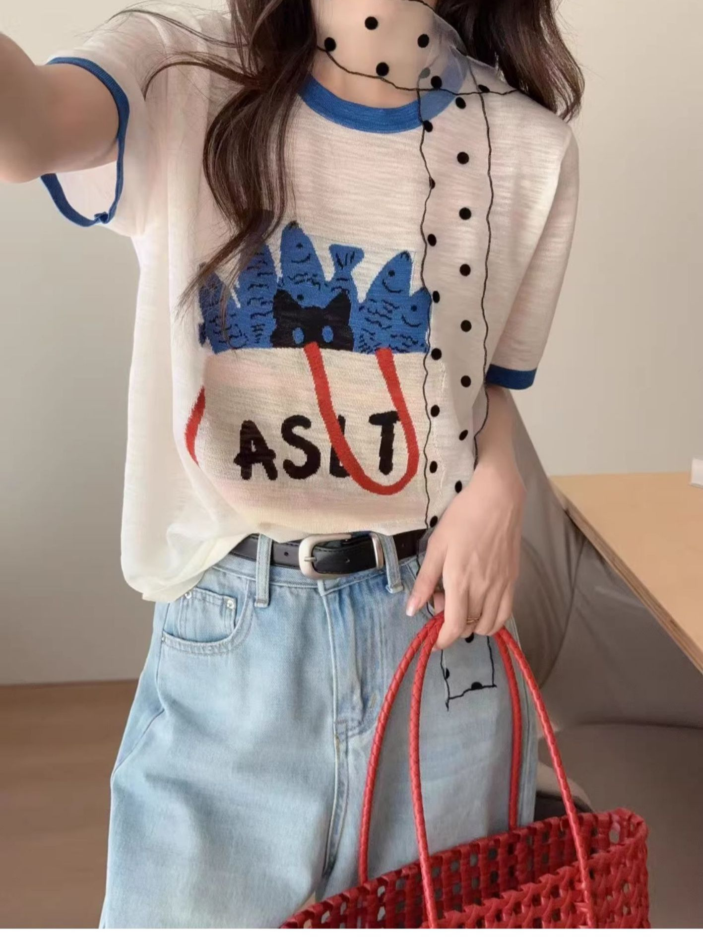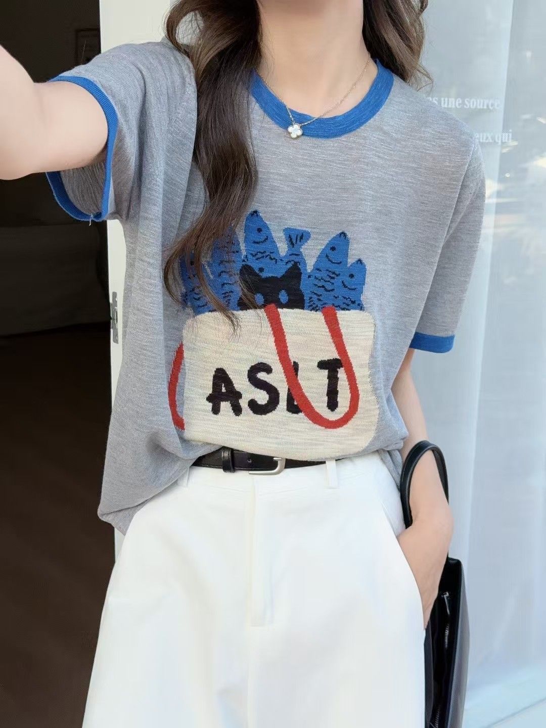 올해 인기 만화 문자 프린트 대나무 면 반팔 티셔츠 여름 여성 루즈한 연령 감소 라운드 넥 스웨터