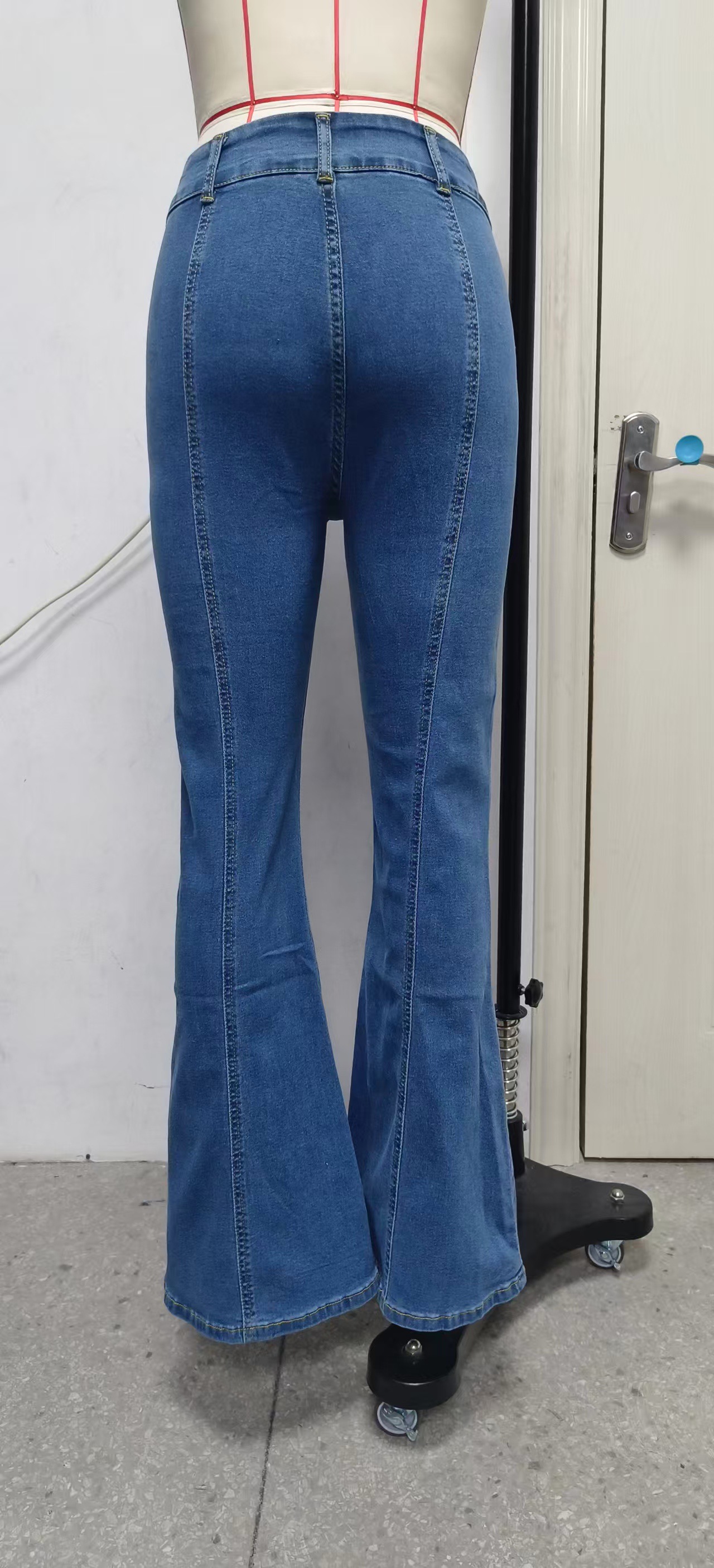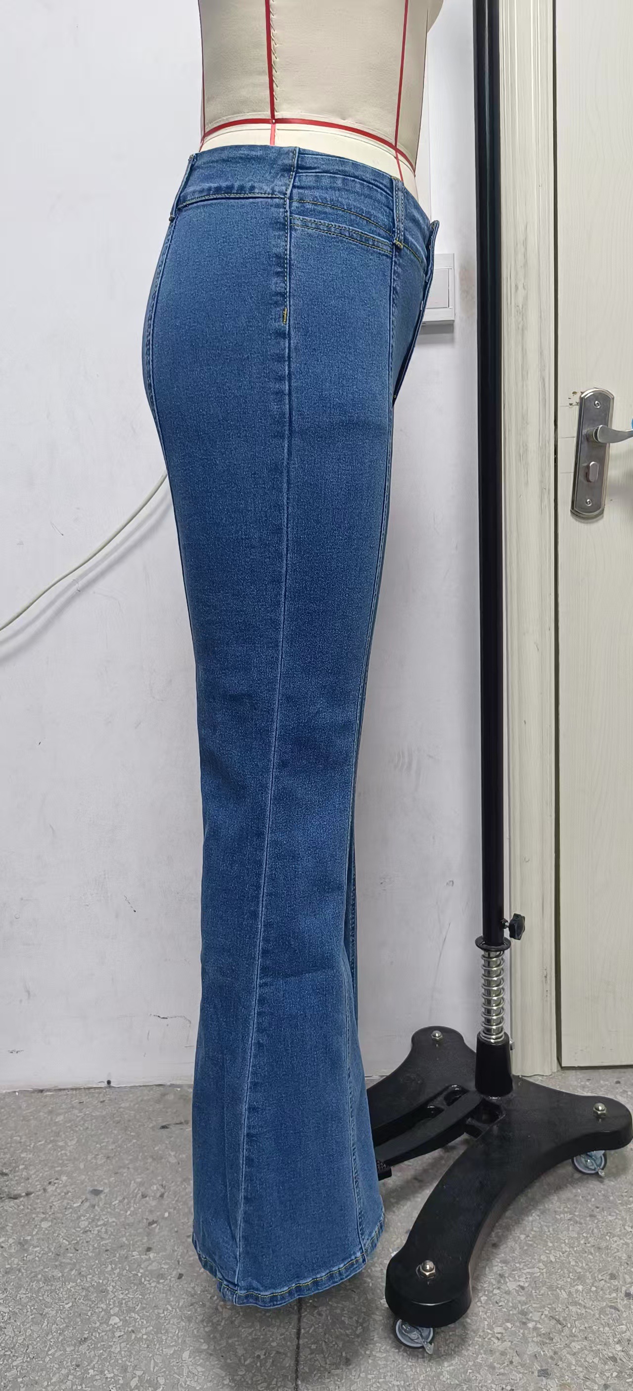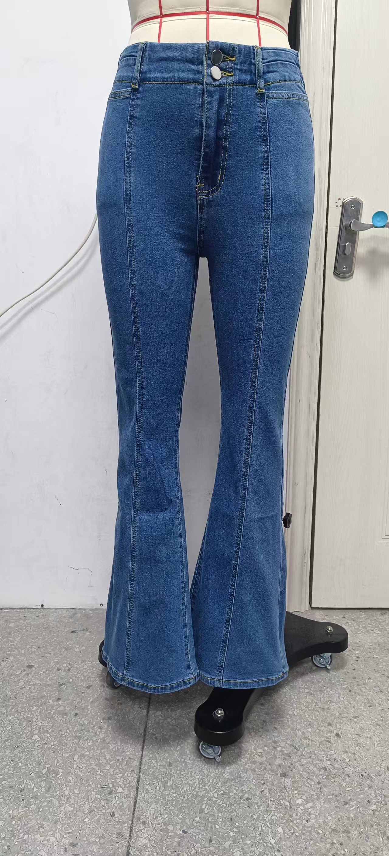 유럽과 미국의 대외 무역 국경 간 여성의 새로운 봄, 가을 스플 라이스 스타일로 슬림하고 신축성 있는 미드 웨이스트 플레어 청바지
