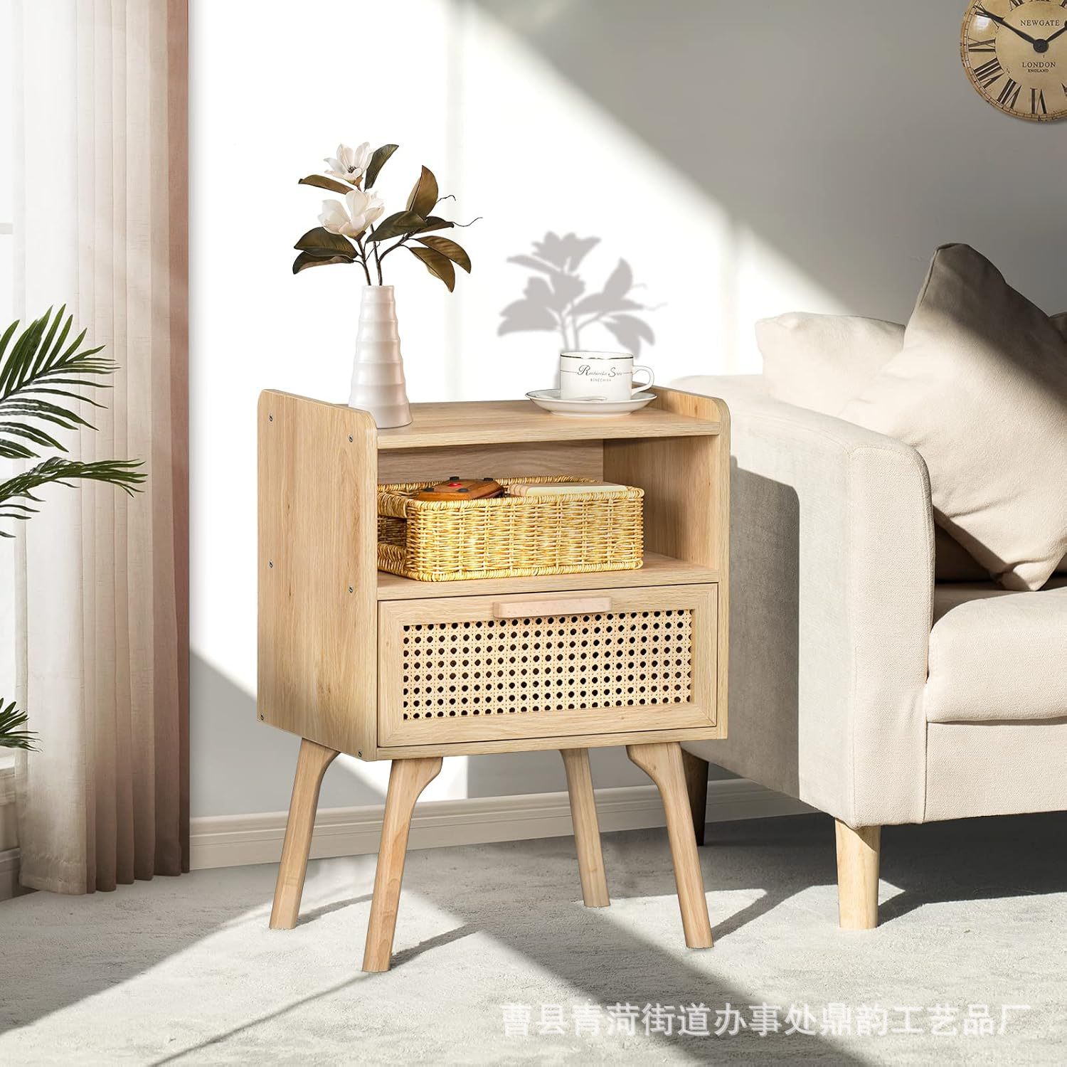 국경 간 목재 침대 옆 테이블 서랍이있는 보헤미안 사이드 테이블 오픈 선반 거실 다층 스토리지 테이블