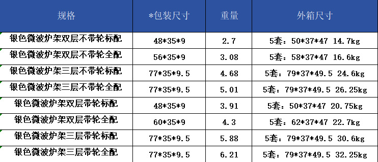 바퀴가 있는 3단 은색 전자레인지 랙이 표준으로 제공됩니다.