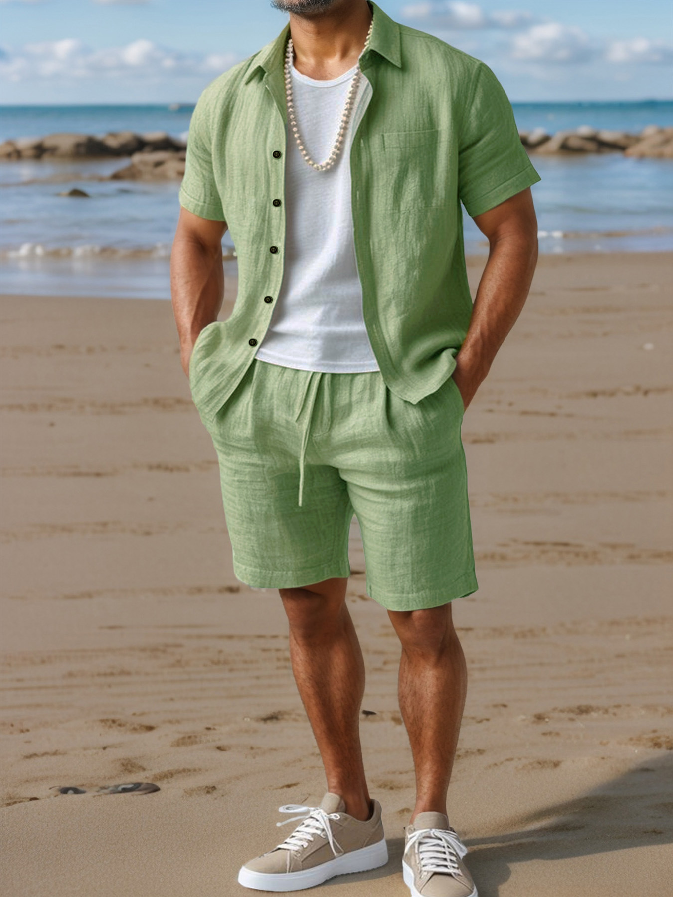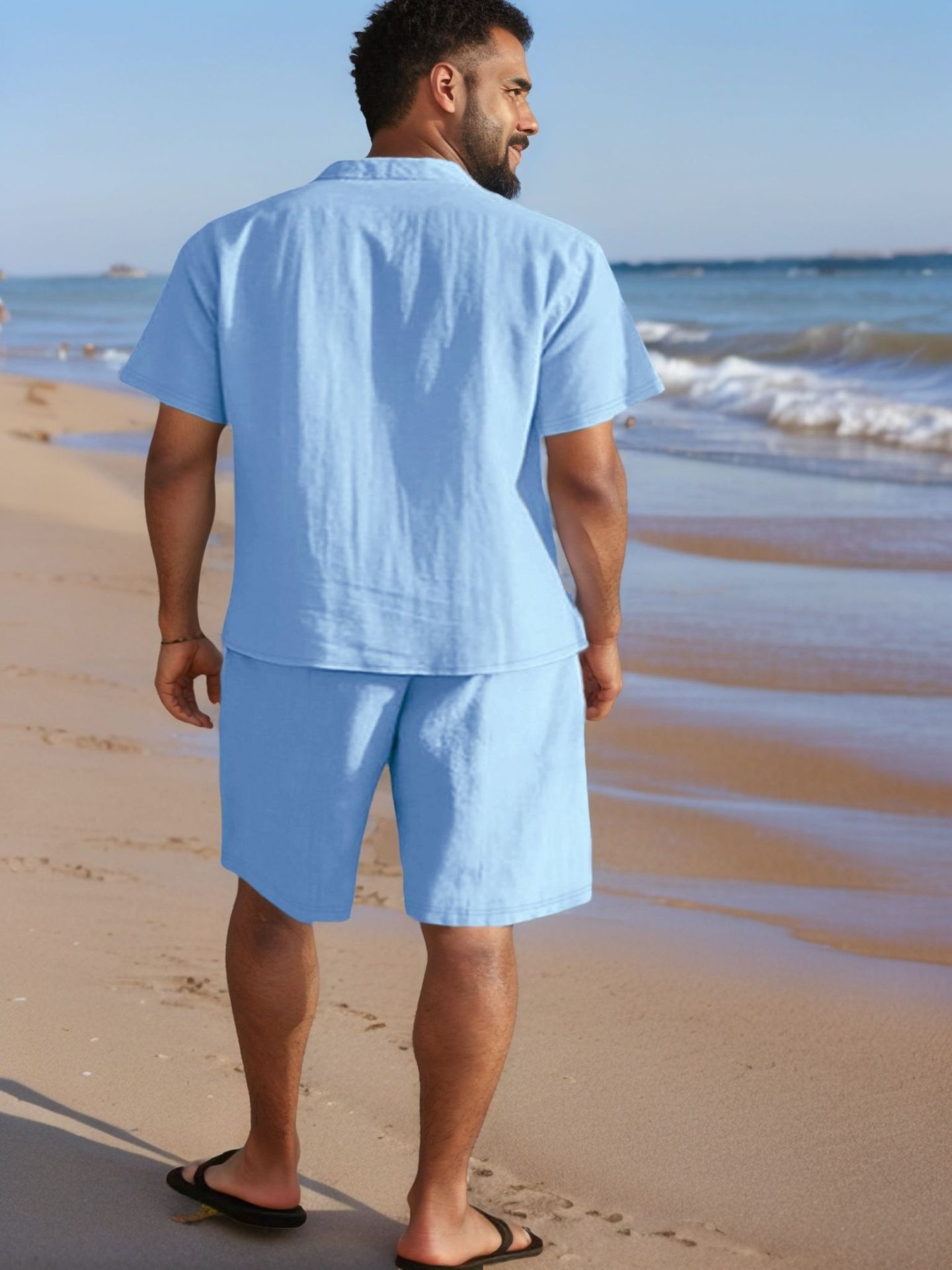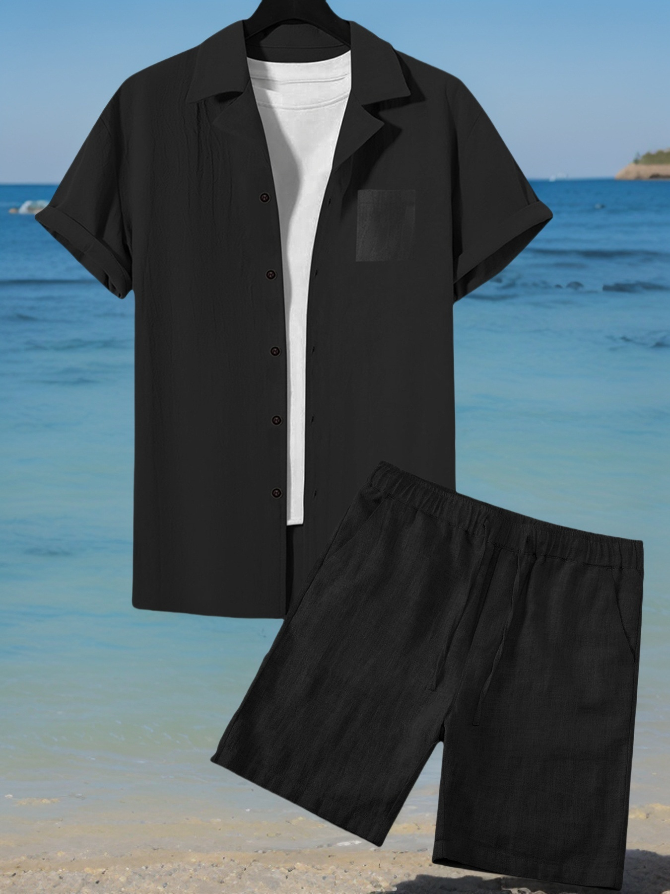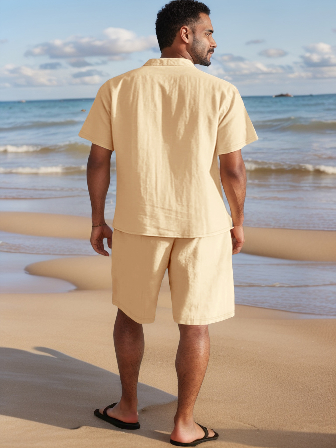 국경 간 유럽과 미국 남성 캐주얼 정장 리넨 느슨한 버튼 옷깃 셔츠 솔리드 컬러 야외 비치 바지 정장