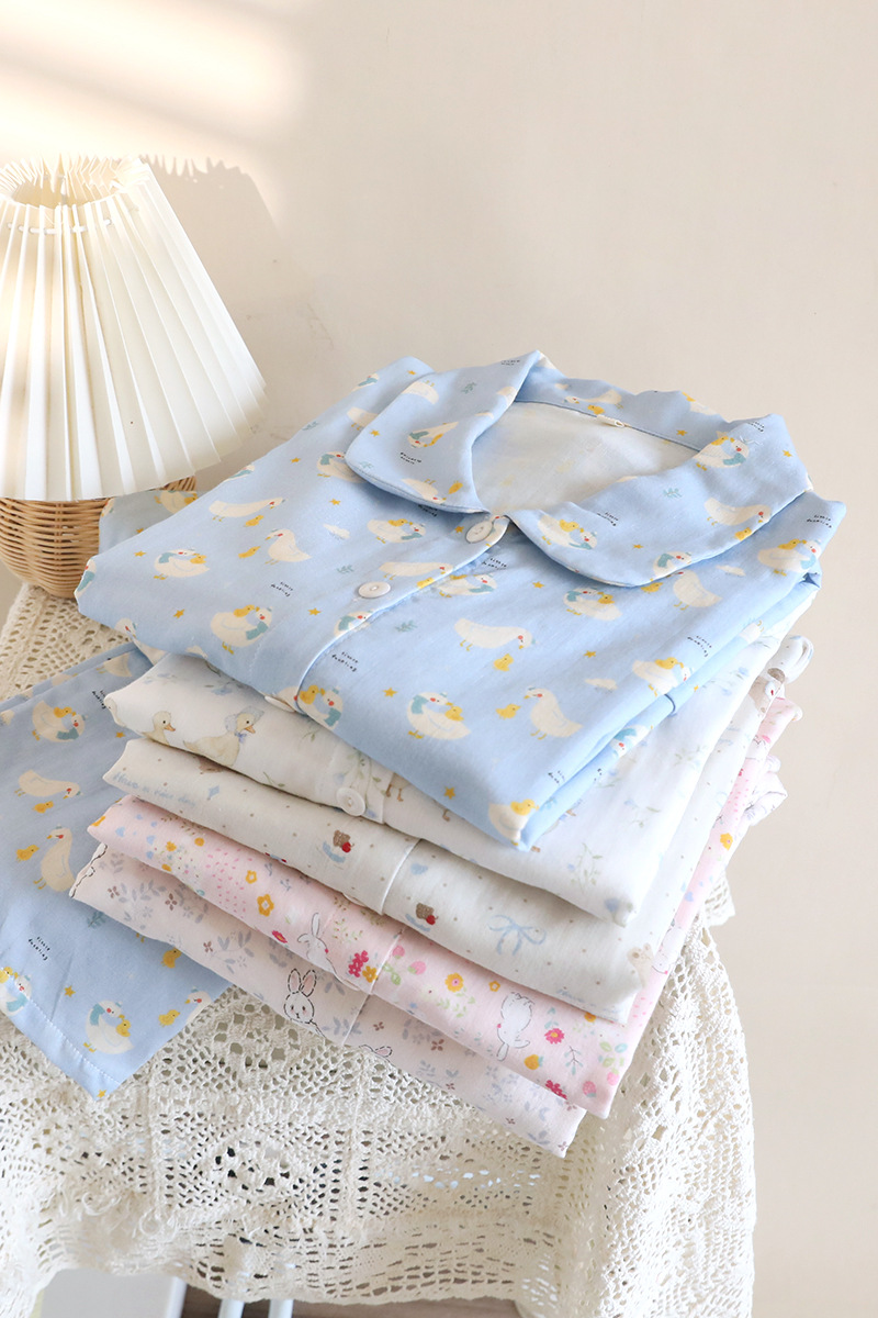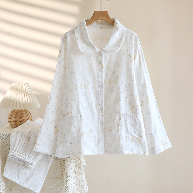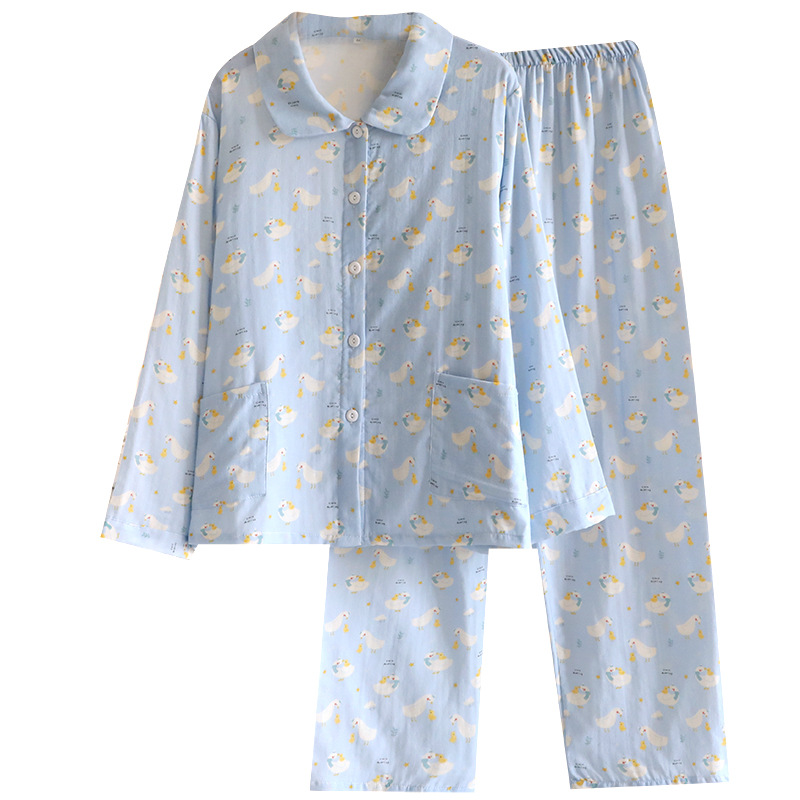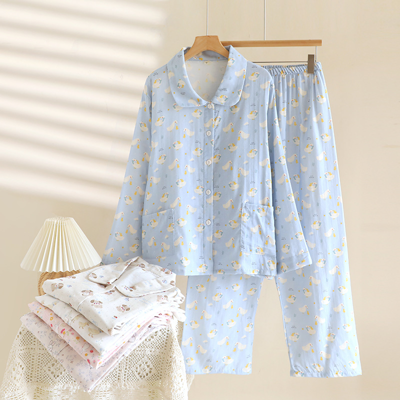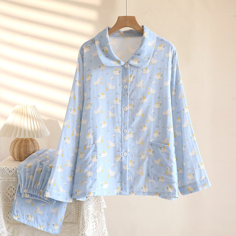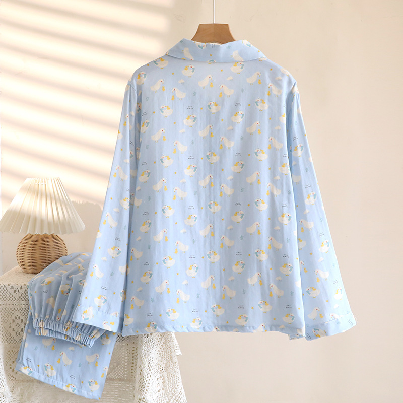 여성을위한 만화 흰색 거위 잠옷 봄, 가을, 여름 순수 코튼 거즈 긴팔 가정 의류 세트 얇은 에어컨 룸