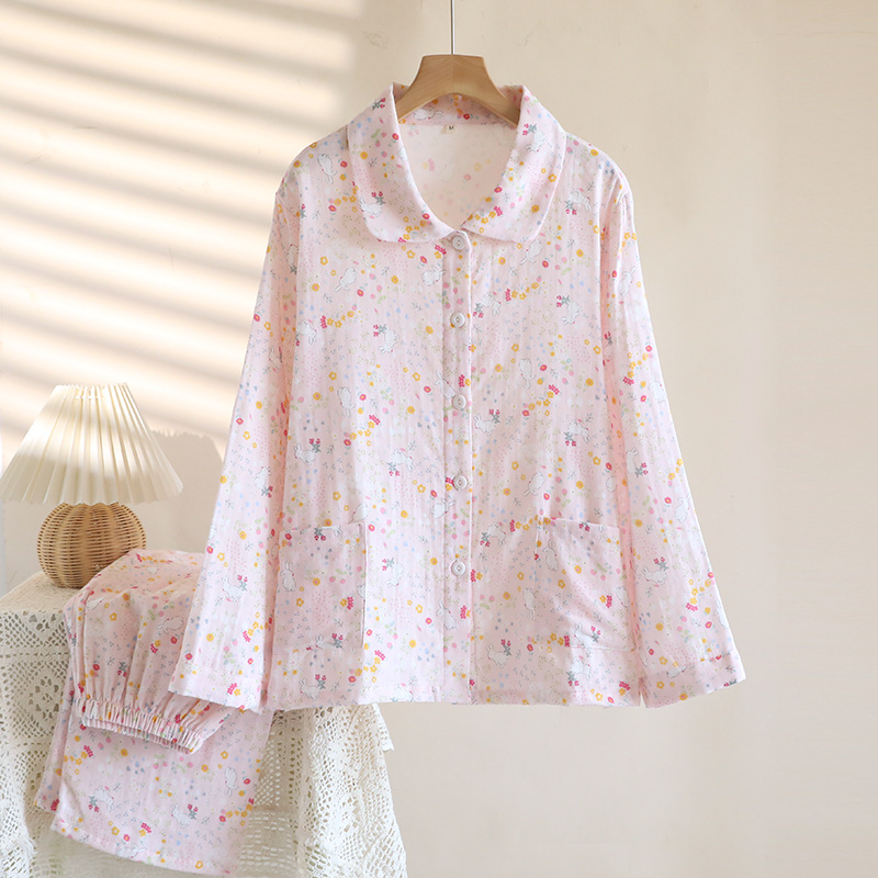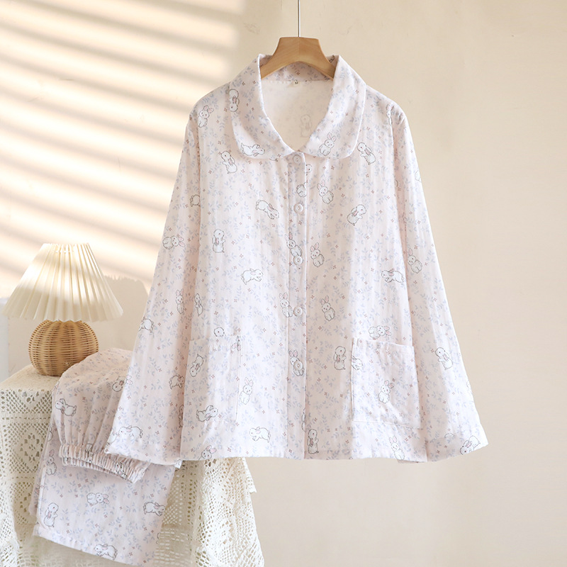 반짝이 꽃 토끼 - 긴팔 거즈 홈웨어 세트