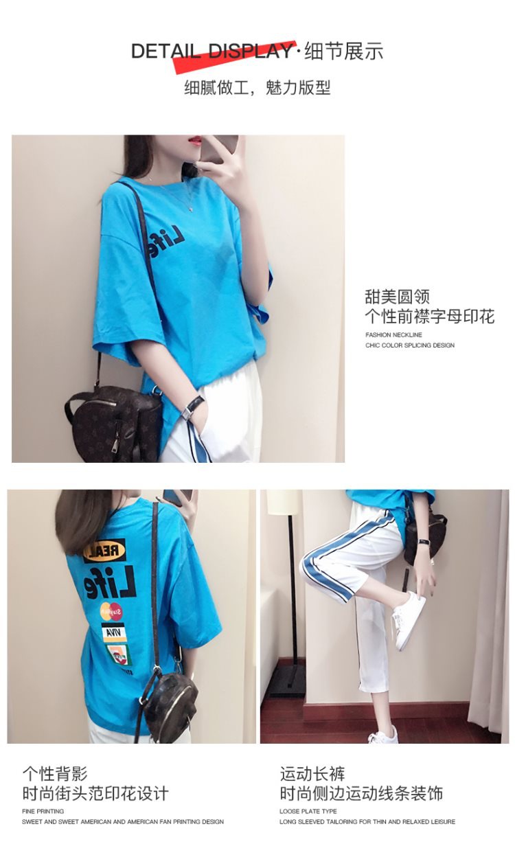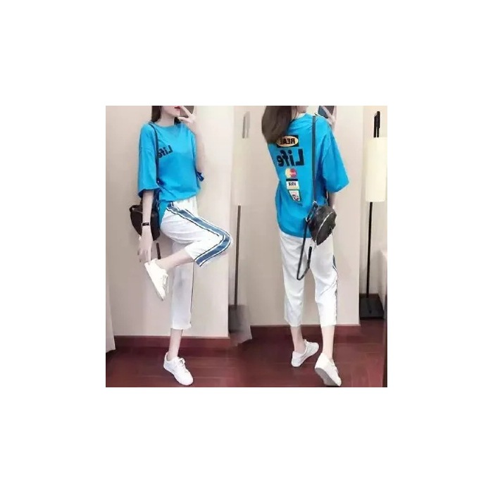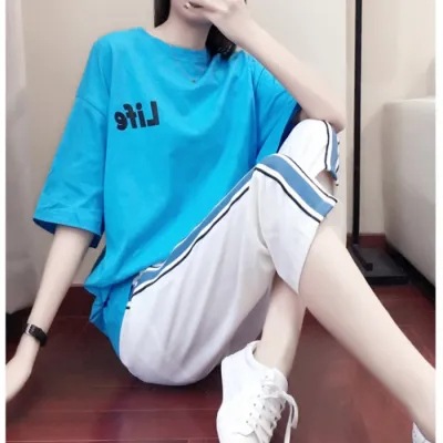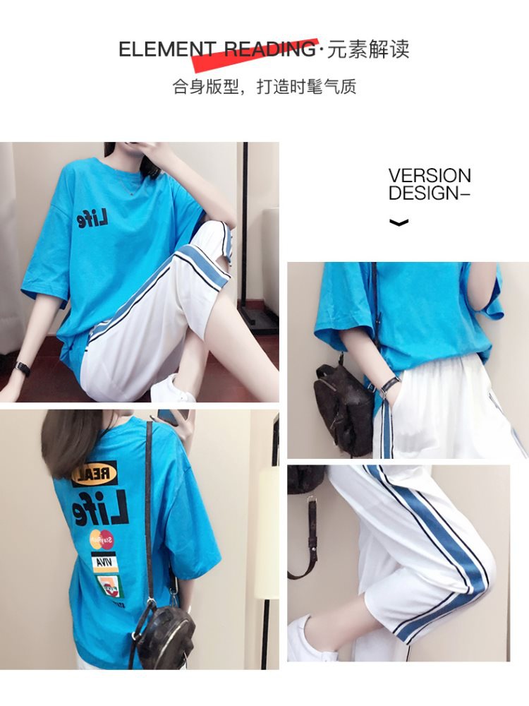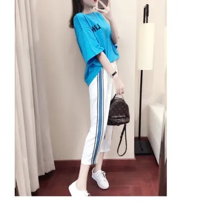 배송된 9부 팬츠 캐주얼 스포츠 슈트 여성 반팔 티셔츠 2025 여름 패션 투피스 세트 트렌디