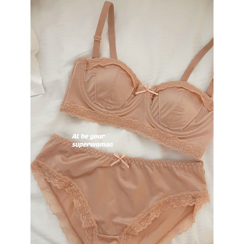 프렌치 크리미 스위트 살구 레이스 속옷 세트 여성용 브라 실키 글로시 심리스 언더와이어 푸쉬업 세트