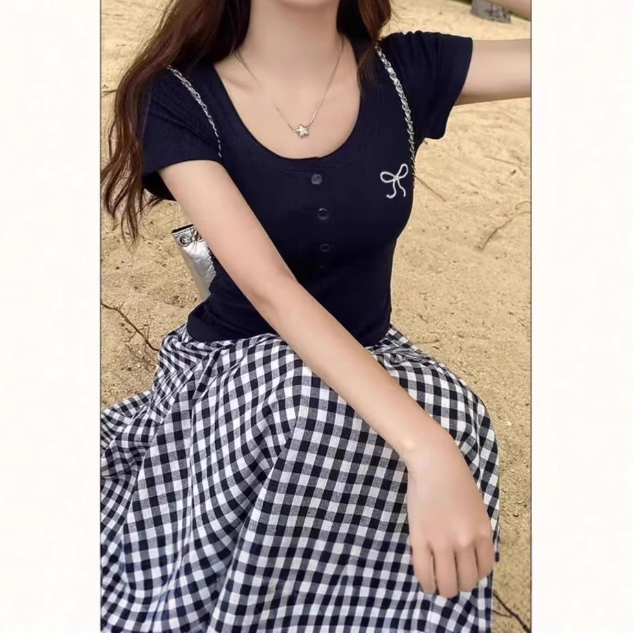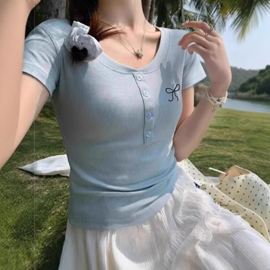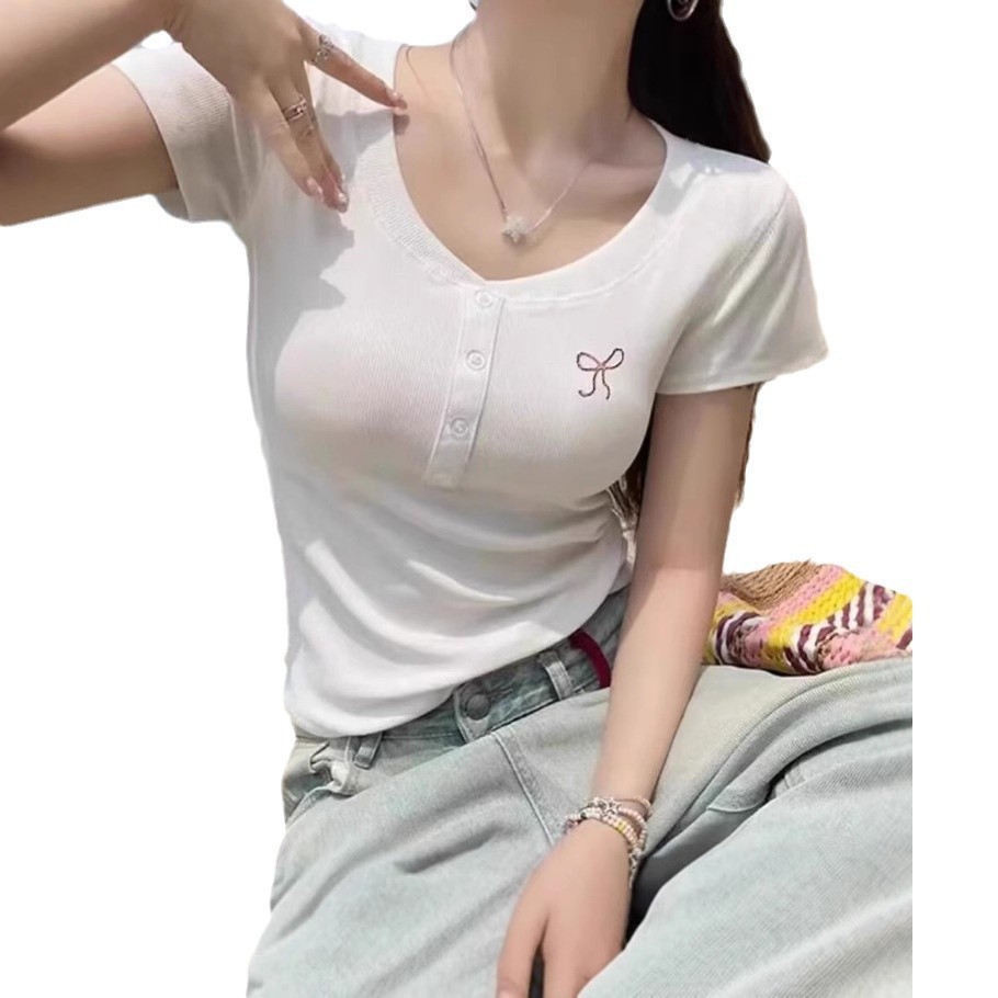 한국 스타일 핫걸 퓨어 디자이어 보우 자수 브이넥 반팔 티셔츠 여성 슬림 여름 반팔 탑 바텀 셔츠