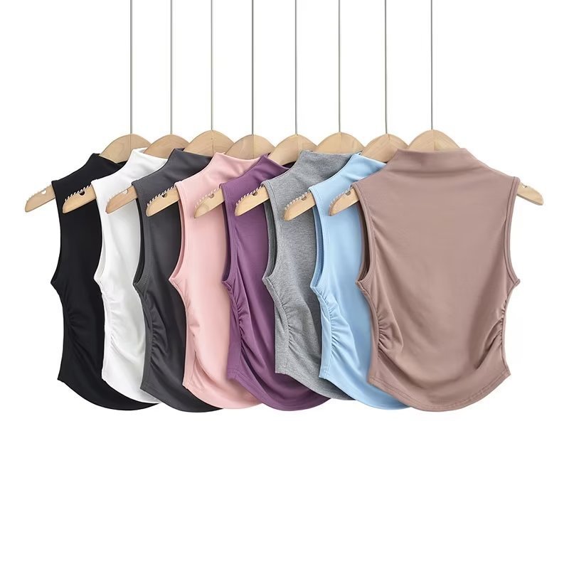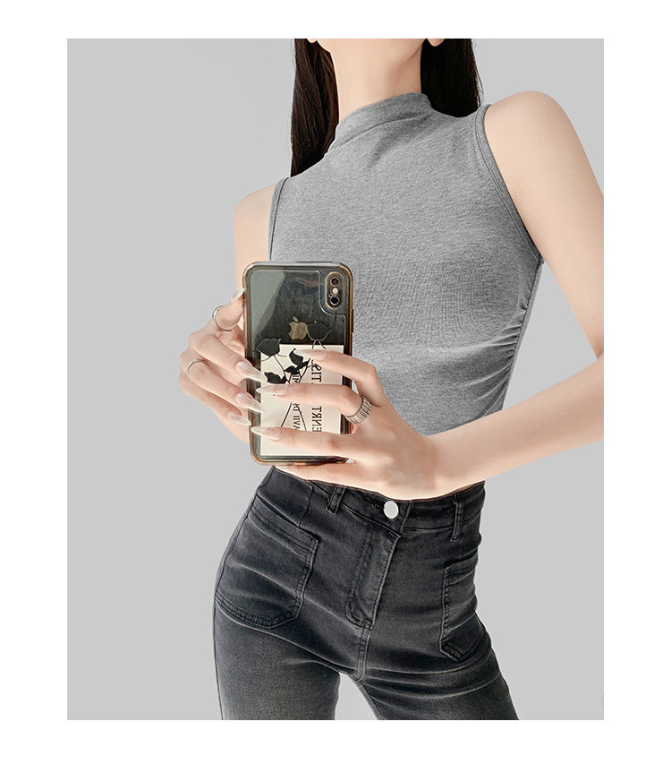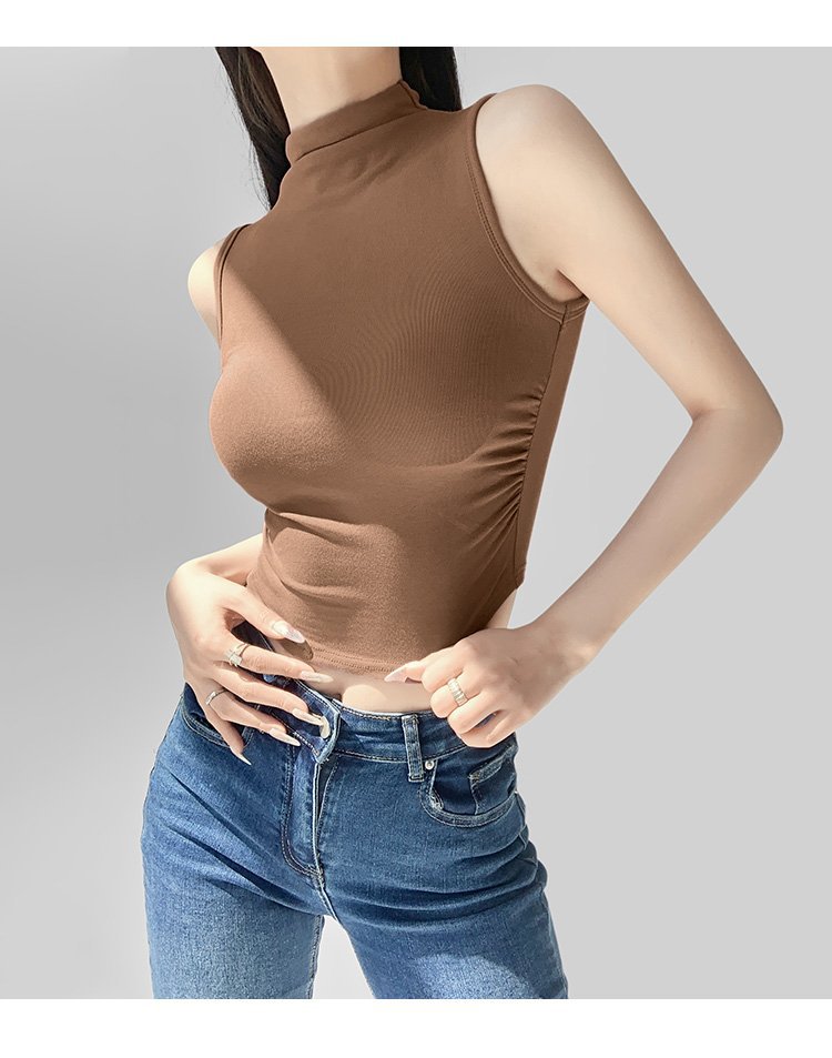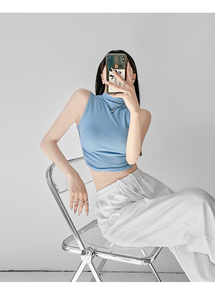 허리 신상 하이넥 디자인 민소매 조끼 여성용 하의 서스펜더 스타일 Xia Xia American 티셔츠 핫 소녀 솔리드 컬러 주름