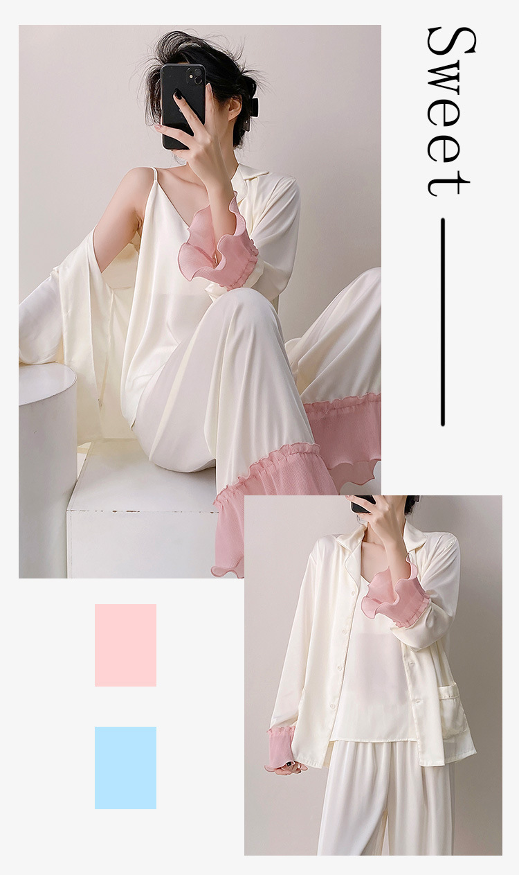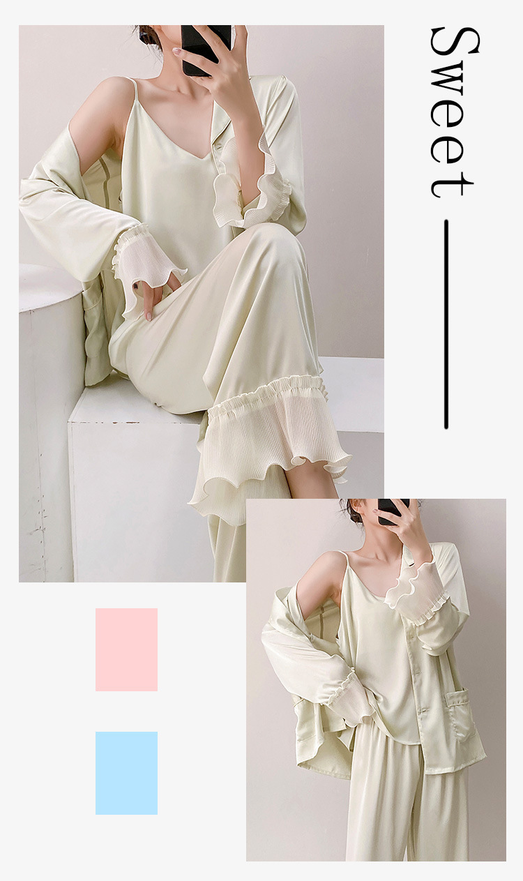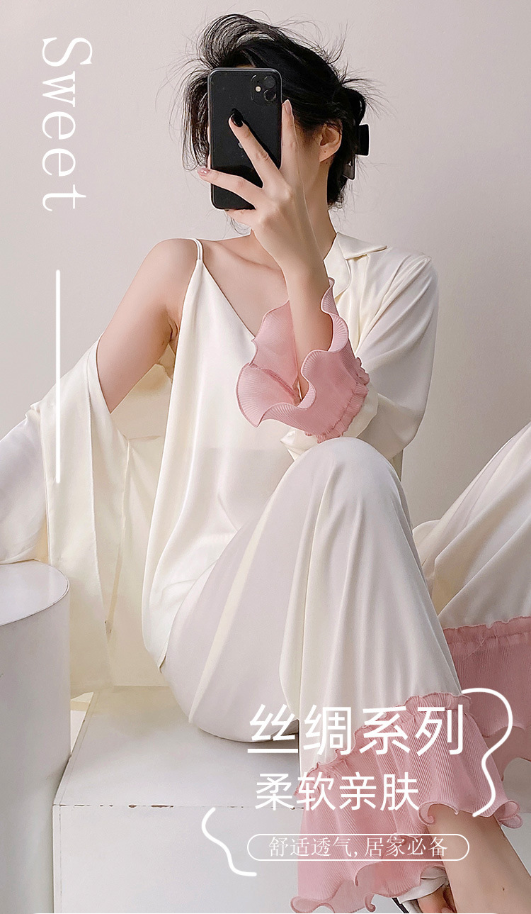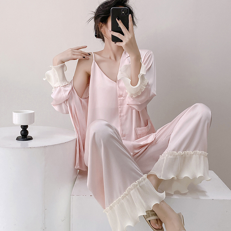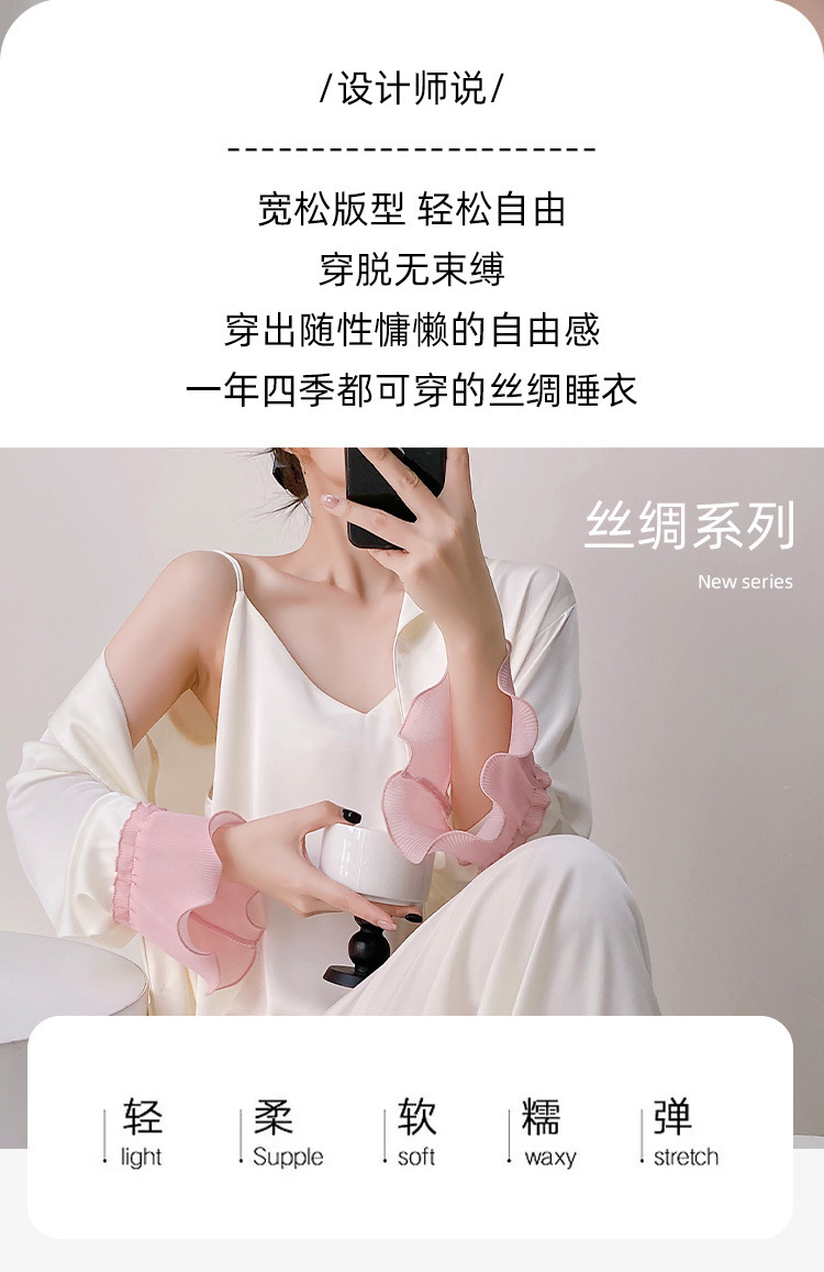 여성용 실크 잠옷 얇은 25 새로운 긴팔 볼록 방지 3 피스 세트 간단하고 달콤한 여름 얼음 실크 홈웨어 외부에서 착용 가능