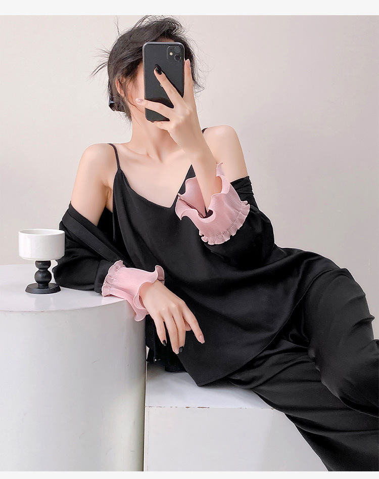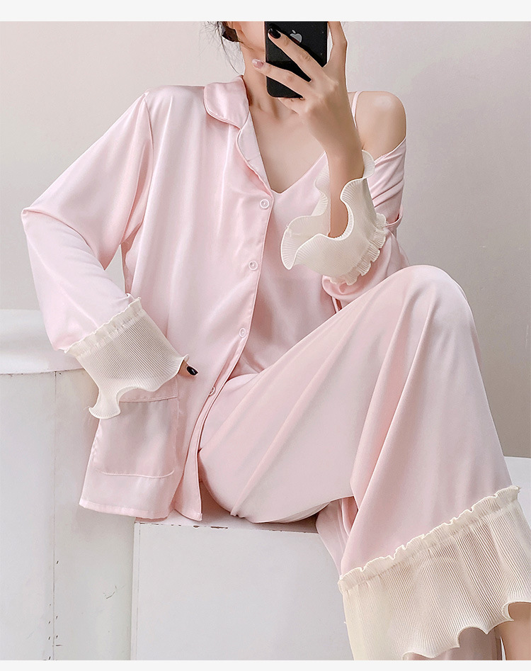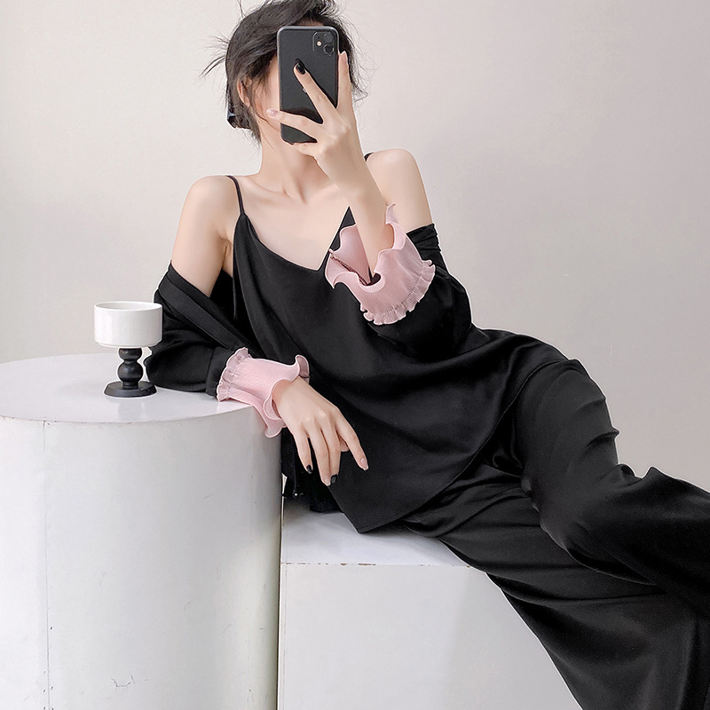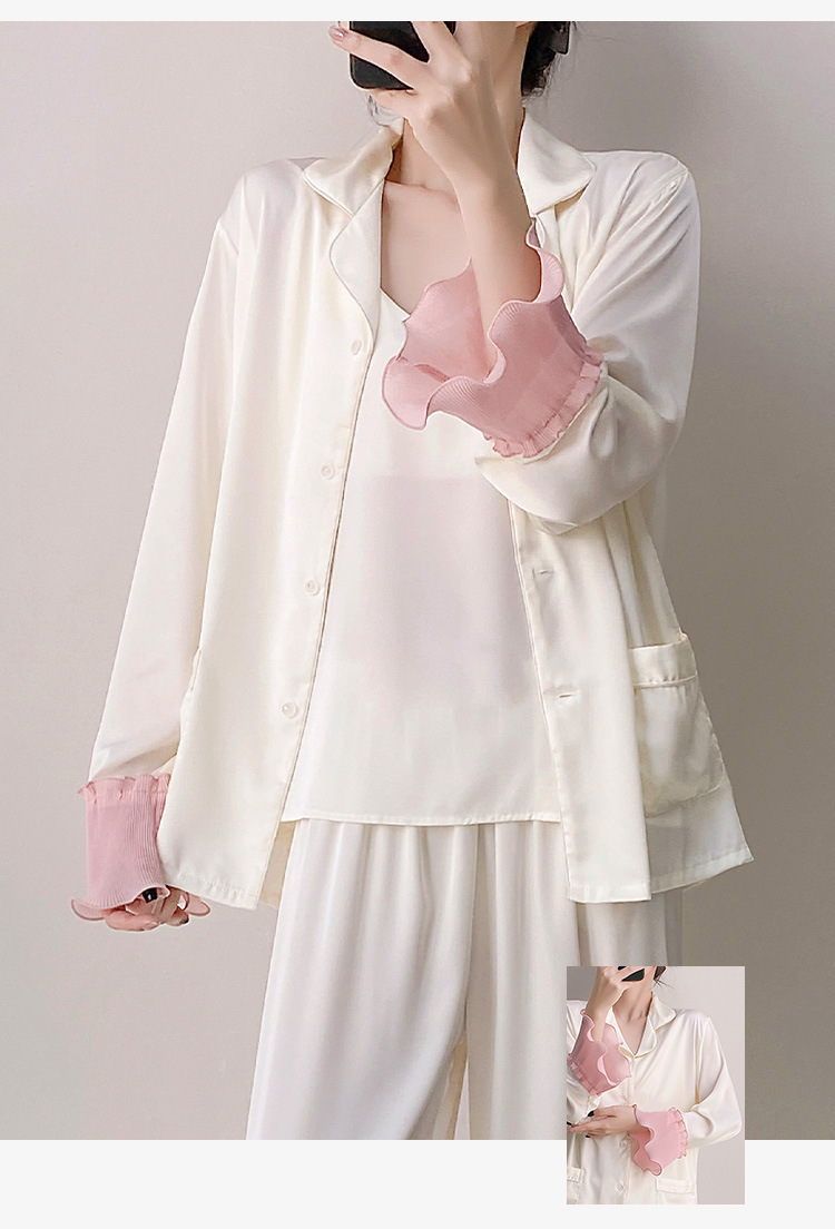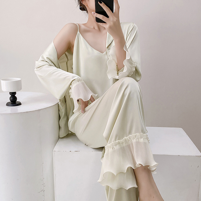 여성용 실크 잠옷 얇은 25 새로운 긴팔 볼록 방지 3 피스 세트 간단하고 달콤한 여름 얼음 실크 홈웨어 외부에서 착용 가능