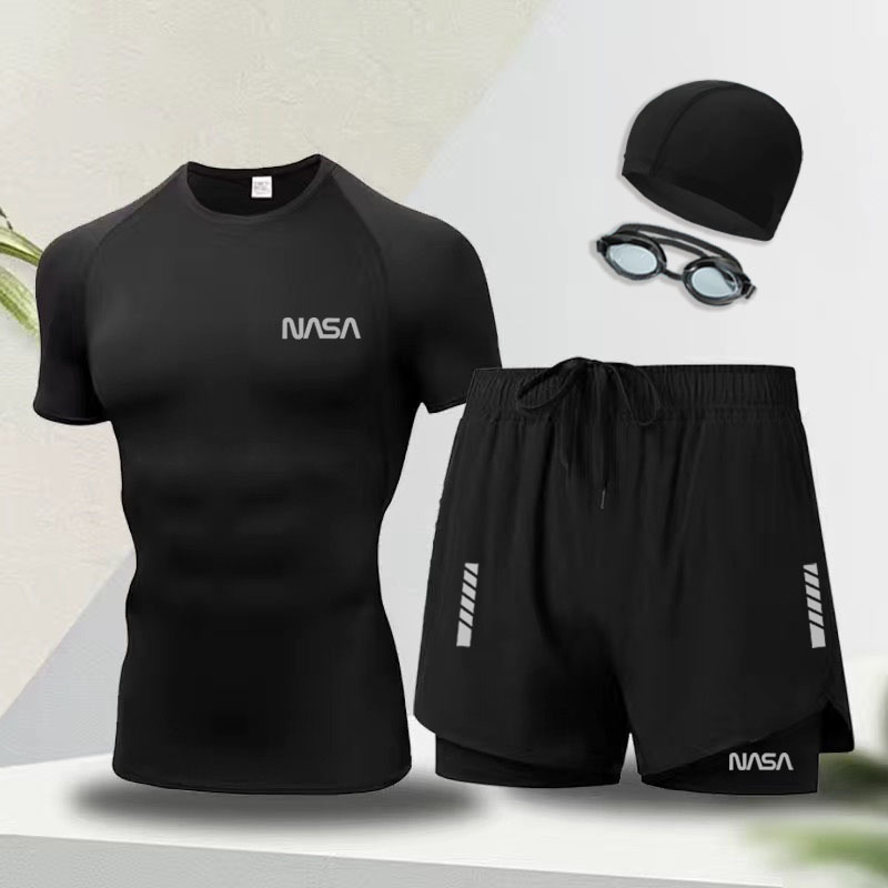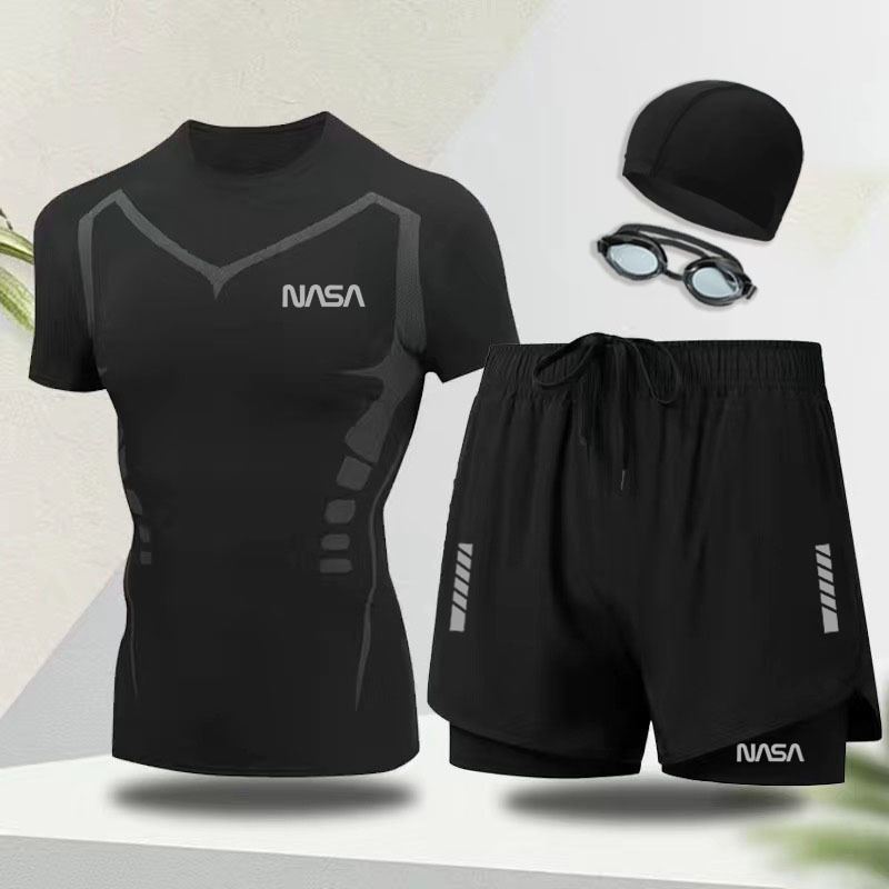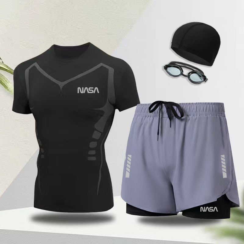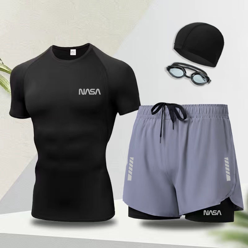 수영복 남성용 전신 수영복, 수영모, 수영 고글, 3종 세트, 속건성, 당황 방지, 노출 방지, 온천 비치 팬츠