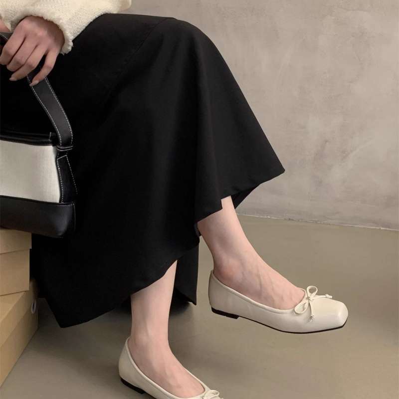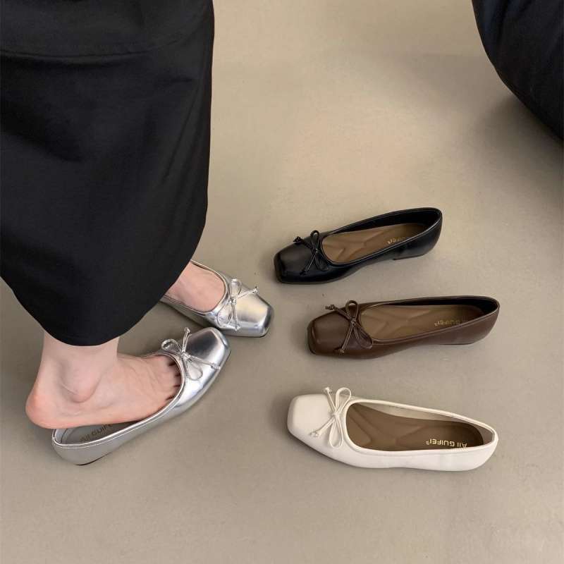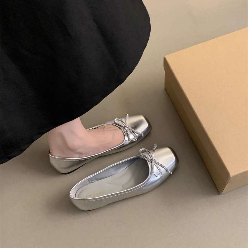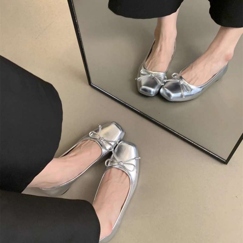 여성을위한 요정 스타일 부드러운 신발 2025 봄 새로운 스타일 나비 매듭 스퀘어 토 플랫 슈즈 실버 펌프스 비니 슈즈
