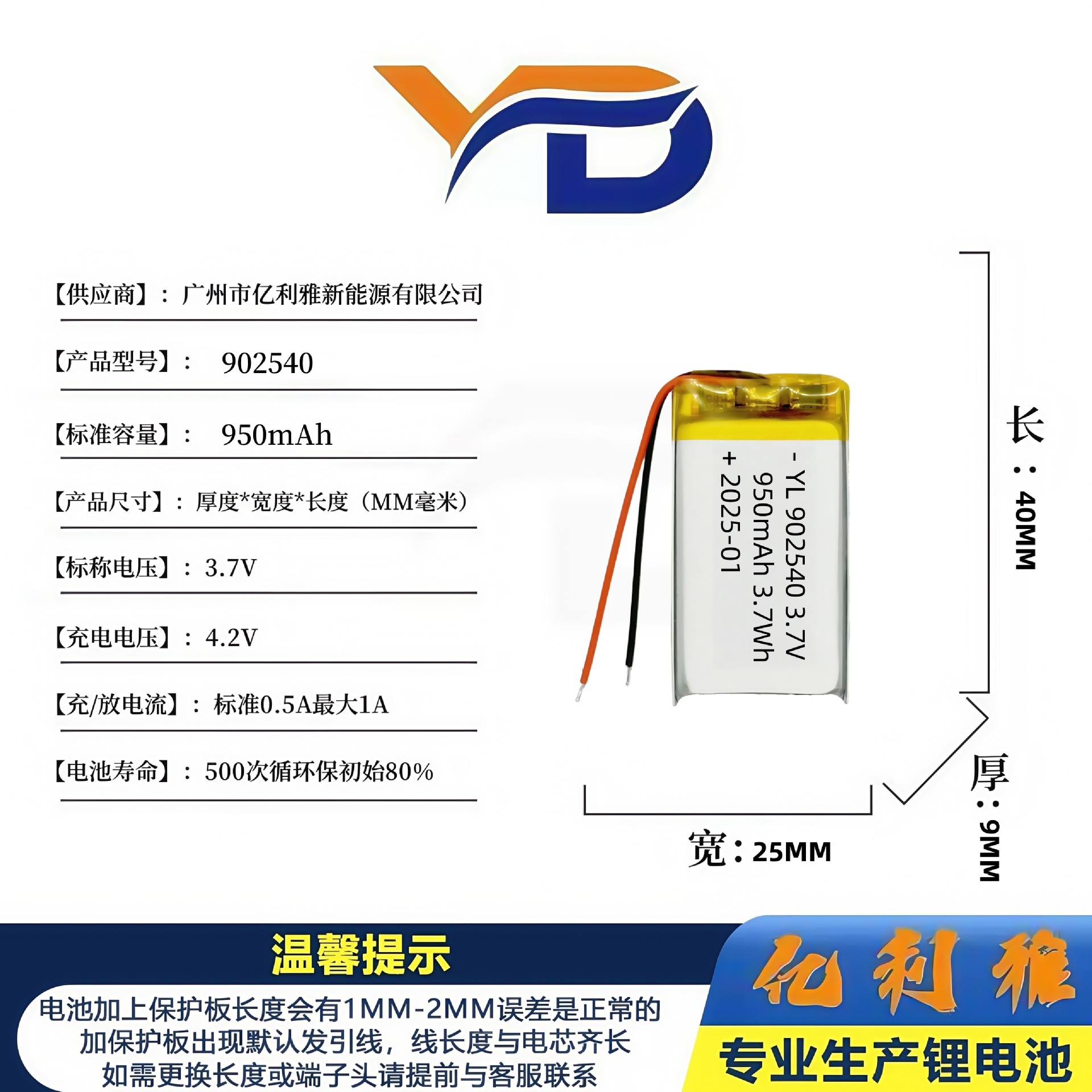 902540聚合物锂电池 950mAh电动玩具空气净化器无人机美容仪3.7V