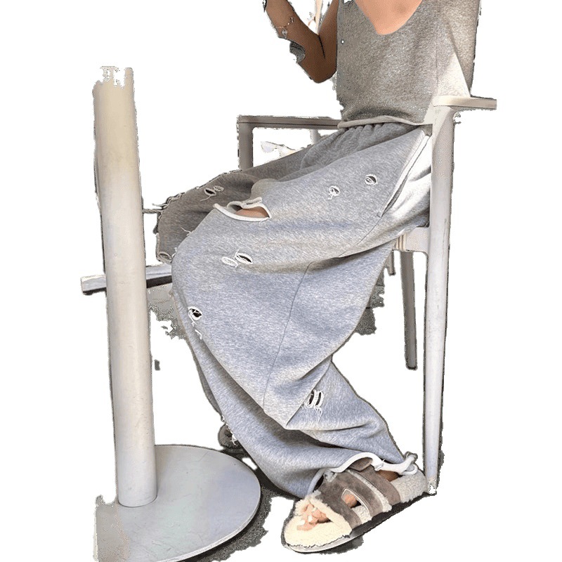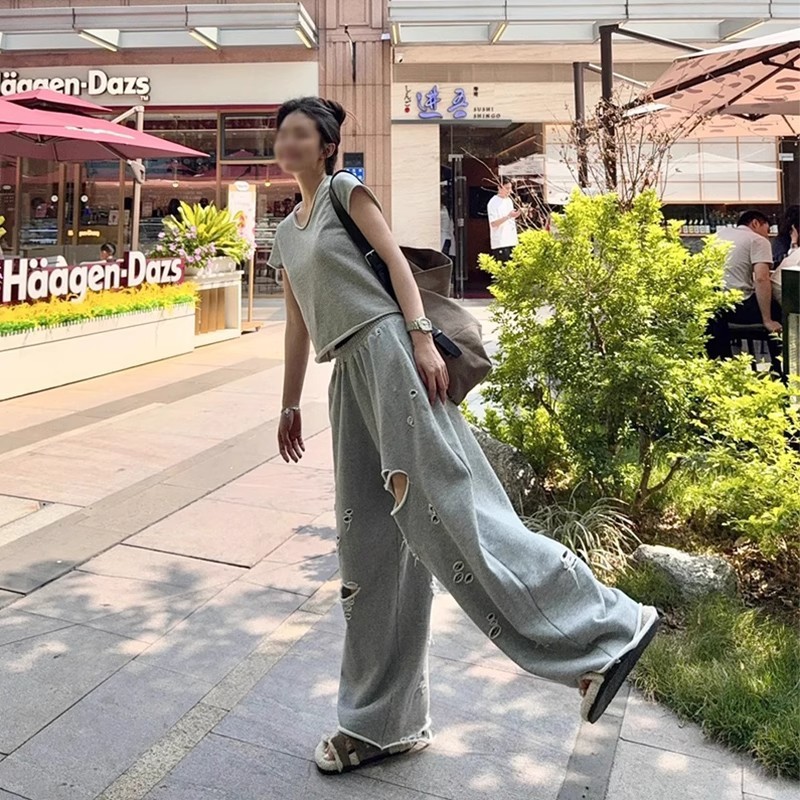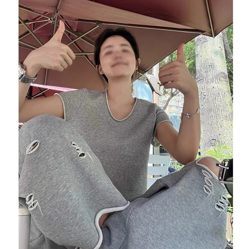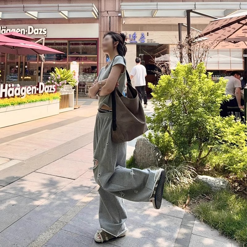 불규칙한 디자인, 찢어진 컬링 캐주얼 스포츠 슈트, 여성 여름 신작 반팔 와이드 팬츠, 패셔너블한 투피스 세트